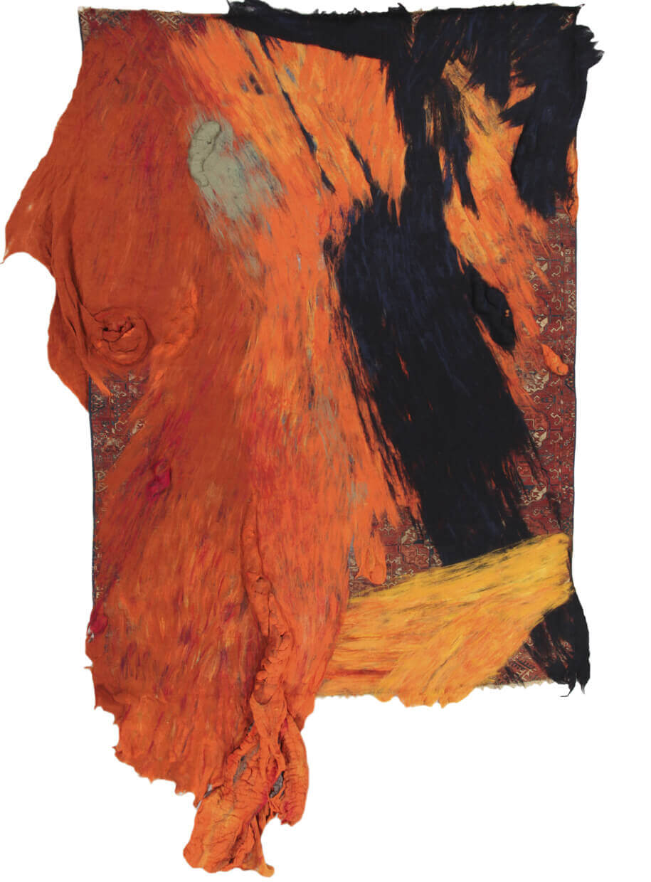 “The original idea came about from a collection of antique Persian rugs that I acquired from an estate sale of the prior owner of my current studio, Pat Passlof, an abstract expressionist painter. With several of these lying around, I began to study them and became fascinated with the history of the Persian carpets and how the identity of rulers, regions, towns and even nomadic tribes were linked to the unique variations in patterns, colors, and weaving techniques evident in the carpets. So I began an extemporaneous process of applying, layering and infusing vibrant wool fibers on the traditional hand knotted carpet sort of like the ductus of a painter’s palette knife and brush on a canvas creating movements and textures of clotted, caked sculptural surfaces.”