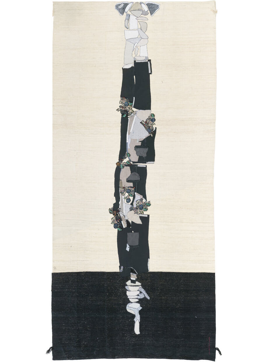 Kilim afgano intrecciato a mano in lana con ricamo originale realizzato nell’atelier Antonio Marras in Sardegna. Solo i tre colori base – nero, bordeaux, ecrù – sono stati concordati. Su questi kilim Marras ha lavorato come se fossero delle tele; ma, invece di dipingerle, vi ha appoggiato dei frammenti, ?delle idee?, che poi delle abilissime ricamatrici di Bitti, un borgo della Barbagia, hanno fissato a mano, punto per punto. I “frammenti” che lo stilista ha impiegato sono, racconta egli stesso, ?gli interni delle giacche, le fodere: le tele che rivestono e rinforzano le strutture dei miei abiti. Ho lavorato con il dentro, con i pezzi di risulta, con quanto di solito è destinato a essere buttato, annullato, e che invece ho ripreso e rimesso a posto, rimodellato, riassestato.?