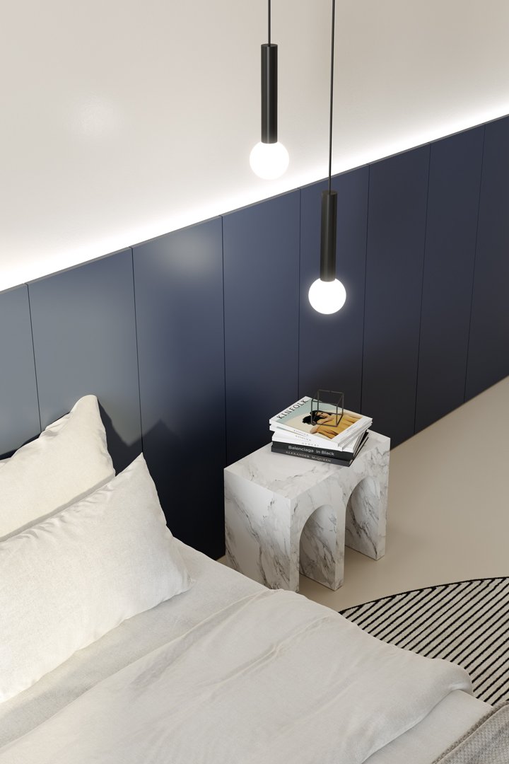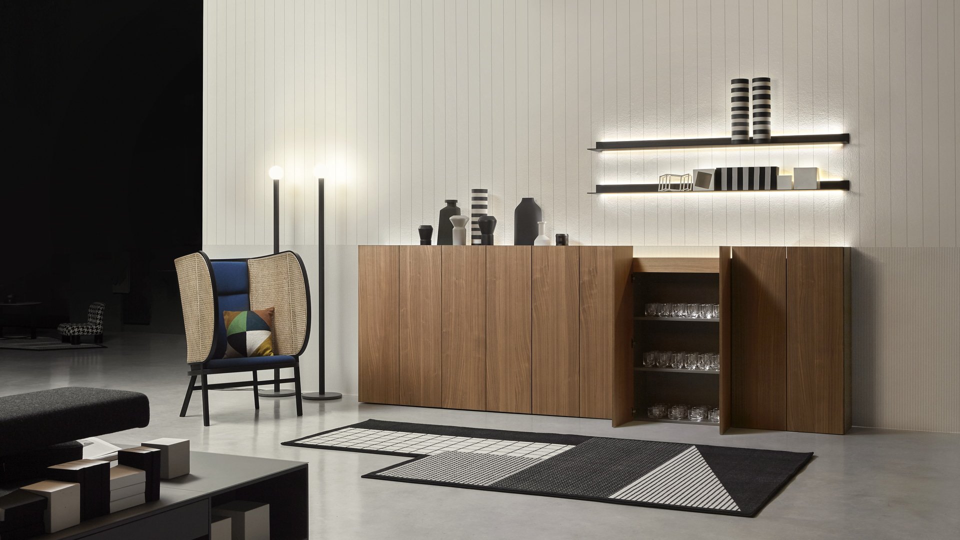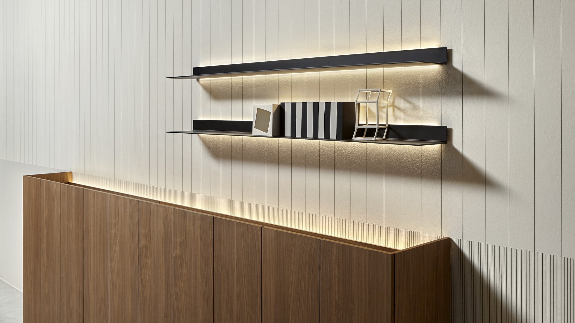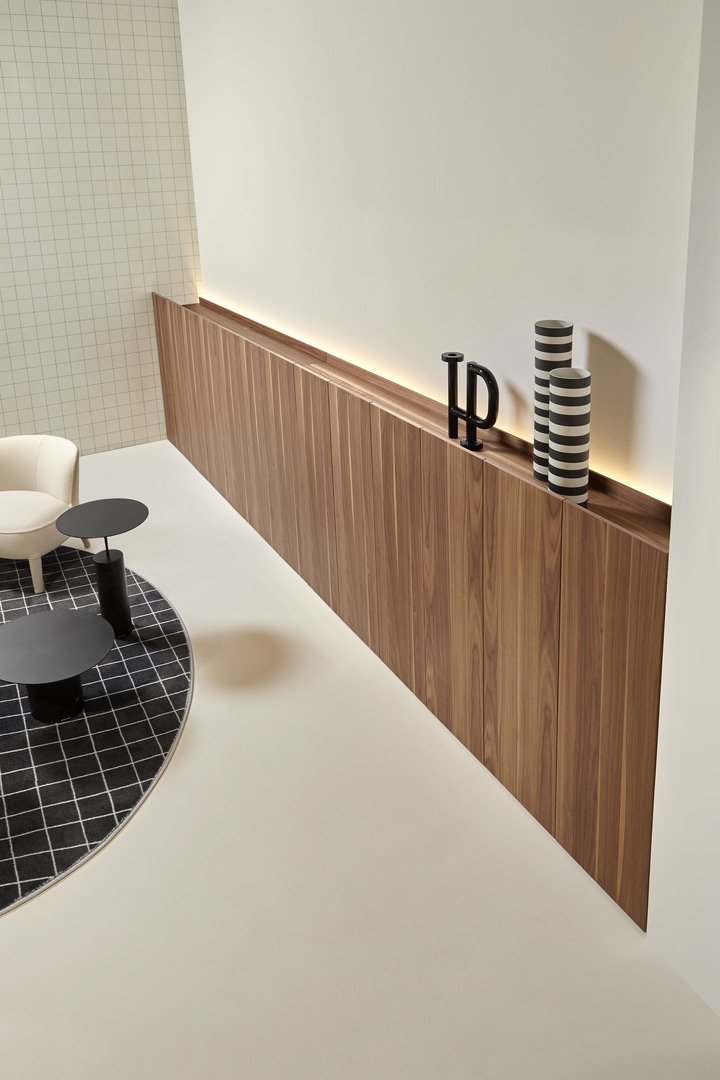 Una quinta scenica che si accosta alla parete sovrapponendovi una superficie in legno in diverse essenze o laccata, un fronte elegante e continuo interrotto unicamente da tagli verticali che ne segnano la modularità. Il mobile offre anche un pratico piano d’appoggio nascosto dall’altezza delle ante che sporgono e lo schermano alla vista. Piano d’appoggio che viene duplicato attraverso il posizionamento di una mensola/contenitore in legno che accoglie gli oggetti e integra un’illuminazione a LED.