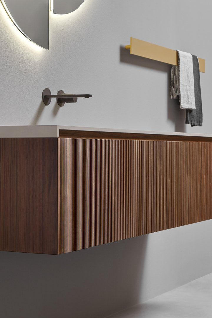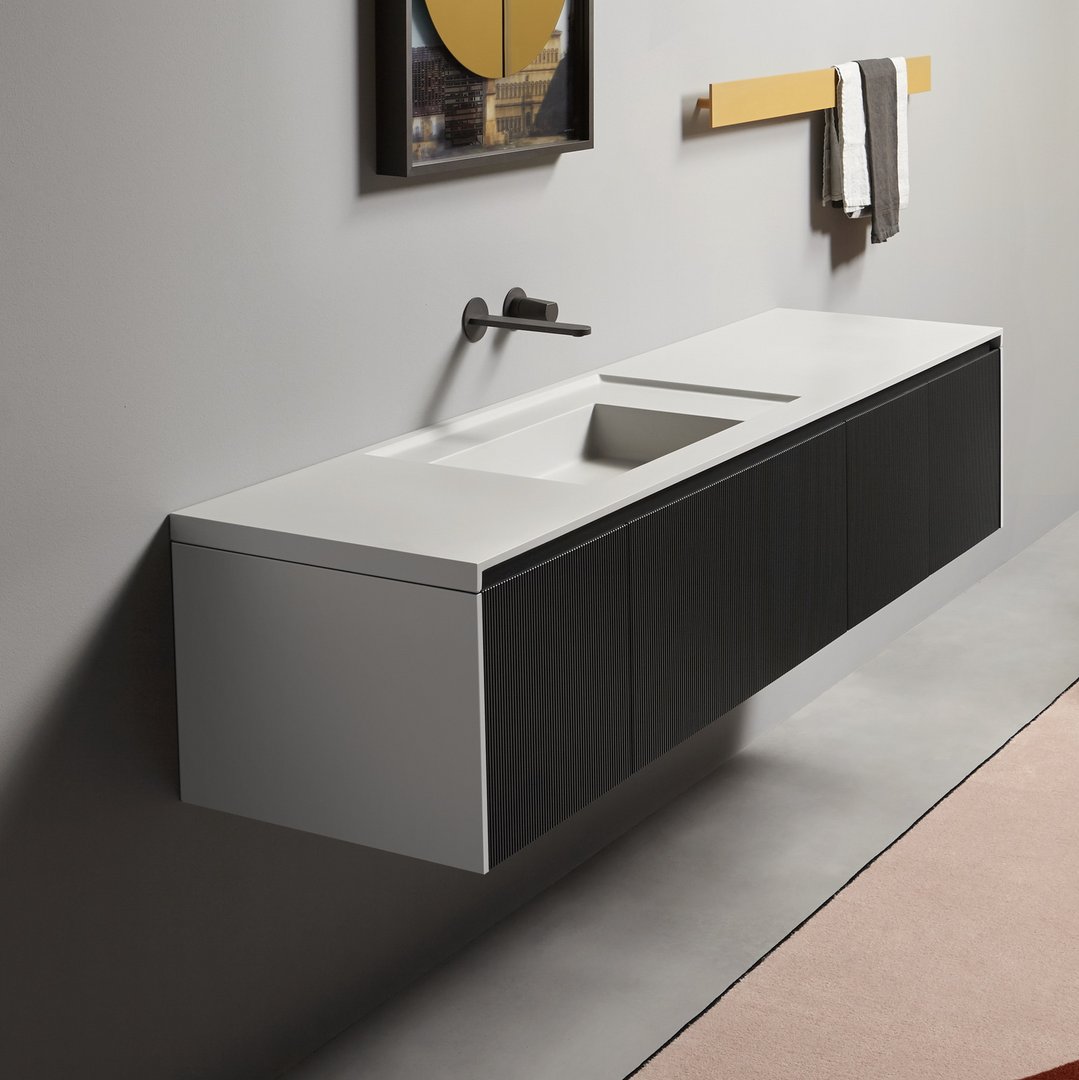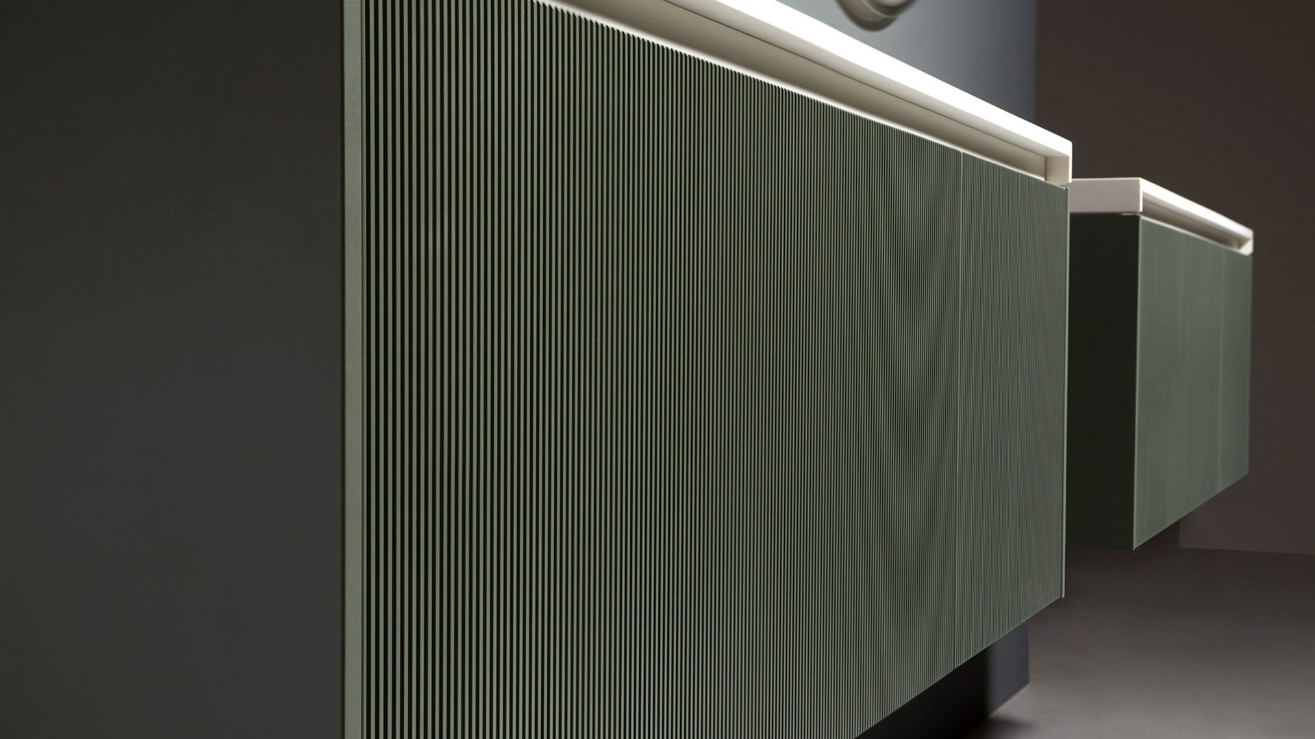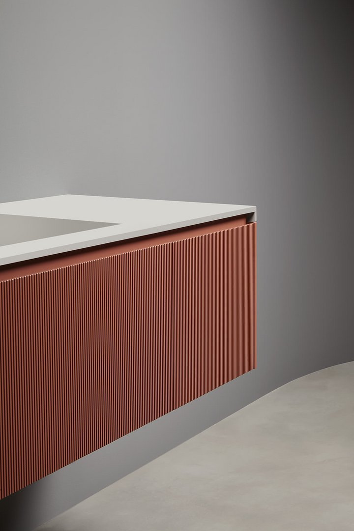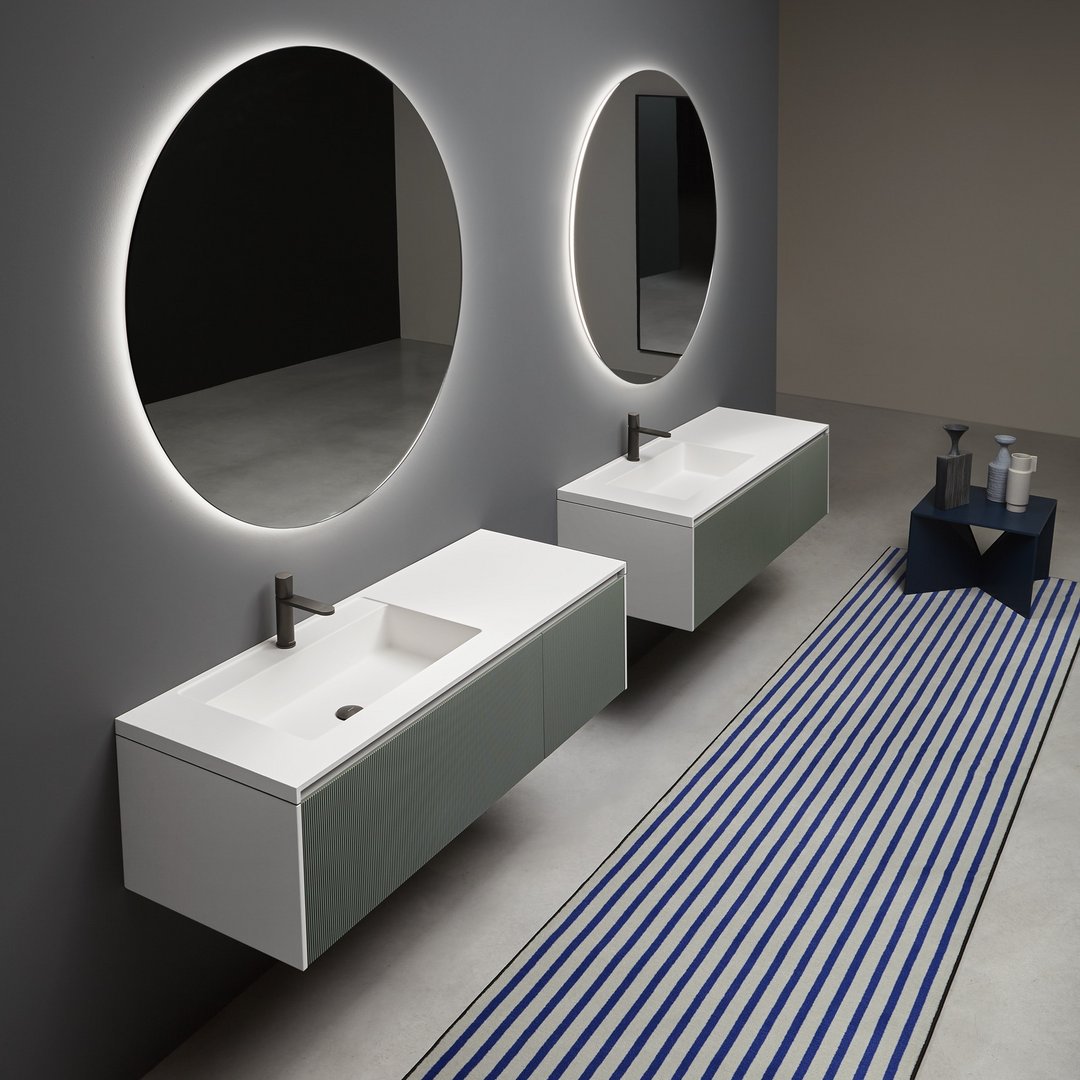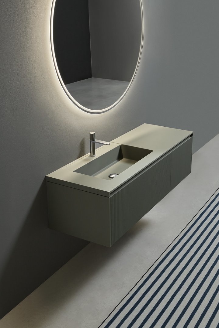 Una collezione di mobili dall’immagine essenziale e dalle linee pulite com’è nello stile di antoniolupi, ma con un segno grafico importante che diventa decoro geometrico per esaltare la matericità delle superfici e valorizzare il volume dei contenitori. Linee parallele come binari incidono i frontali dell’anta e dei fianchi, conferendo tridimensionalità alla superficie e vestendo il mobile con una “plissettatura” che ne alleggerisce visivamente l’immagine. Distanziate tra loro di 3 mm in Binario 03 e 12 mm in Binario 12, le fresature scandiscono lo sviluppo longitudinale del contenitore, opponendo una traccia verticale molto fitta che “misura” la proporzione dell’anta, arricchendo di significato l’intero progetto. Binario 03 è disponibile sia nella versione in essenza legno che in quella laccata in finitura goffrata o seta in tutti i colori dell’ampia gamma antoniolupi.