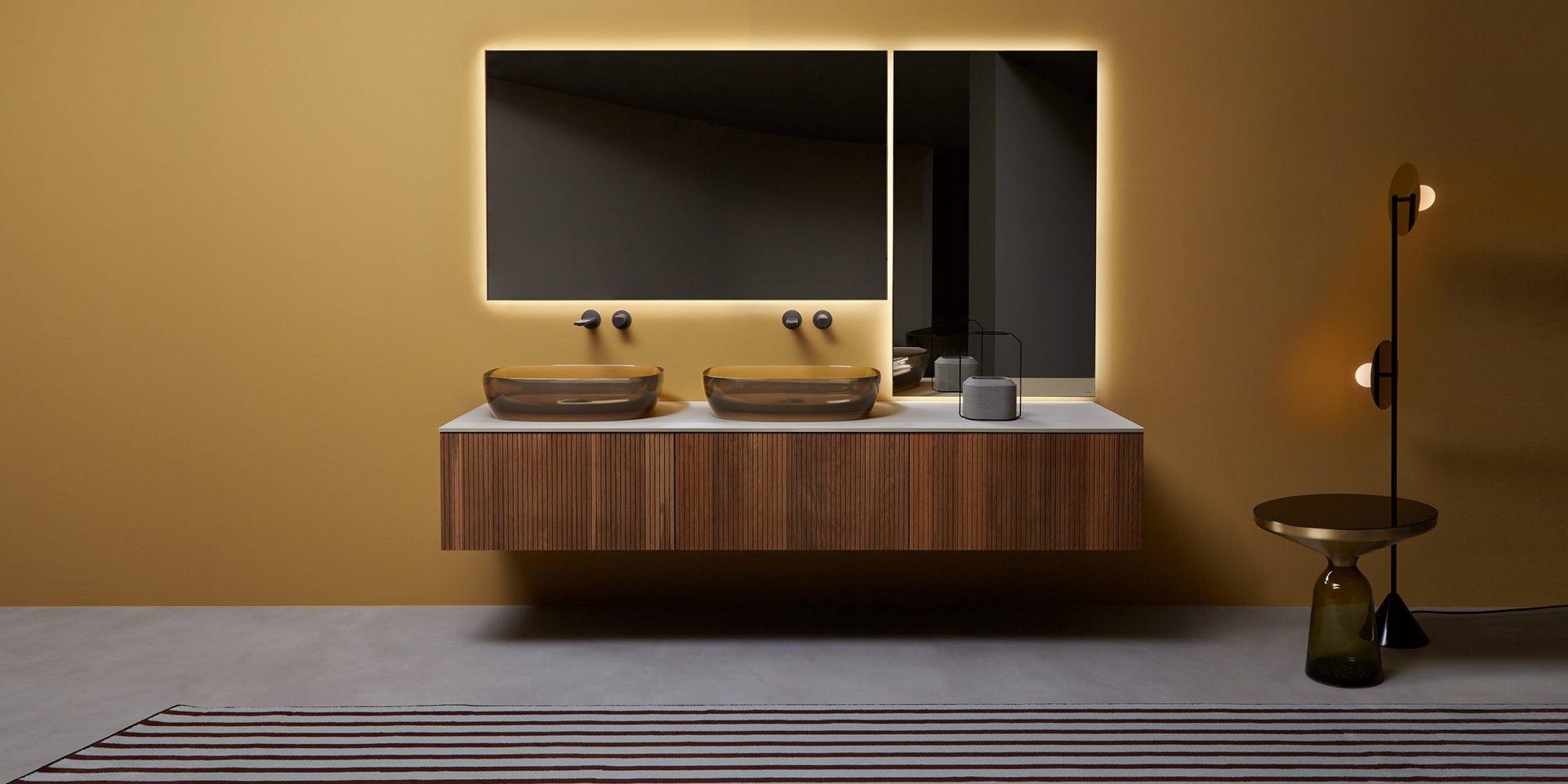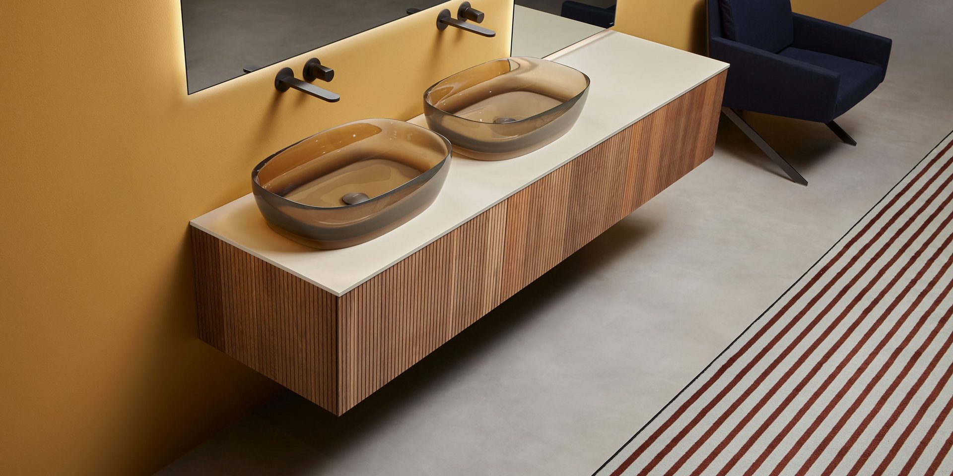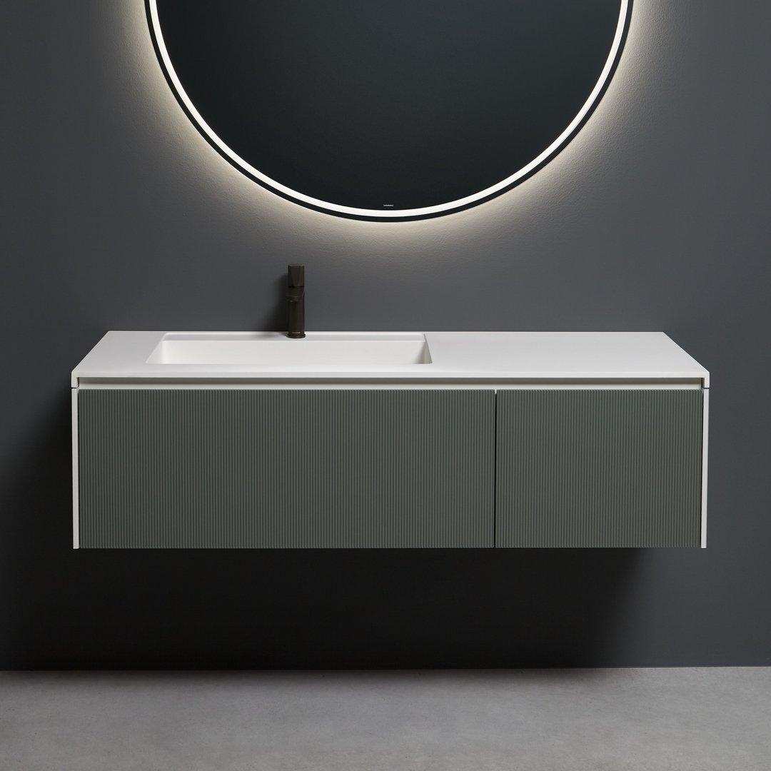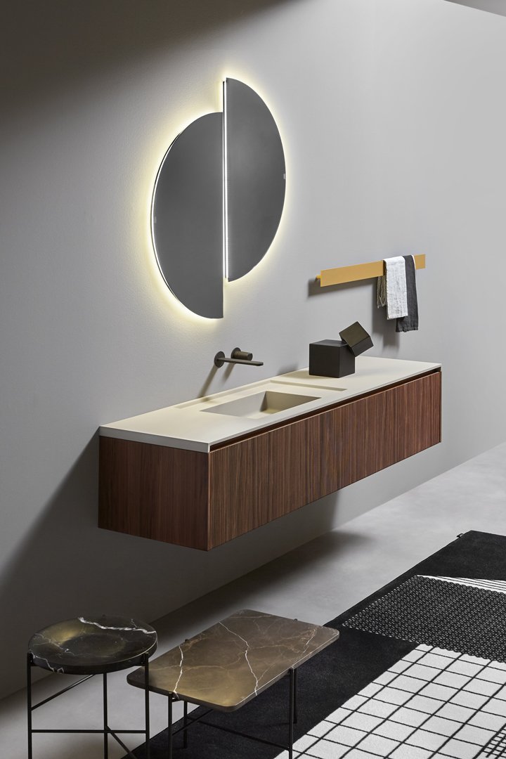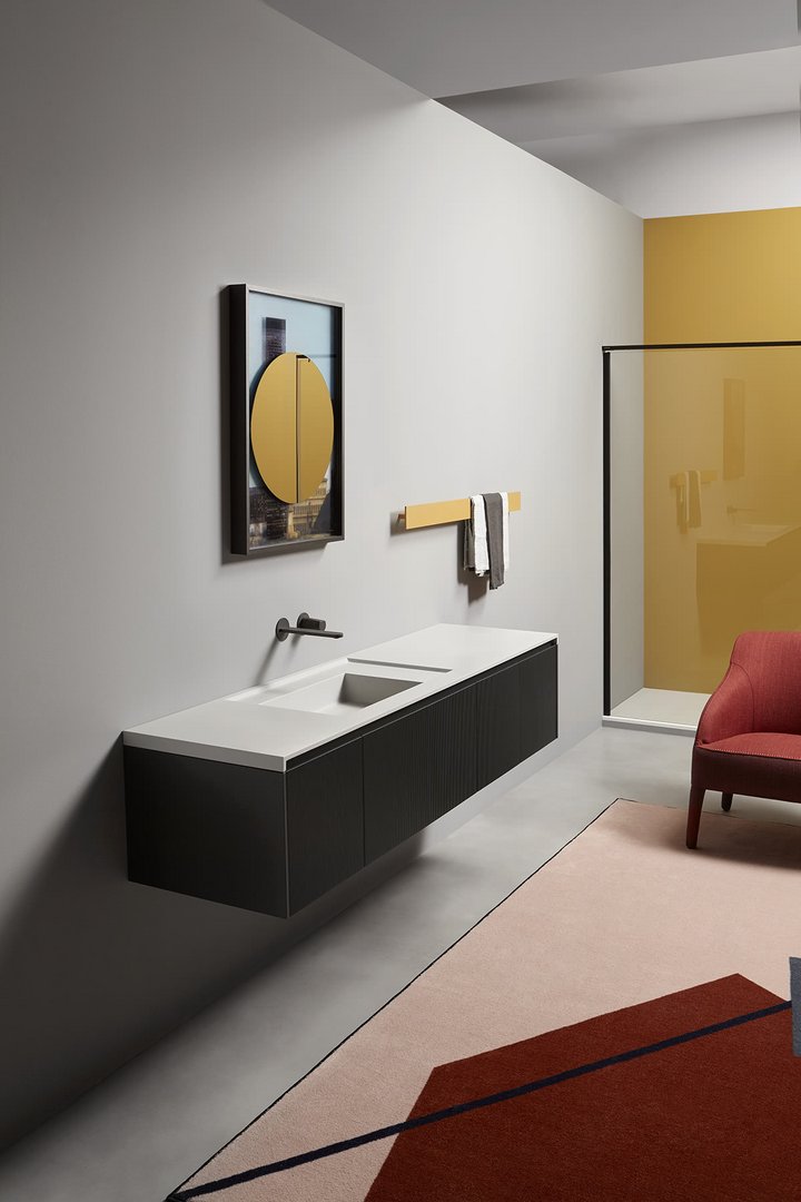 Una collezione di mobili dall’immagine essenziale e dalle linee pulite com’è nello stile di antoniolupi, ma con un segno grafico importante che diventa decoro geometrico per esaltare la matericità delle superfici e valorizzare il volume dei contenitori. Linee parallele come binari incidono i frontali dell’anta e dei fianchi, conferendo tridimensionalità alla superficie e vestendo il mobile con una “plissettatura” che ne alleggerisce visivamente l’immagine. Distanziate tra loro di 3 mm in Binario 03 e 12 mm in Binario 12, le fresature scandiscono lo sviluppo longitudinale del contenitore, opponendo una traccia verticale molto fitta che “misura” la proporzione dell’anta, arricchendo di significato l’intero progetto. Binario 03 è disponibile sia nella versione in essenza legno che in quella laccata in finitura goffrata o seta in tutti i colori dell’ampia gamma antoniolupi.