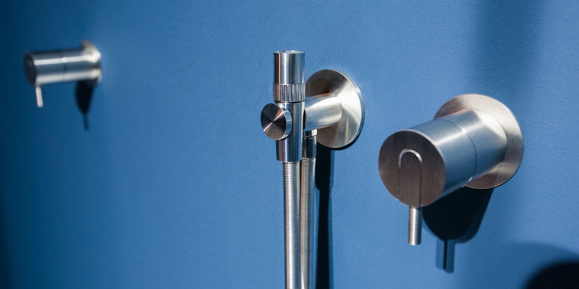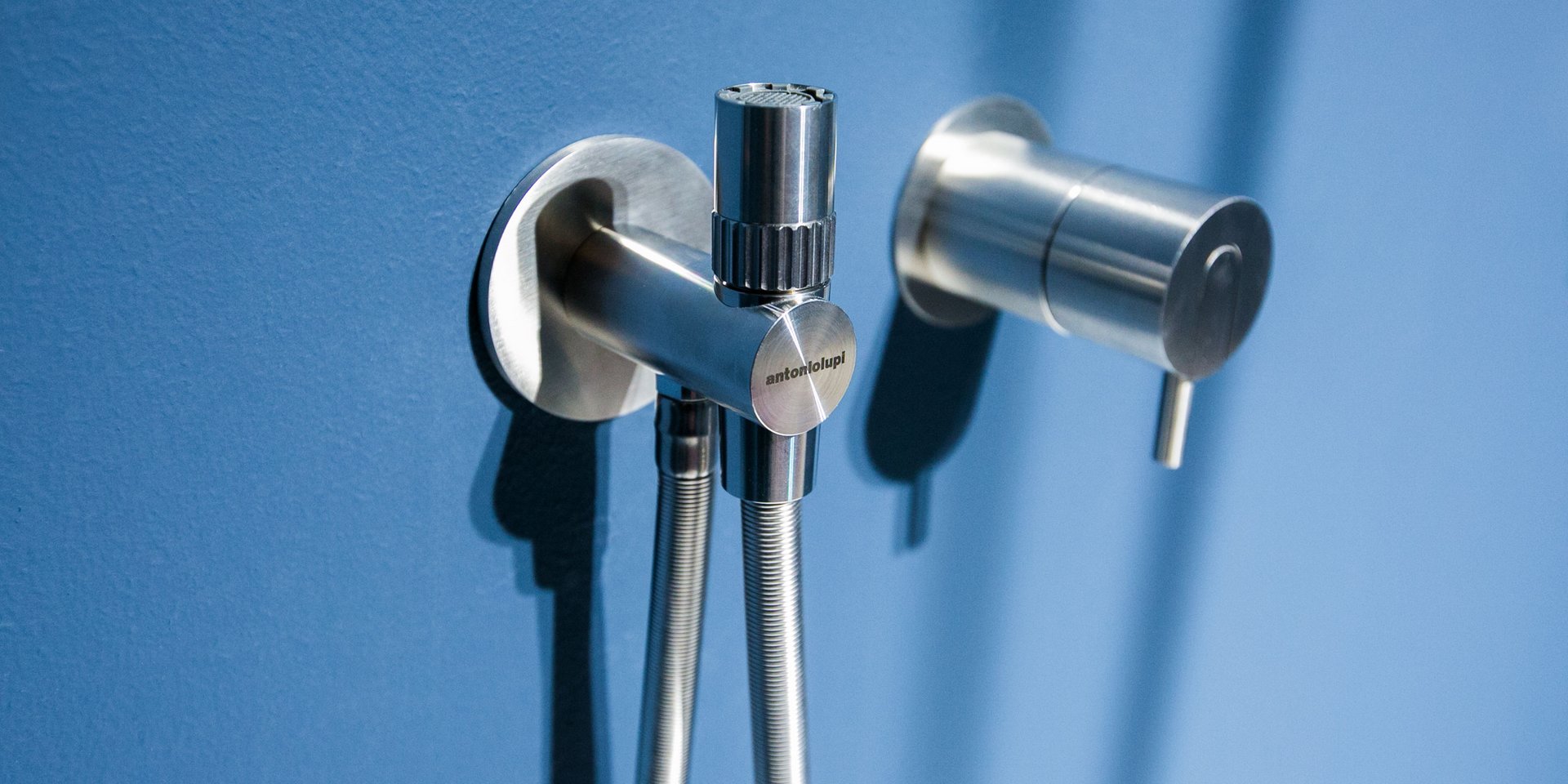 Satin stainless steel or graphite finish hand shower complete with wall support and water outlet, flexible hose 150 cm.