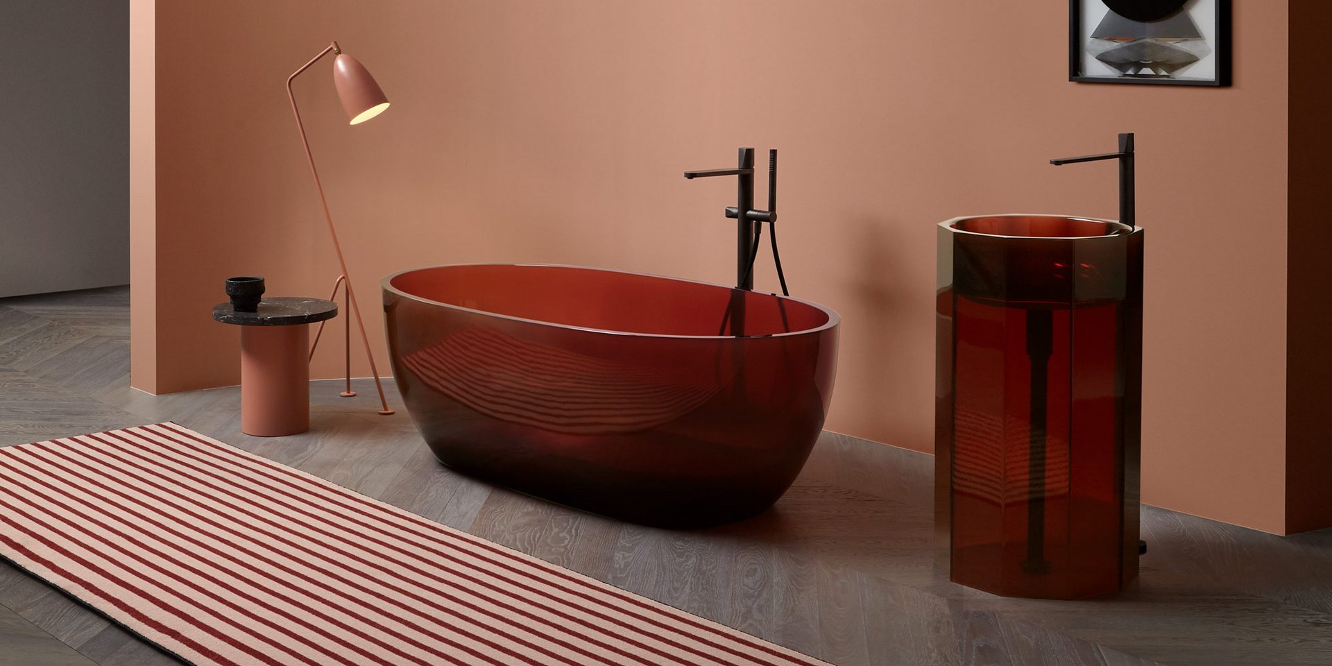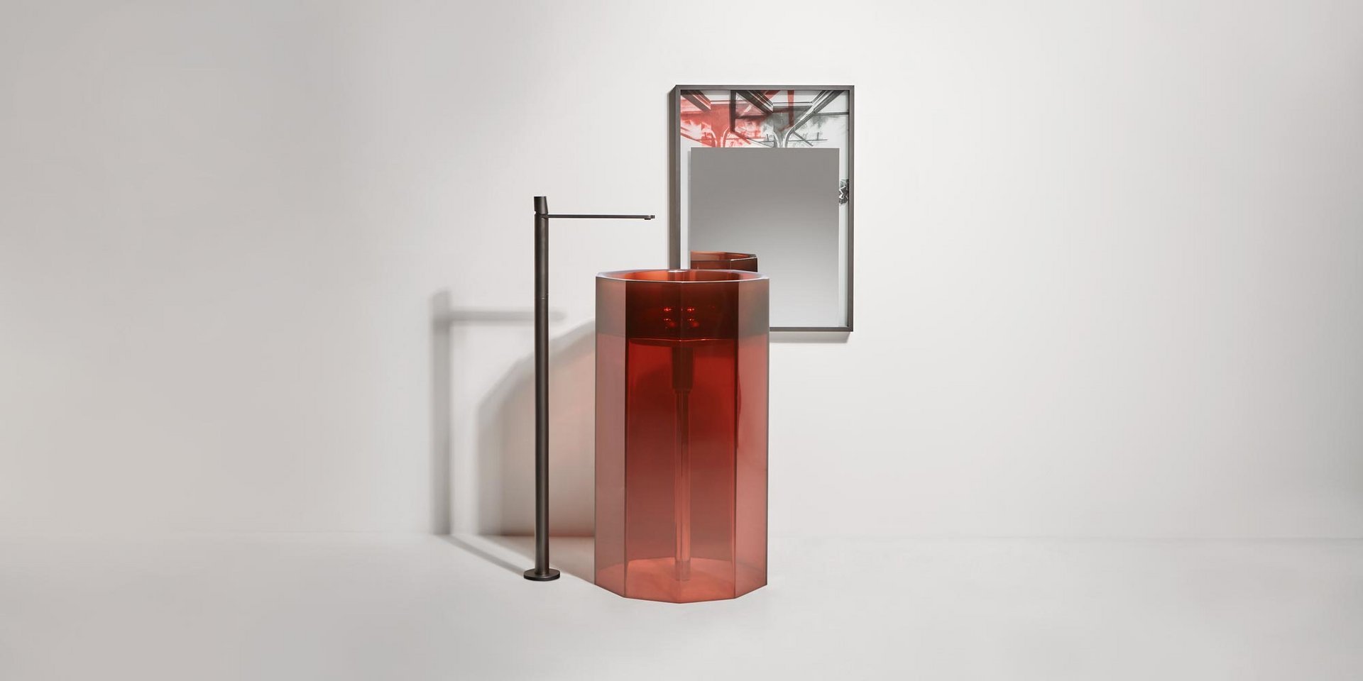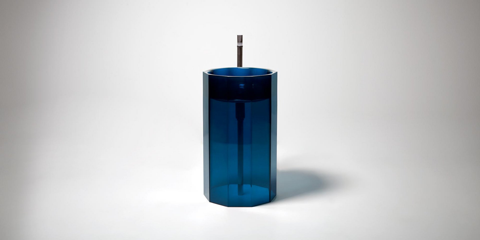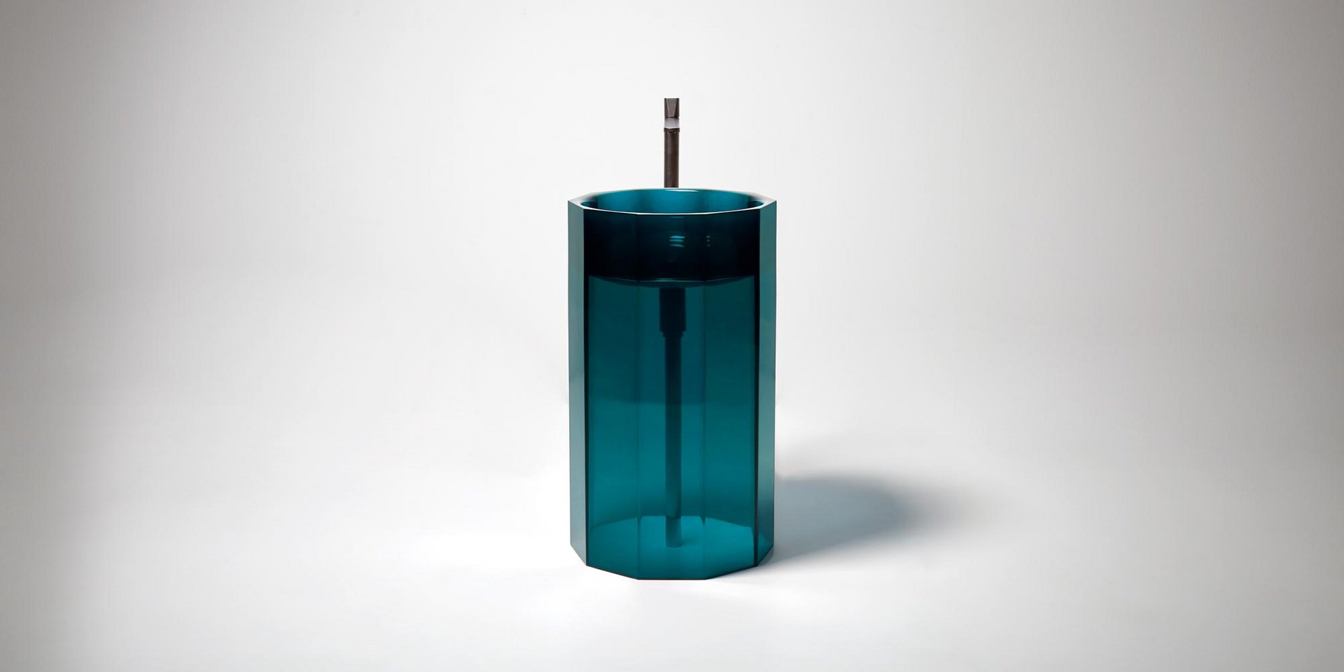 Freestanding Cristalmood sink with floor drainage, available in various colors as per our color chart, complete with pressure plug, siphon and rigid tube.