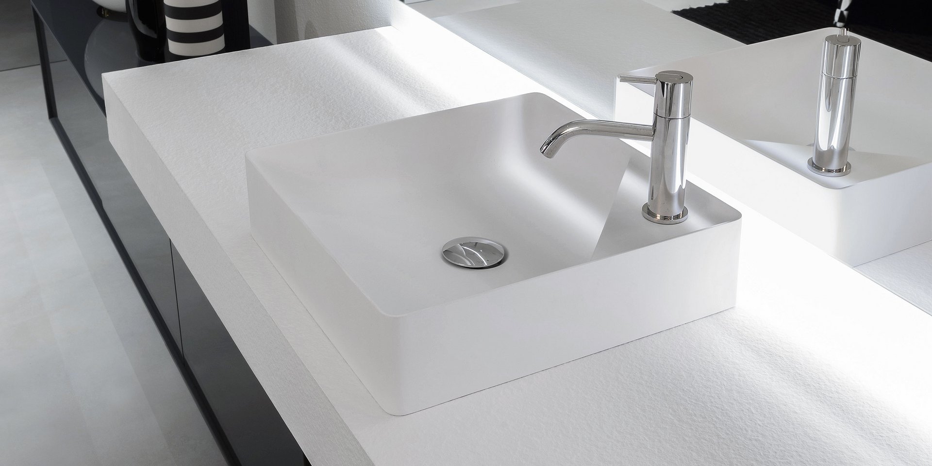 Square top mount Flumood? sink complete with drain pipe fitting and opening plug. Can be lacquered externally.