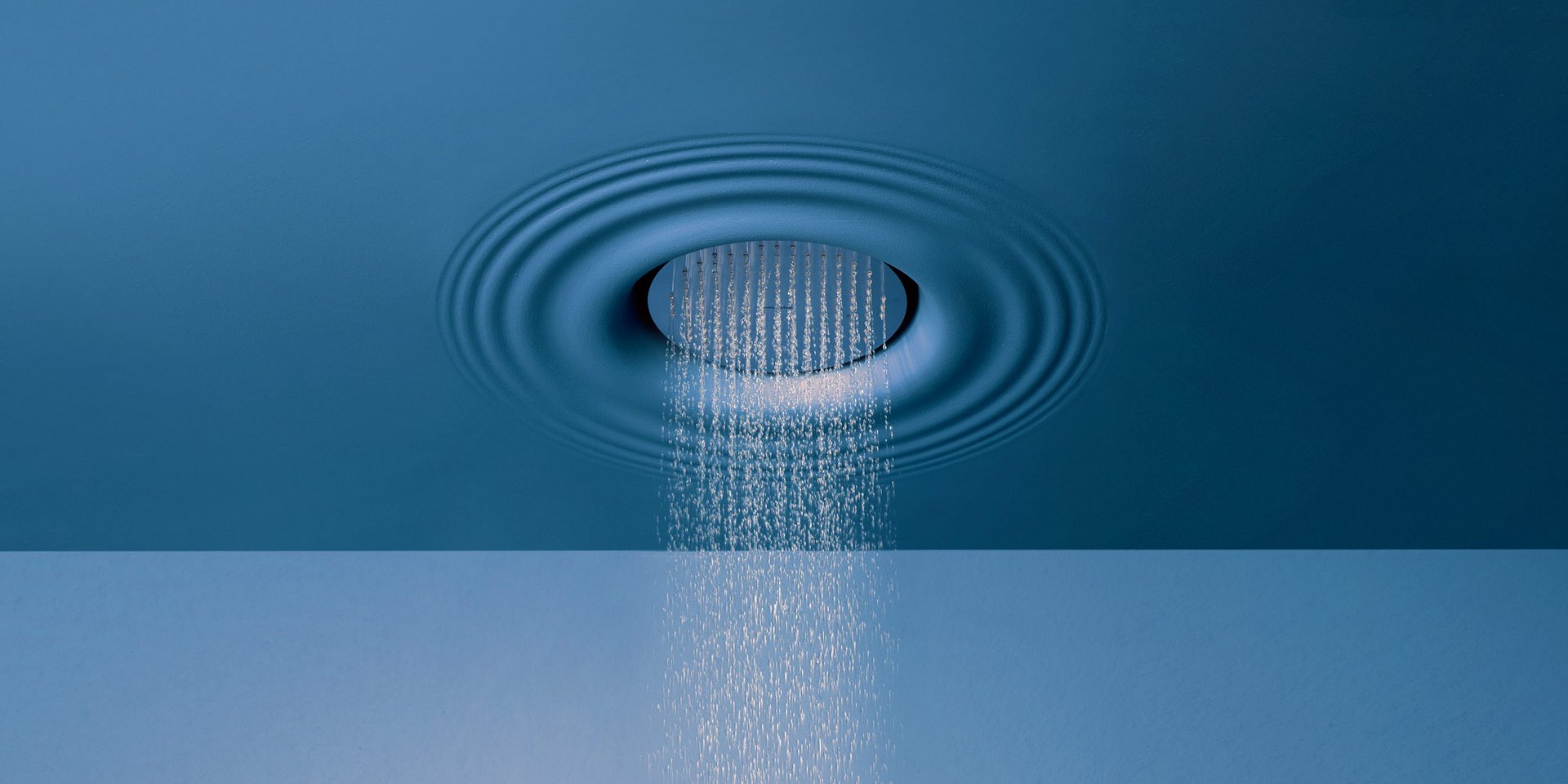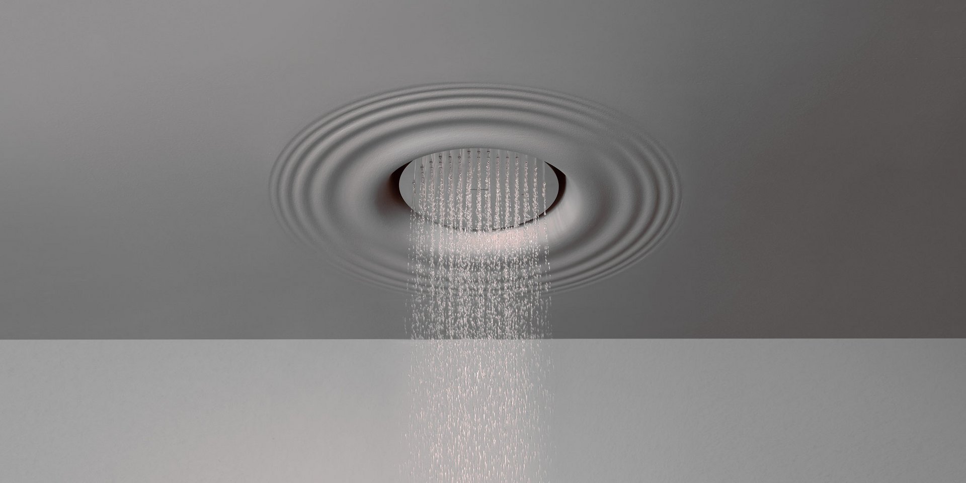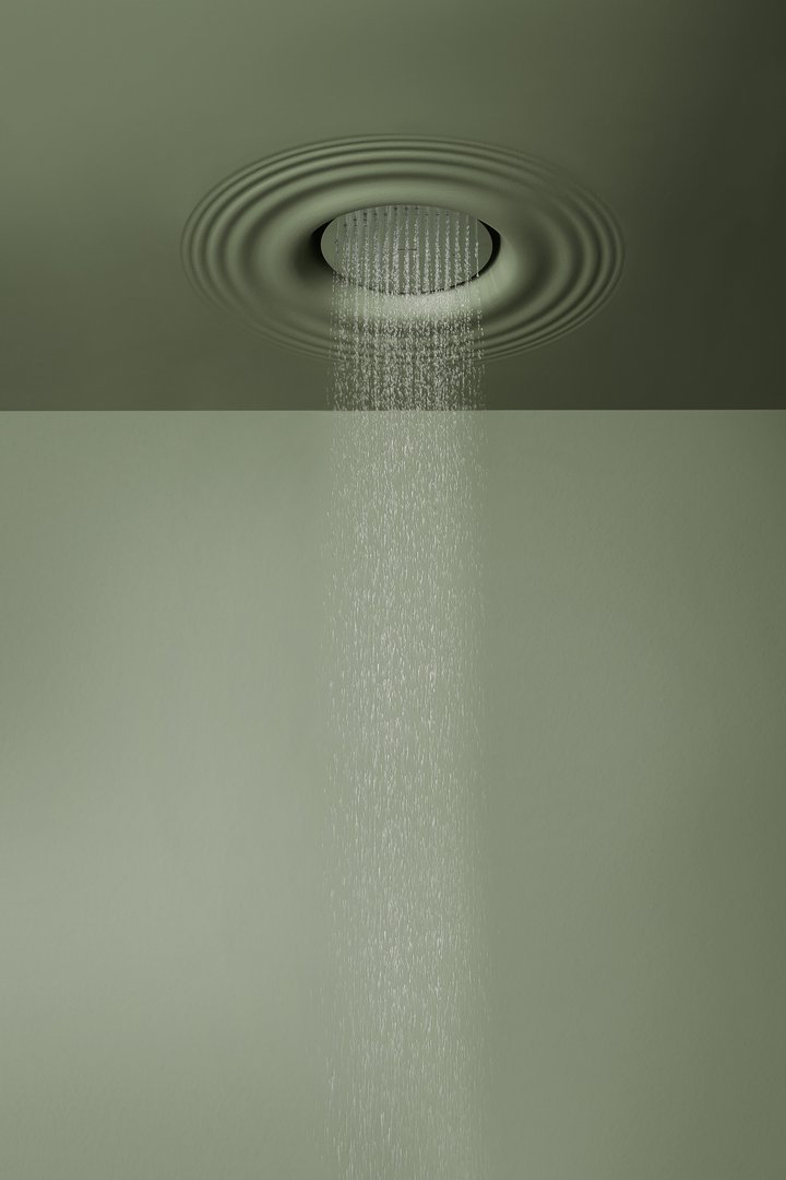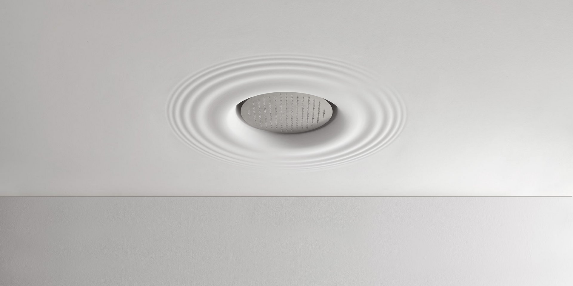 Ceiling encased Flumood frame with satin stainless steel AISI 304 showerhead.