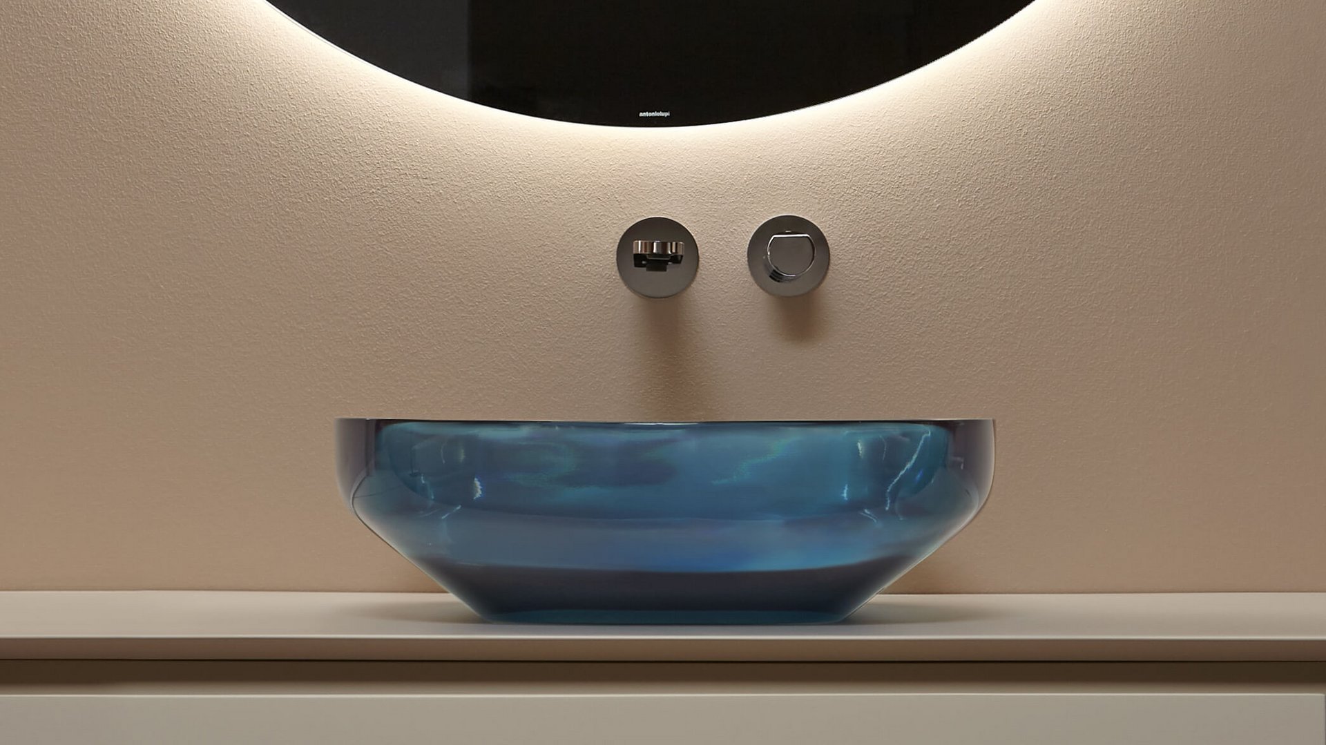 Oval top mount sink in Cristalmood, available in various colors complete with drain pipe fitting and open plug.