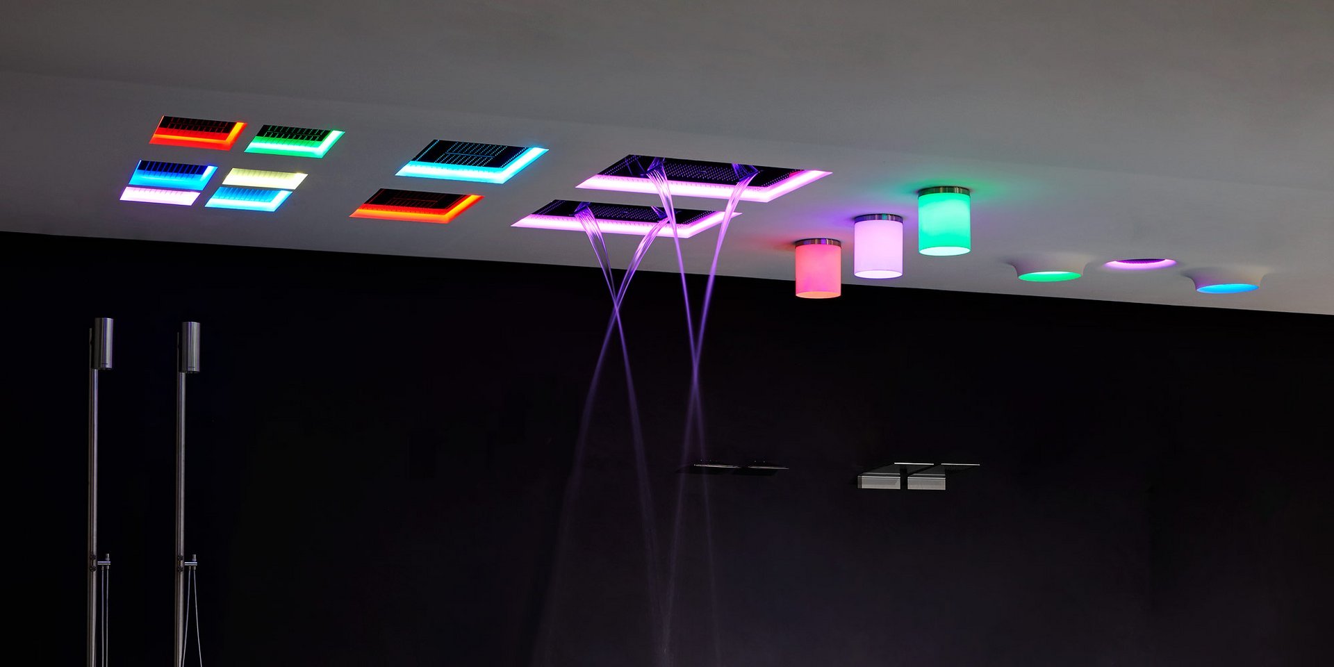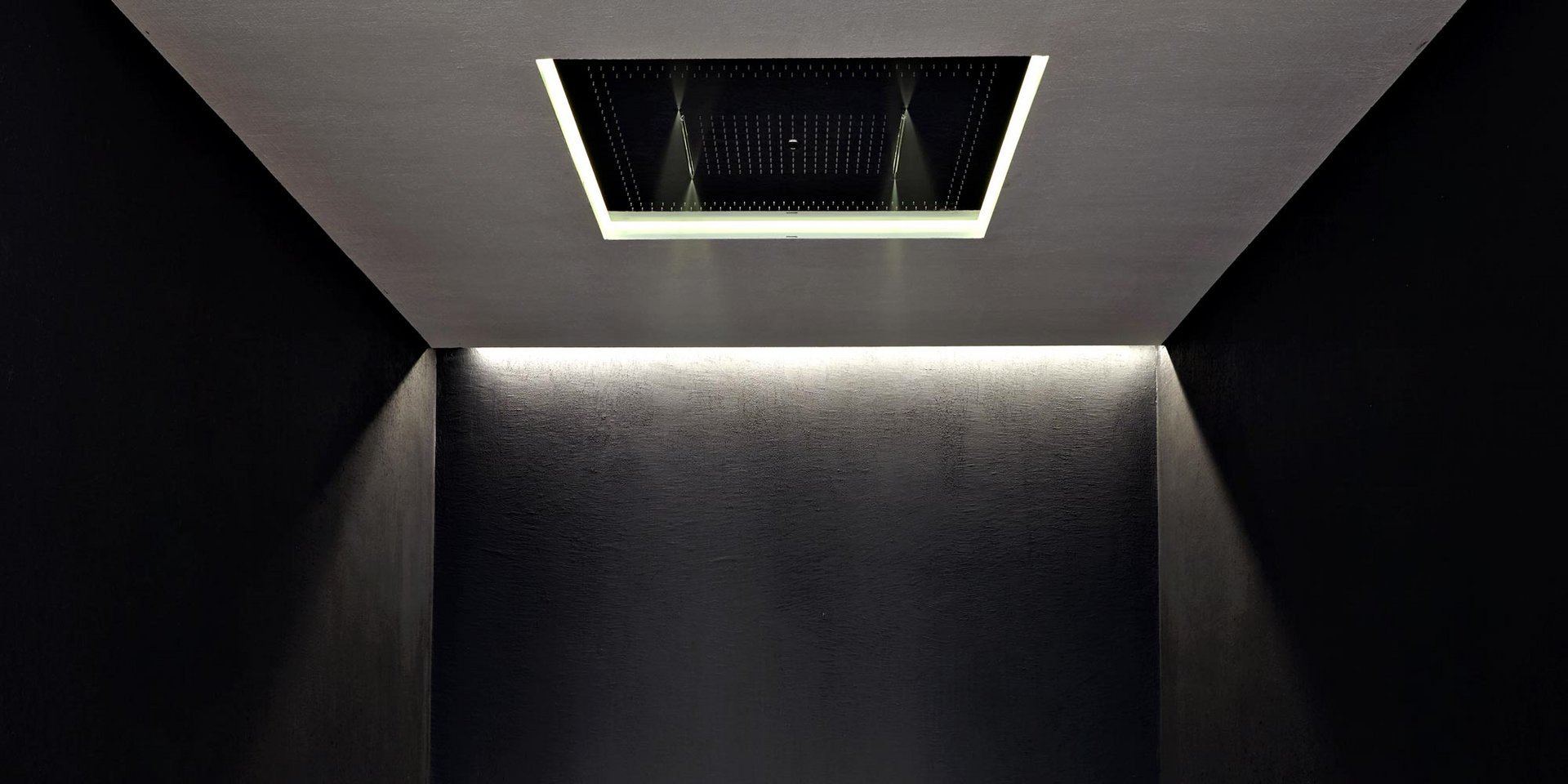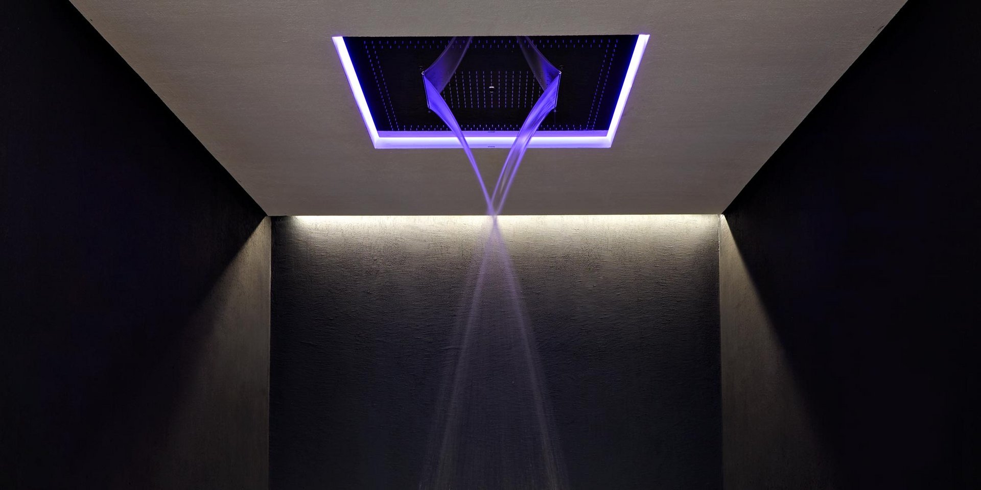 Encased showerhead in polished stainless steel AISI 304 with double waterfall, hard center jet and nebulizers, available in various finishes with possible led rgb lighting complete with waterproof remote control.
