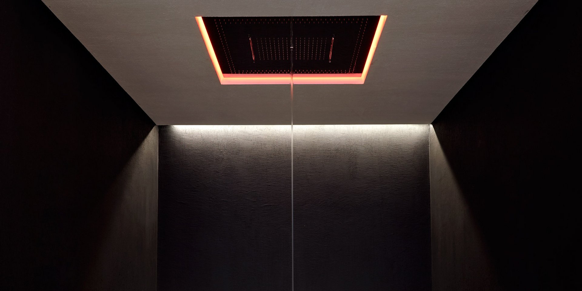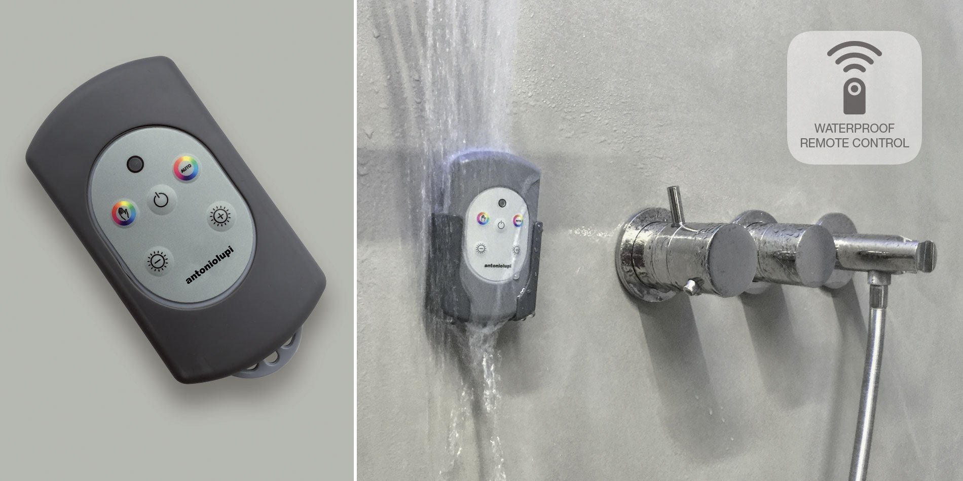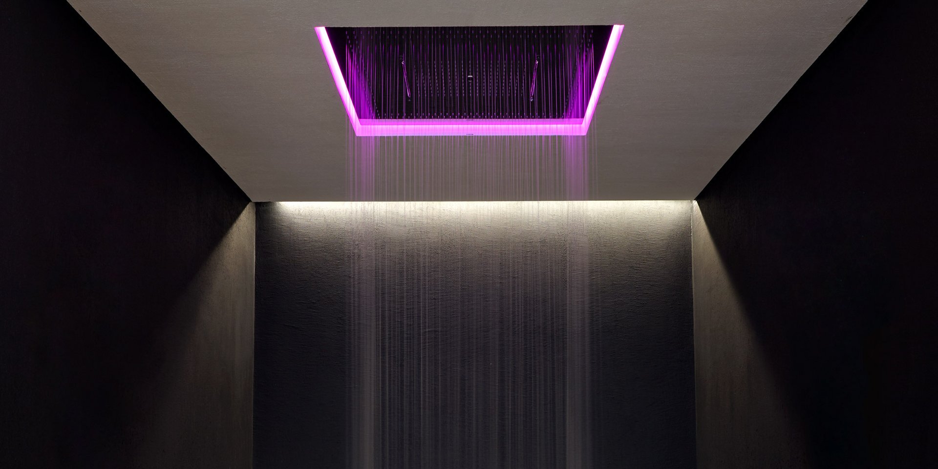 Encased showerhead in polished stainless steel AISI 304 with double waterfall, hard center jet and nebulizers, available in various finishes with possible led rgb lighting complete with waterproof remote control.