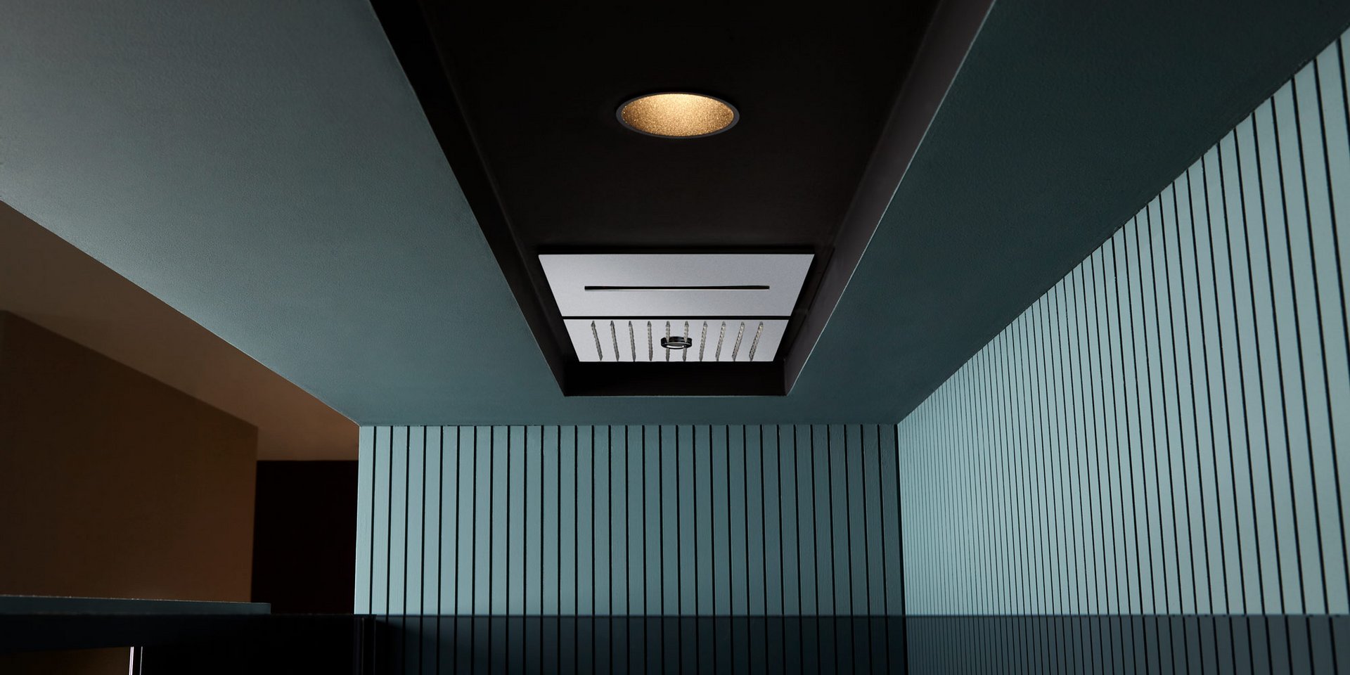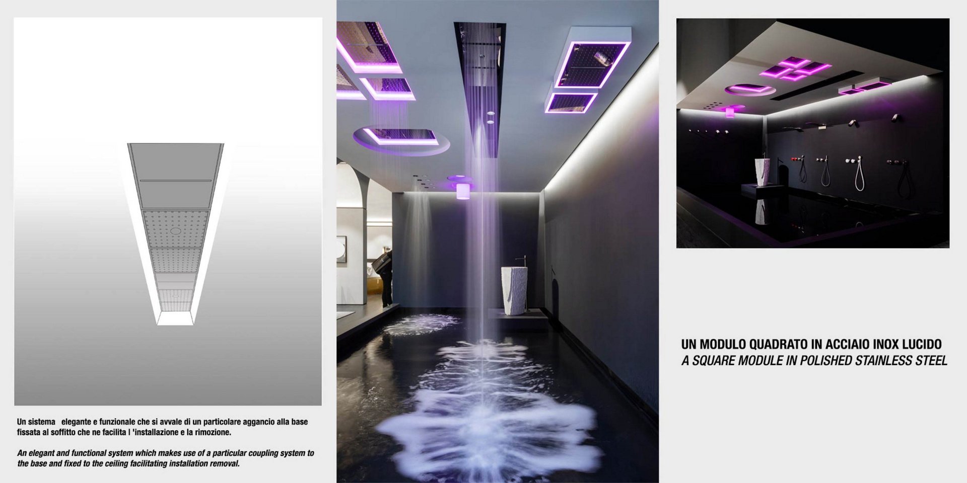 Encased modular showerhead with hard center jet in polished stainless steel AISI 304.