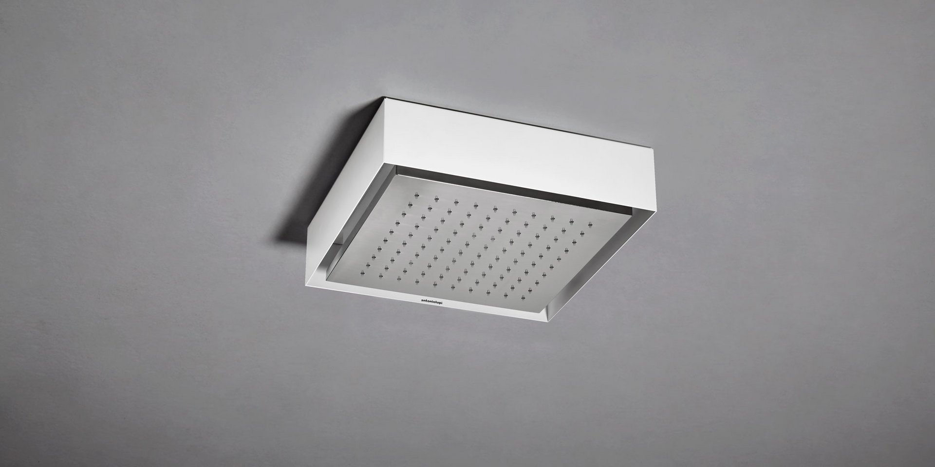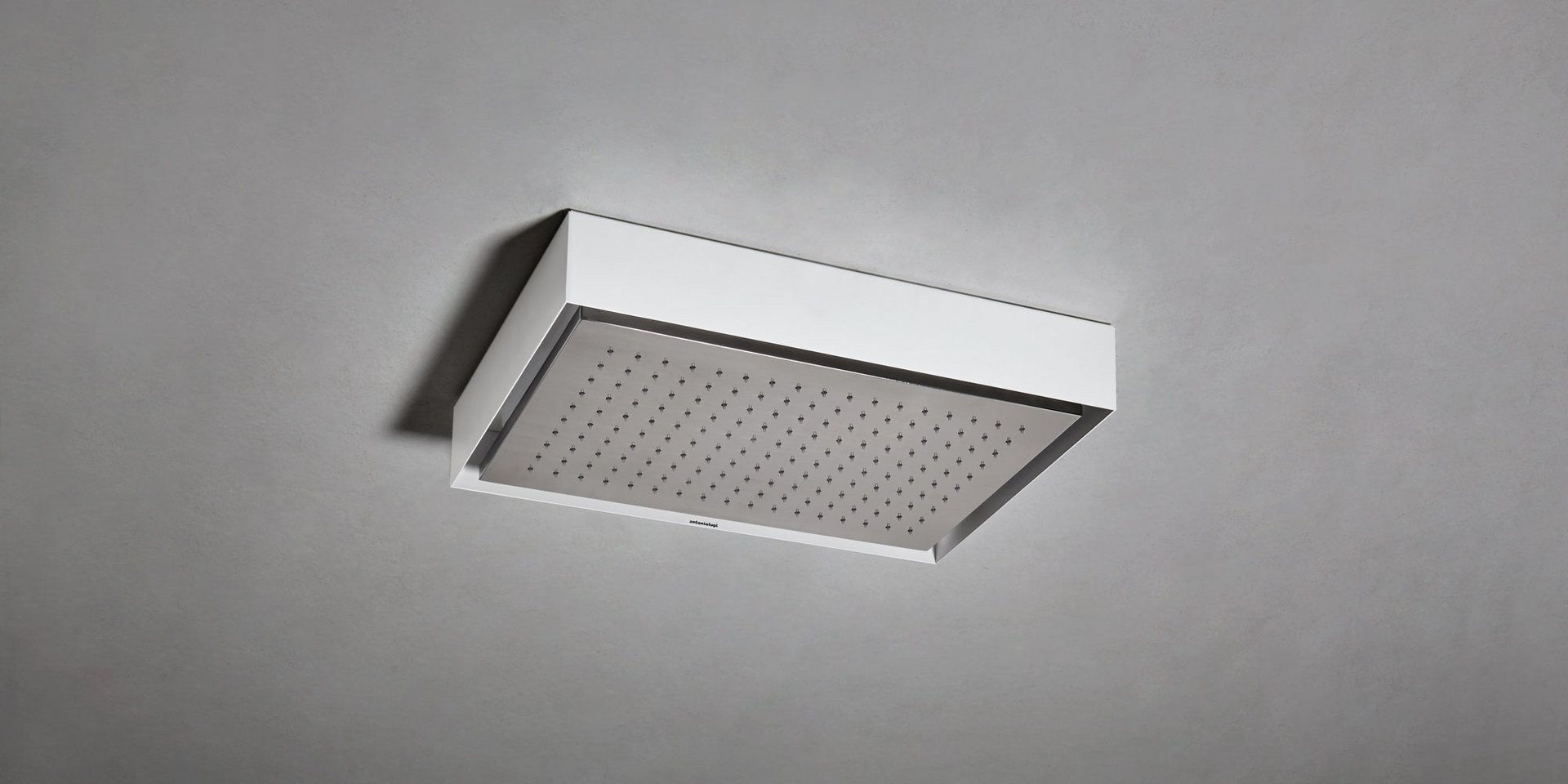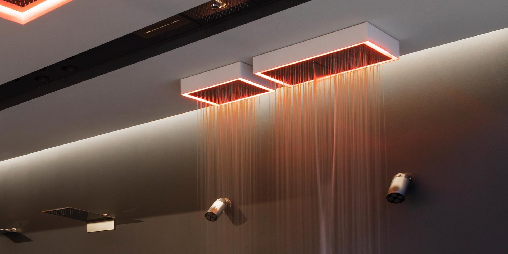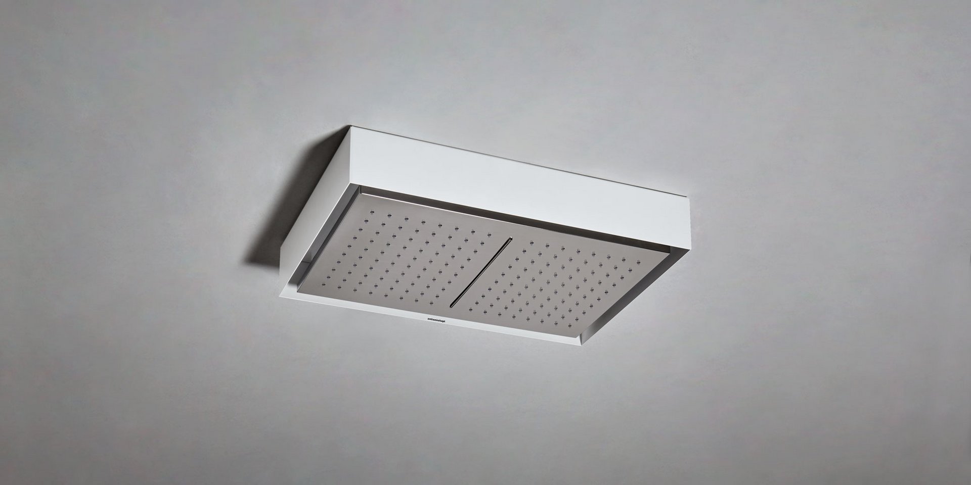 Ceiling mounted showerhead with central shower, waterfall and external frame in steel AISI 304, available in various finishes, with possible LED RGB lighting and waterproof remote.