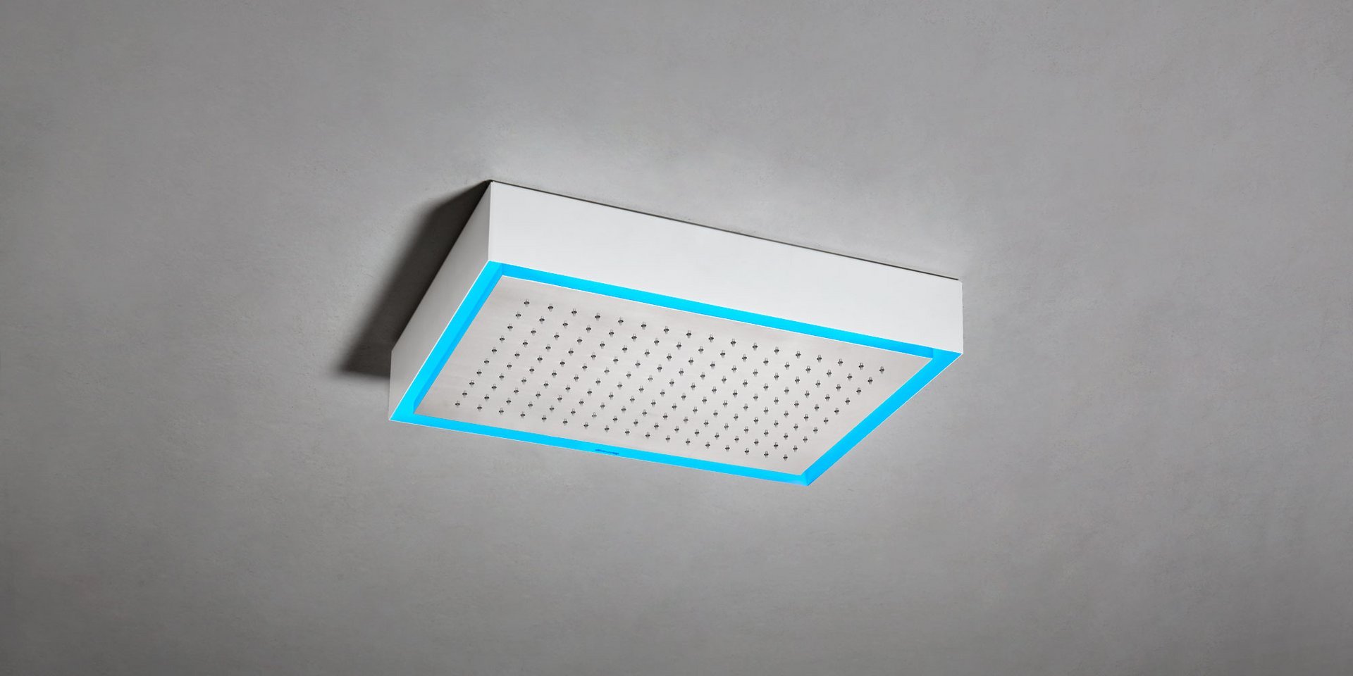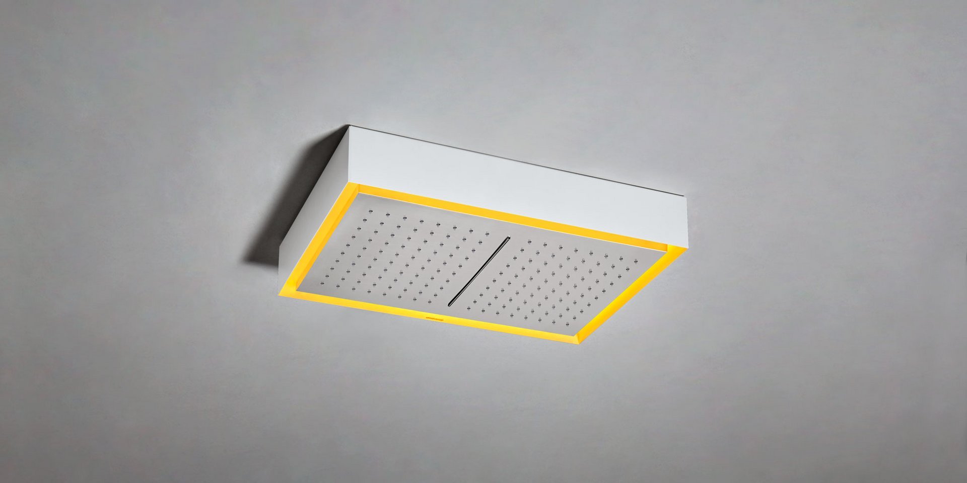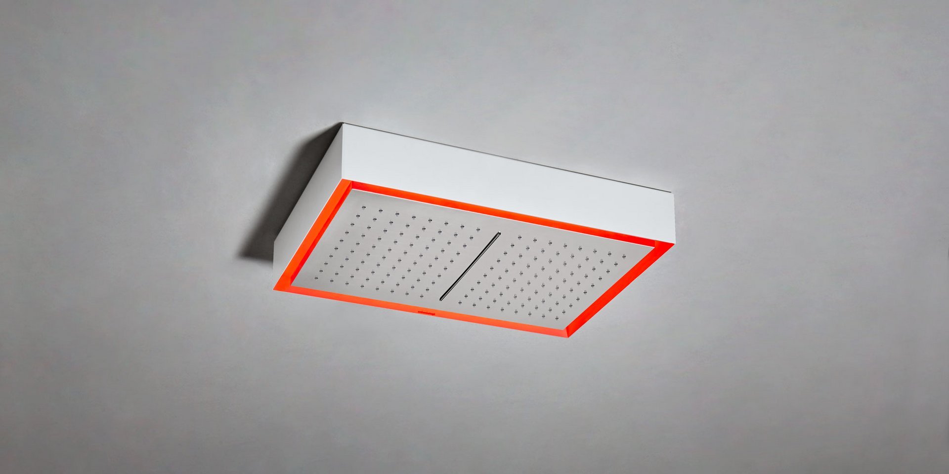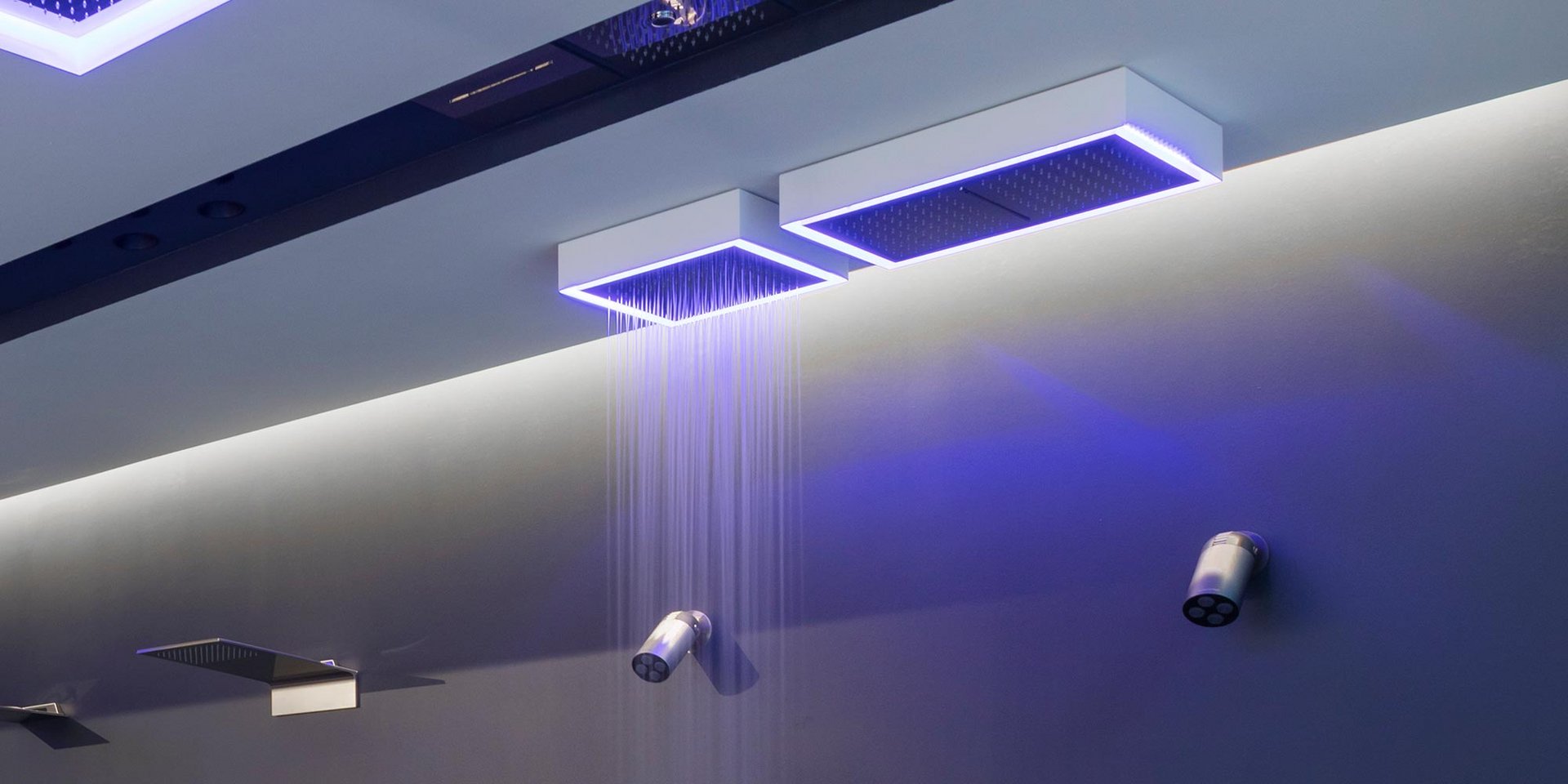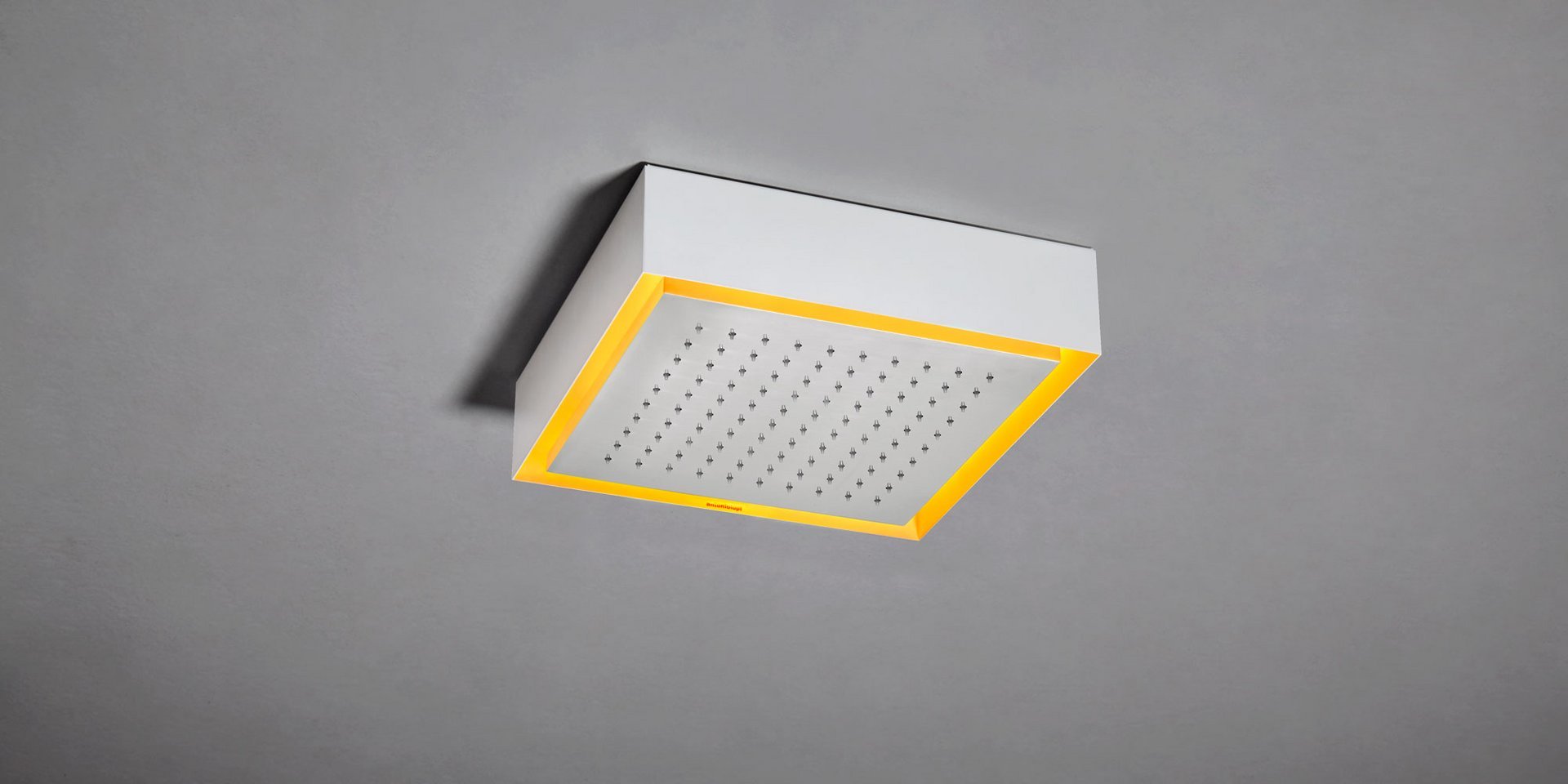 Ceiling mounted showerhead with central shower, waterfall and external frame in steel AISI 304, available in various finishes, with possible LED RGB lighting and waterproof remote.