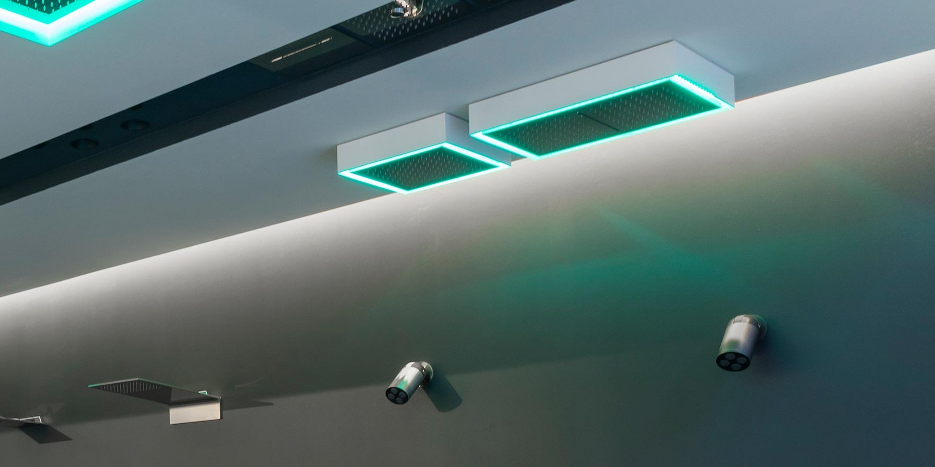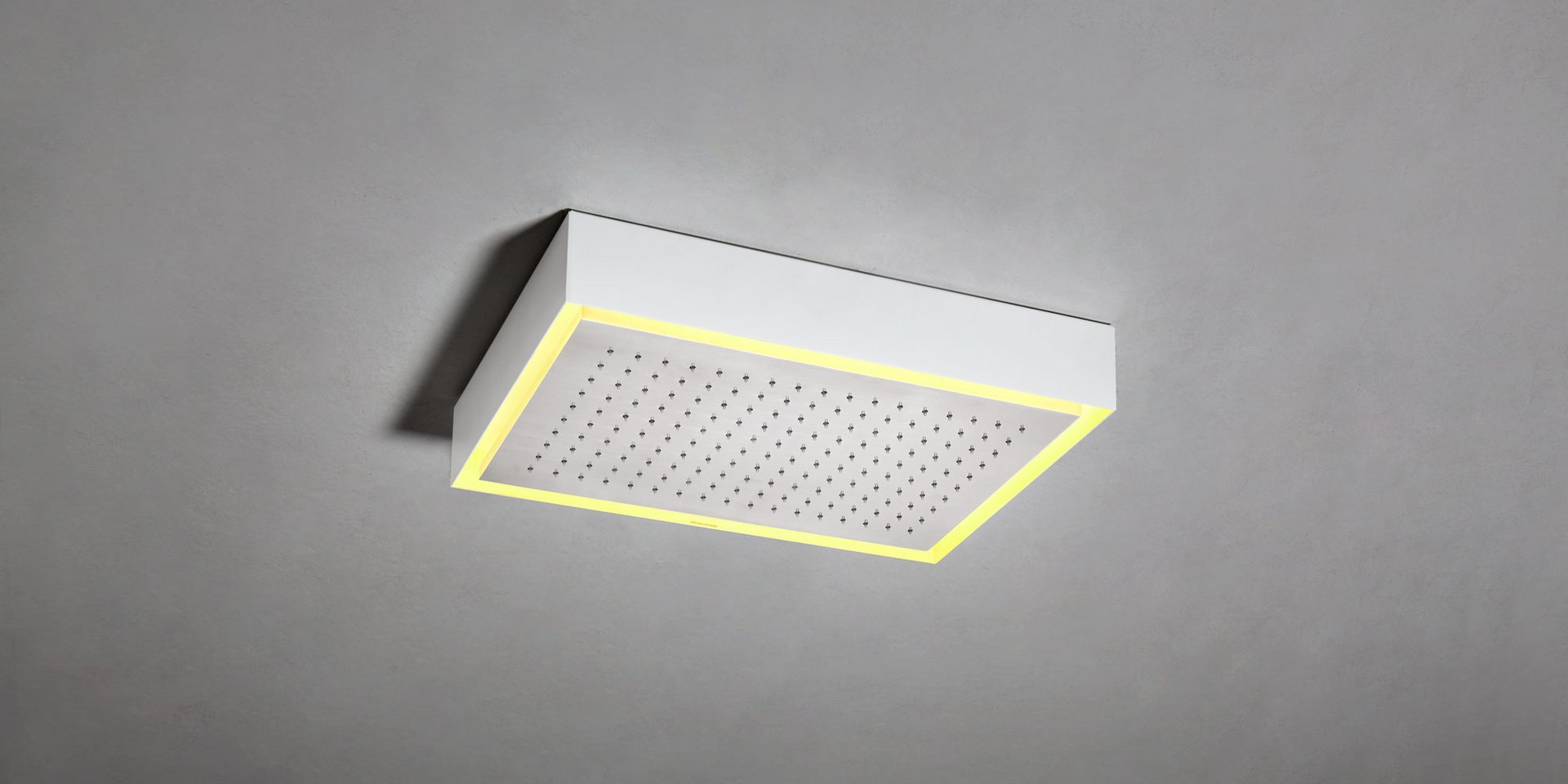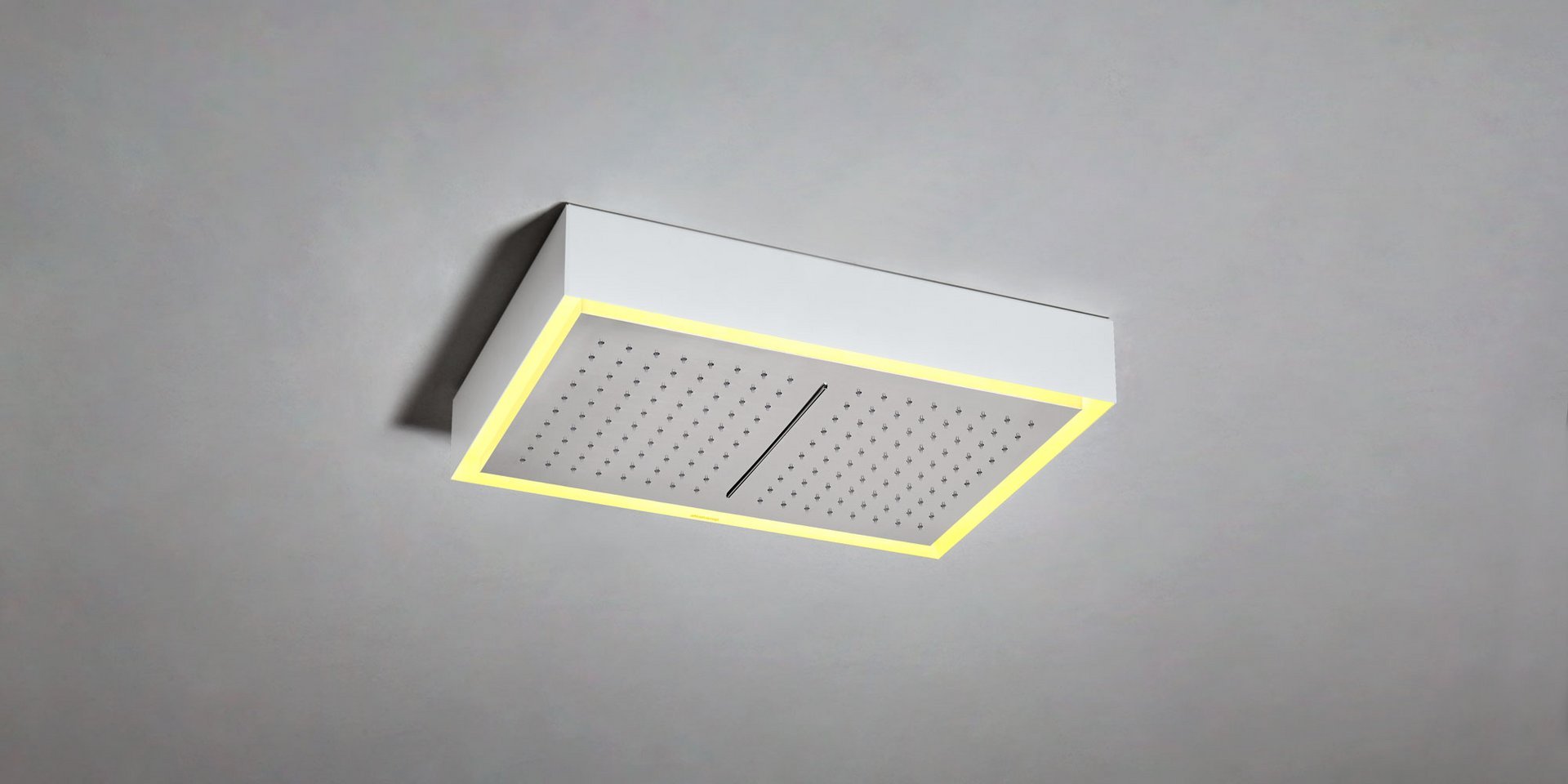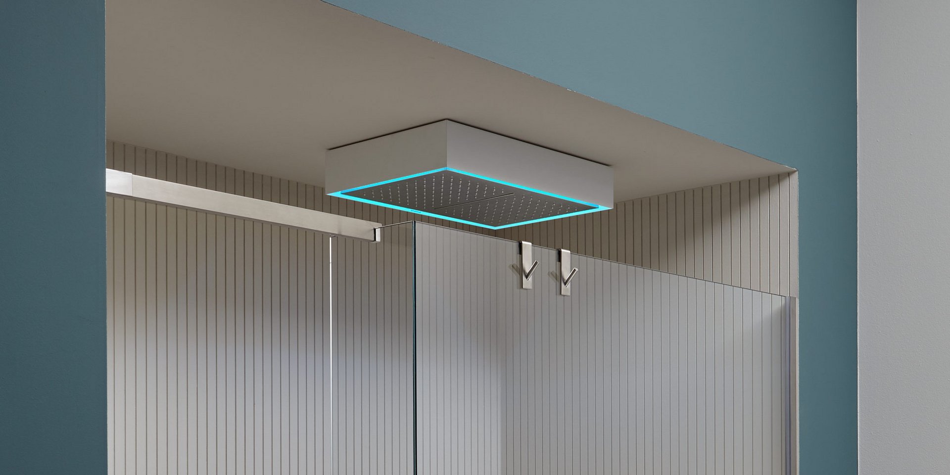 Ceiling mounted showerhead with central shower, waterfall and external frame in steel AISI 304, available in various finishes, with possible LED RGB lighting and waterproof remote.