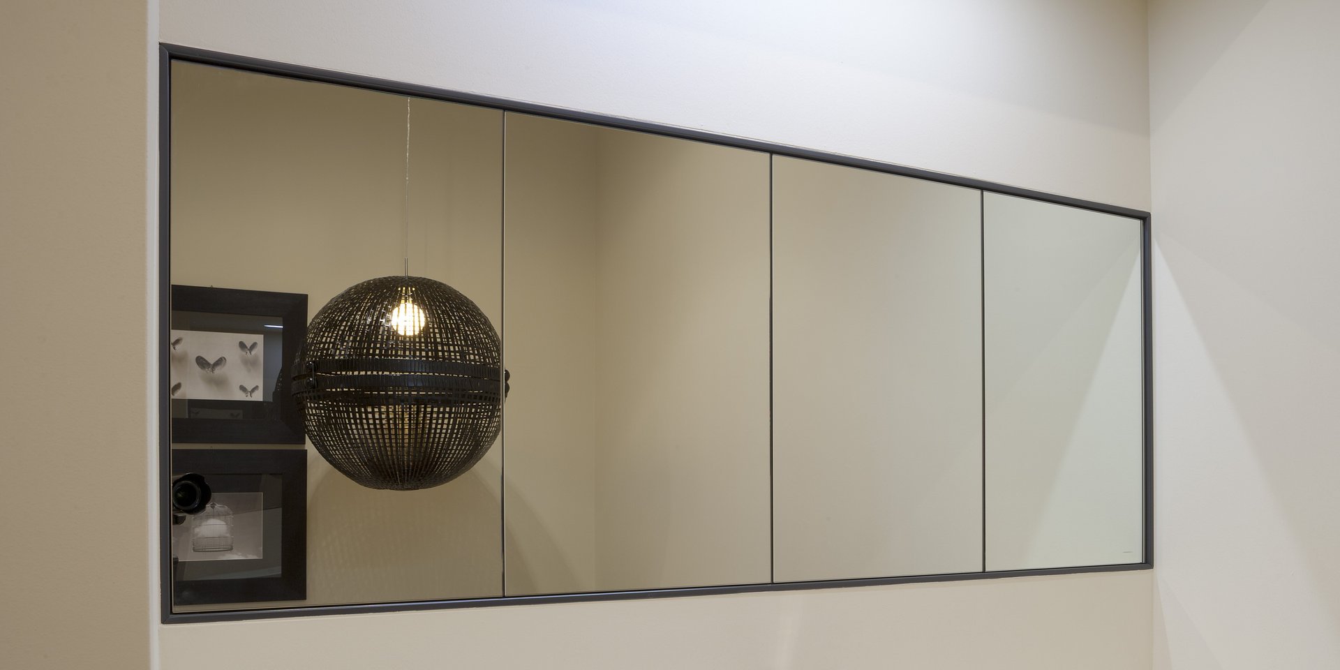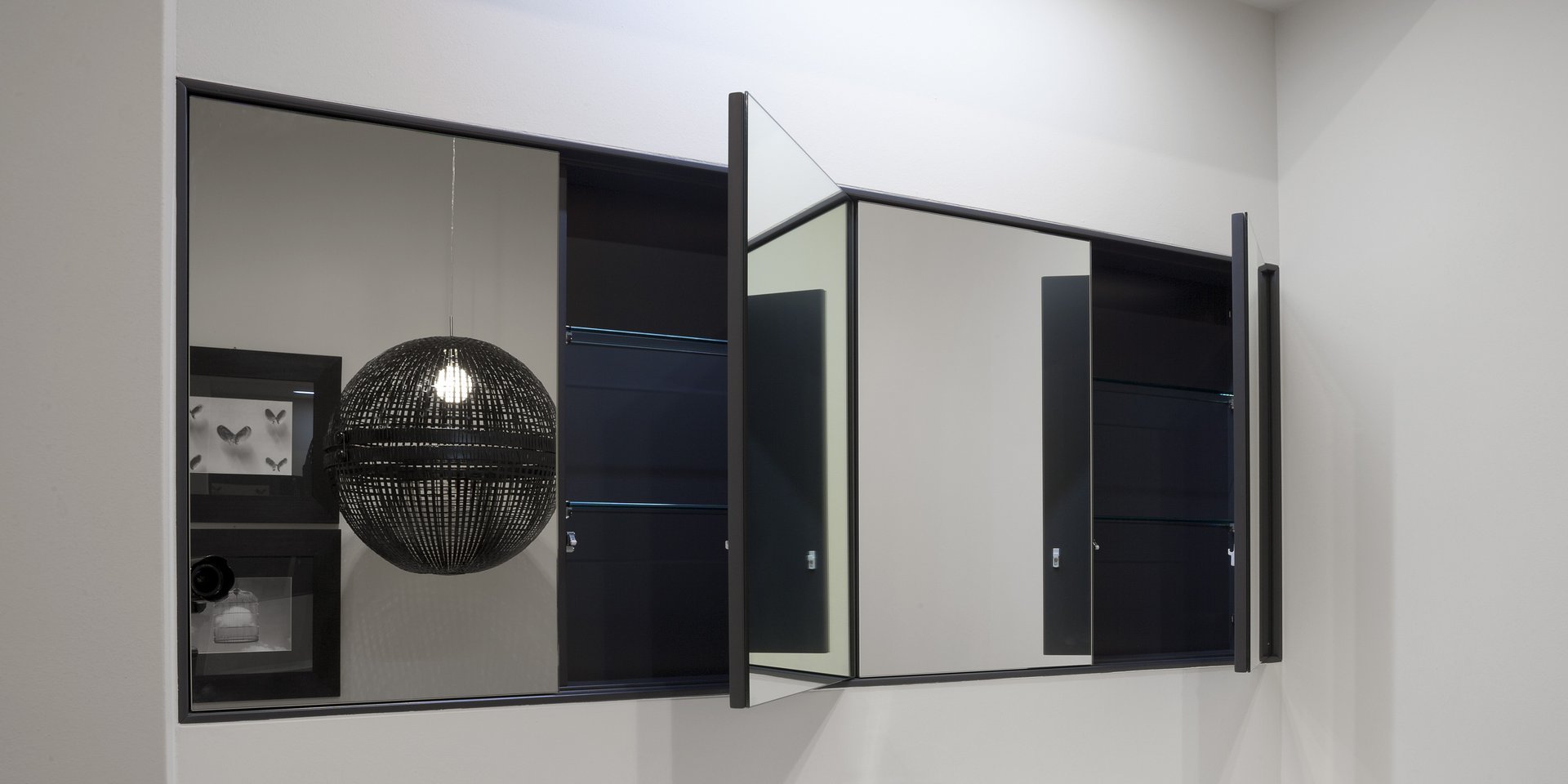 Right or left wall cabinet with face mirrored door and internal shelves.