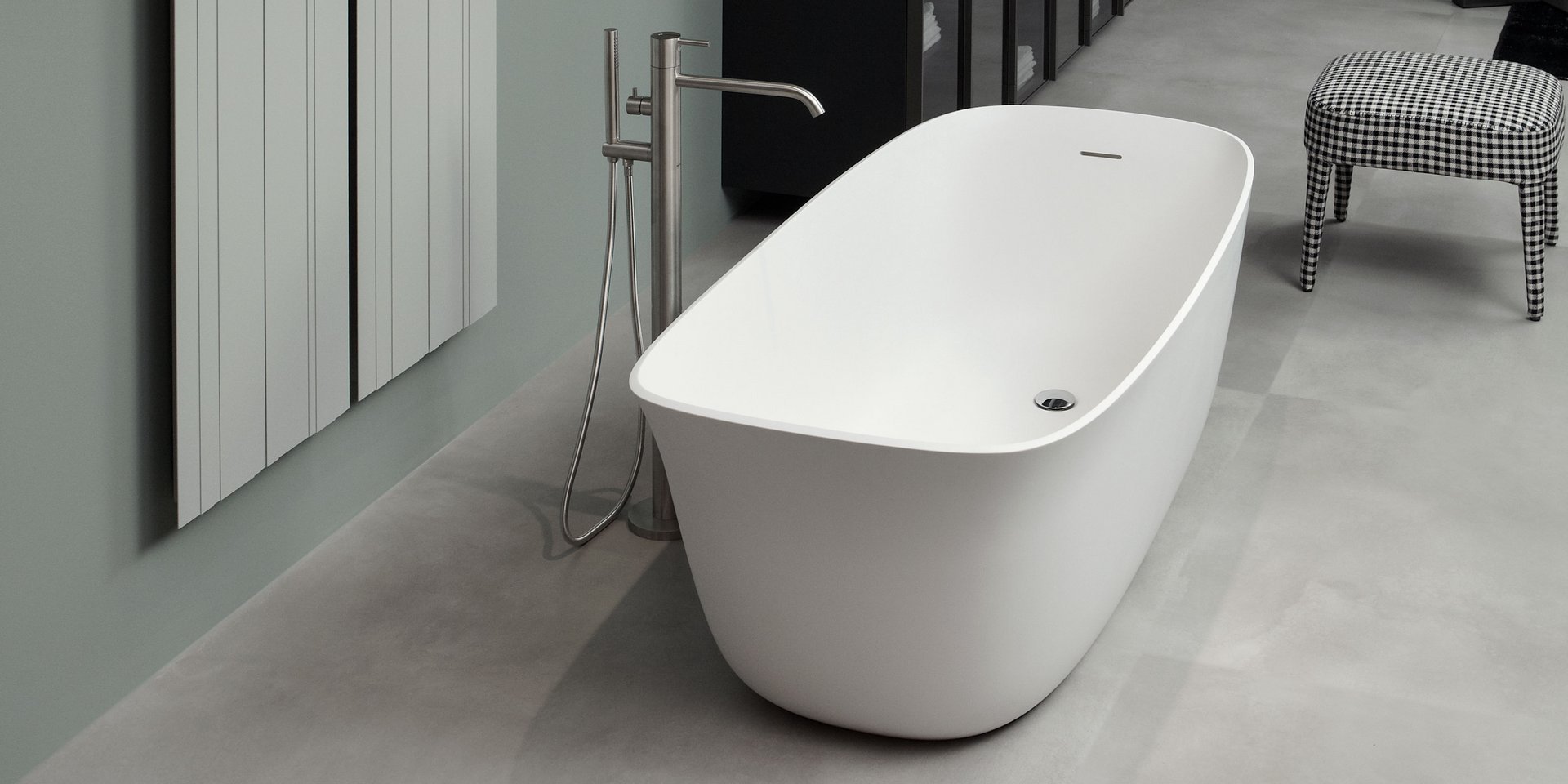Oval Cristalplant bathtub complete with drain and pressure plug, siphon and flexible hose.