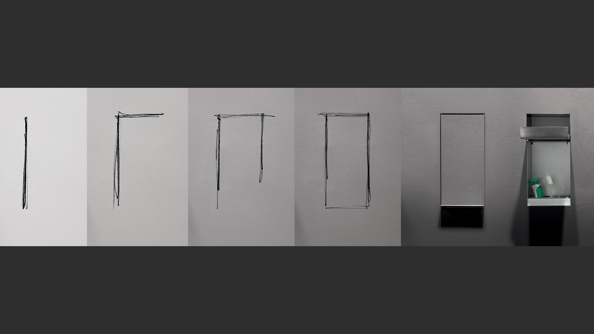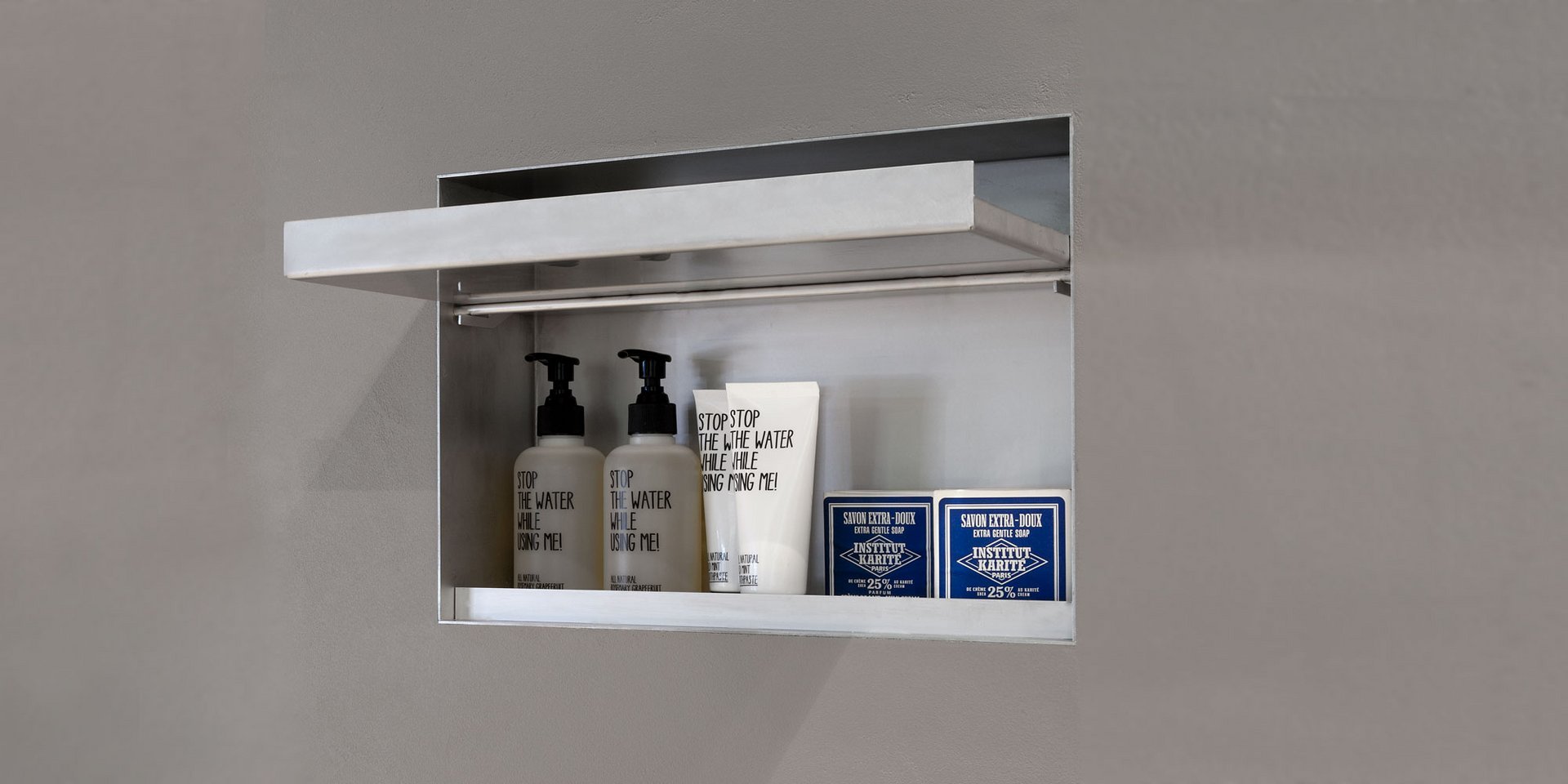 Encased soap dispenser or brush holder in stainless steel AISI 304 with an aluminum finish.