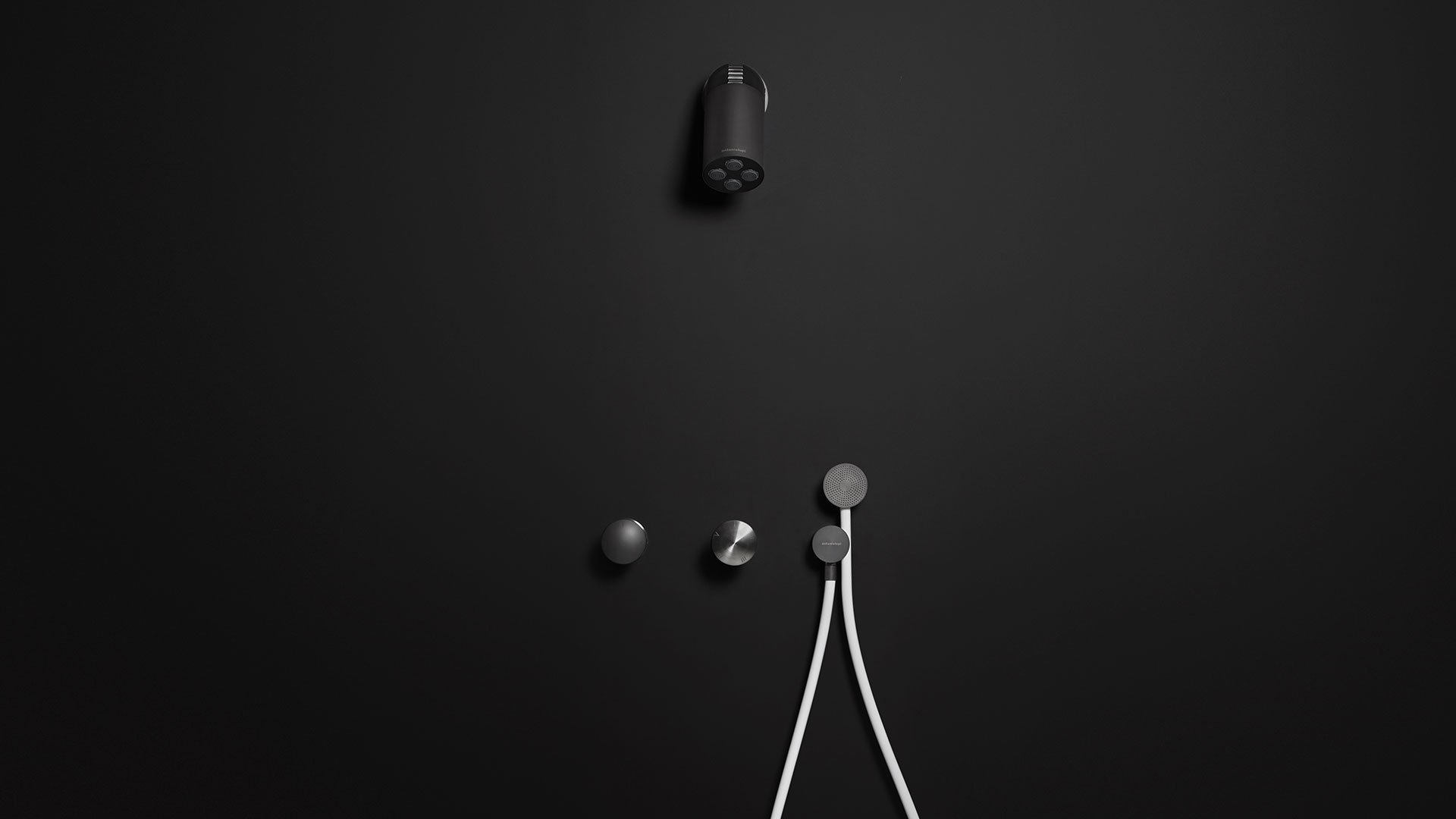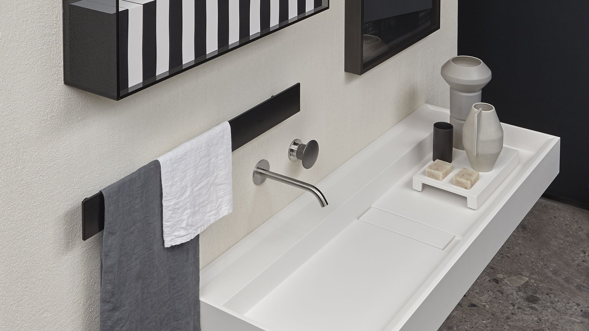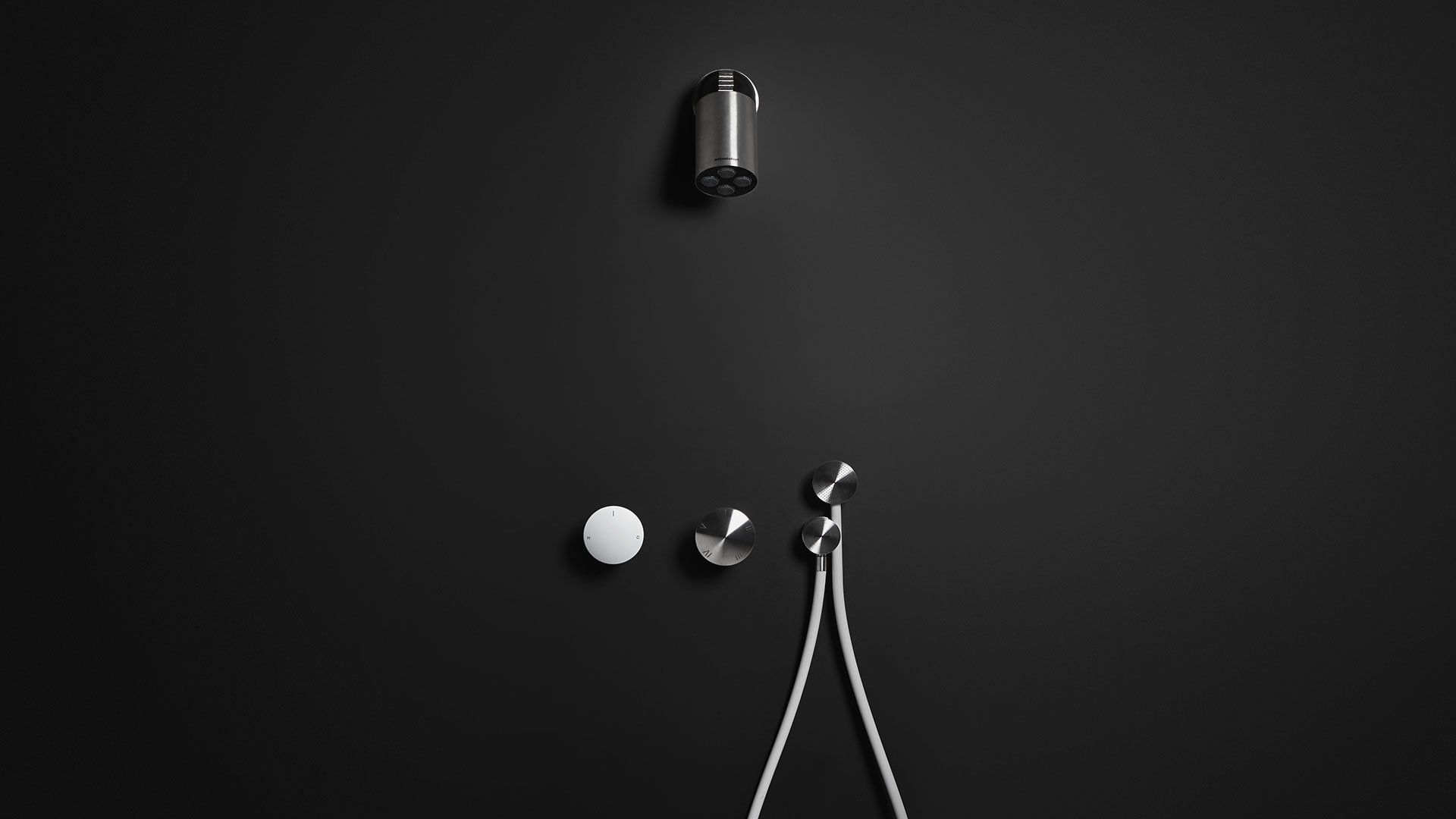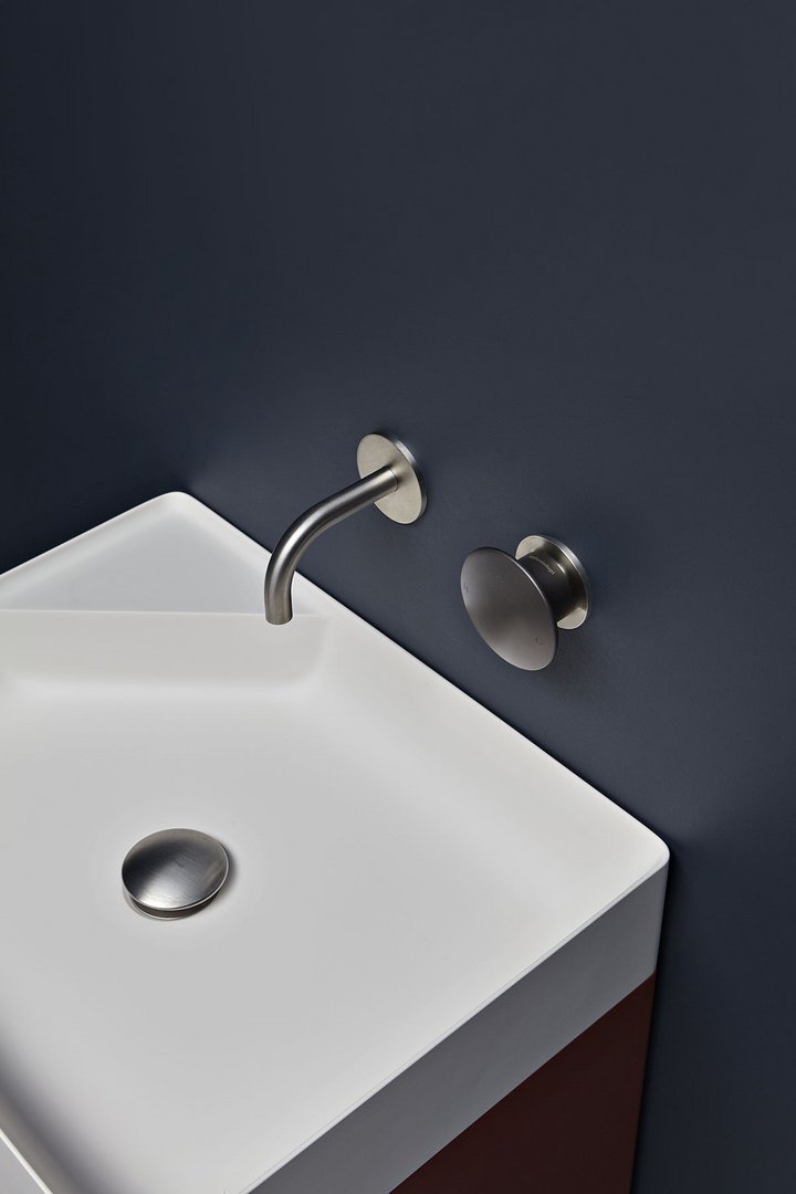 Single lever mixer with a satin stainless steel handle or graphite, lacquered red or white brass complete with concealed valve.