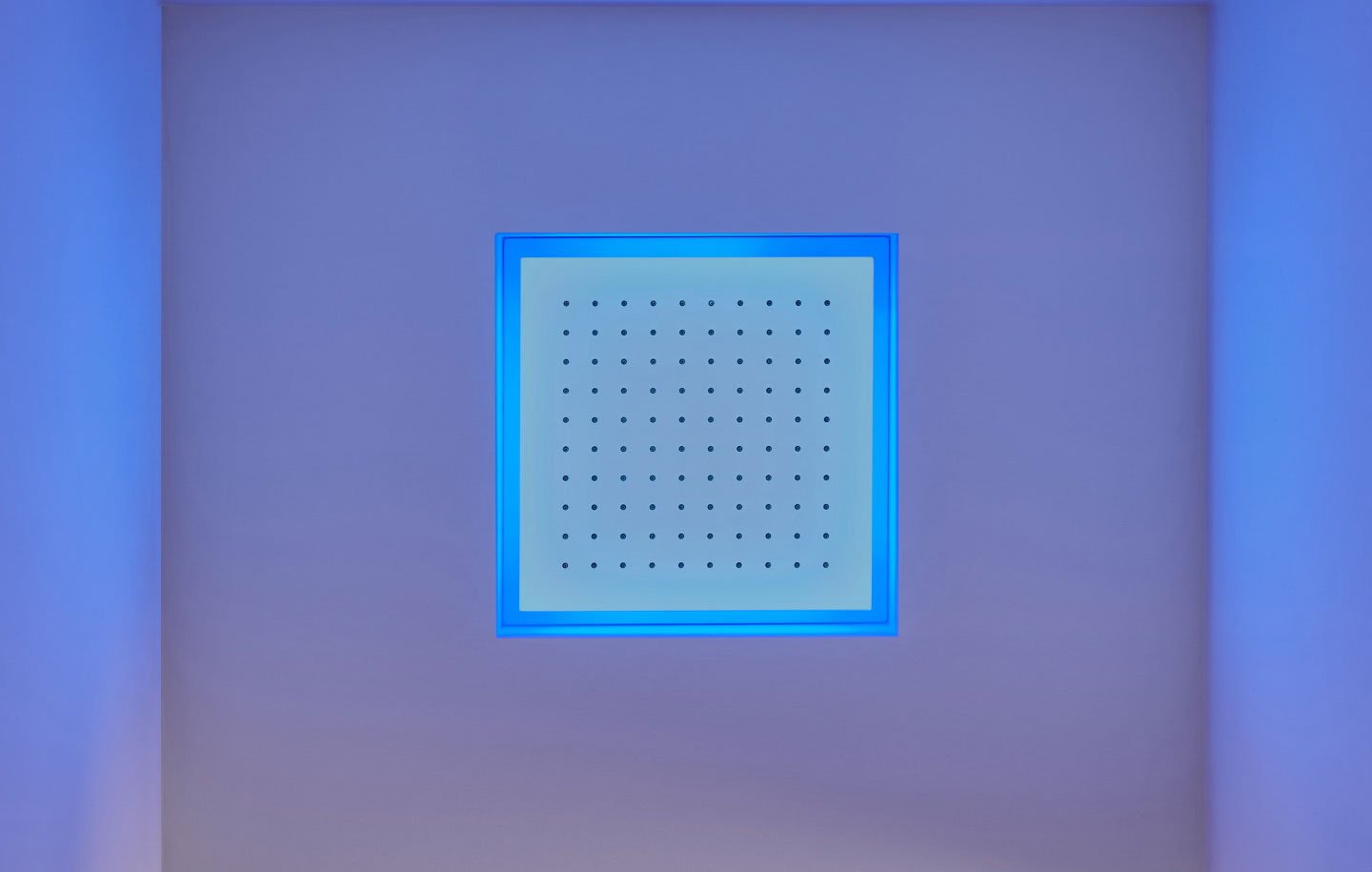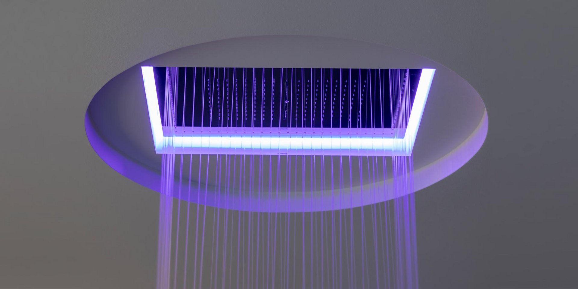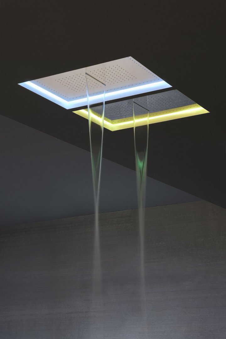 Encased waterfall showerhead available in various finishes, with possible rgb led lighting and waterproof remote control.