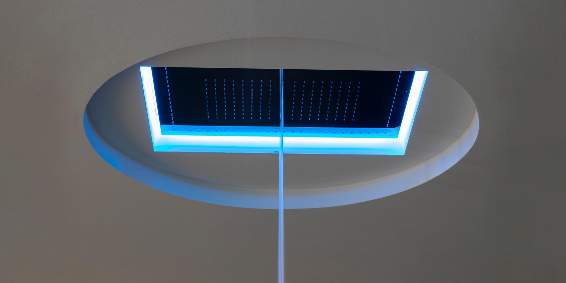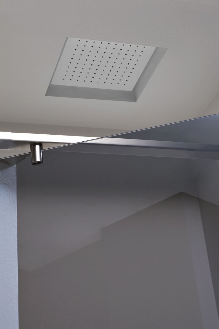 Encased showerhead available in various finishes, with possible rgb led lighting and waterproof remote control.
