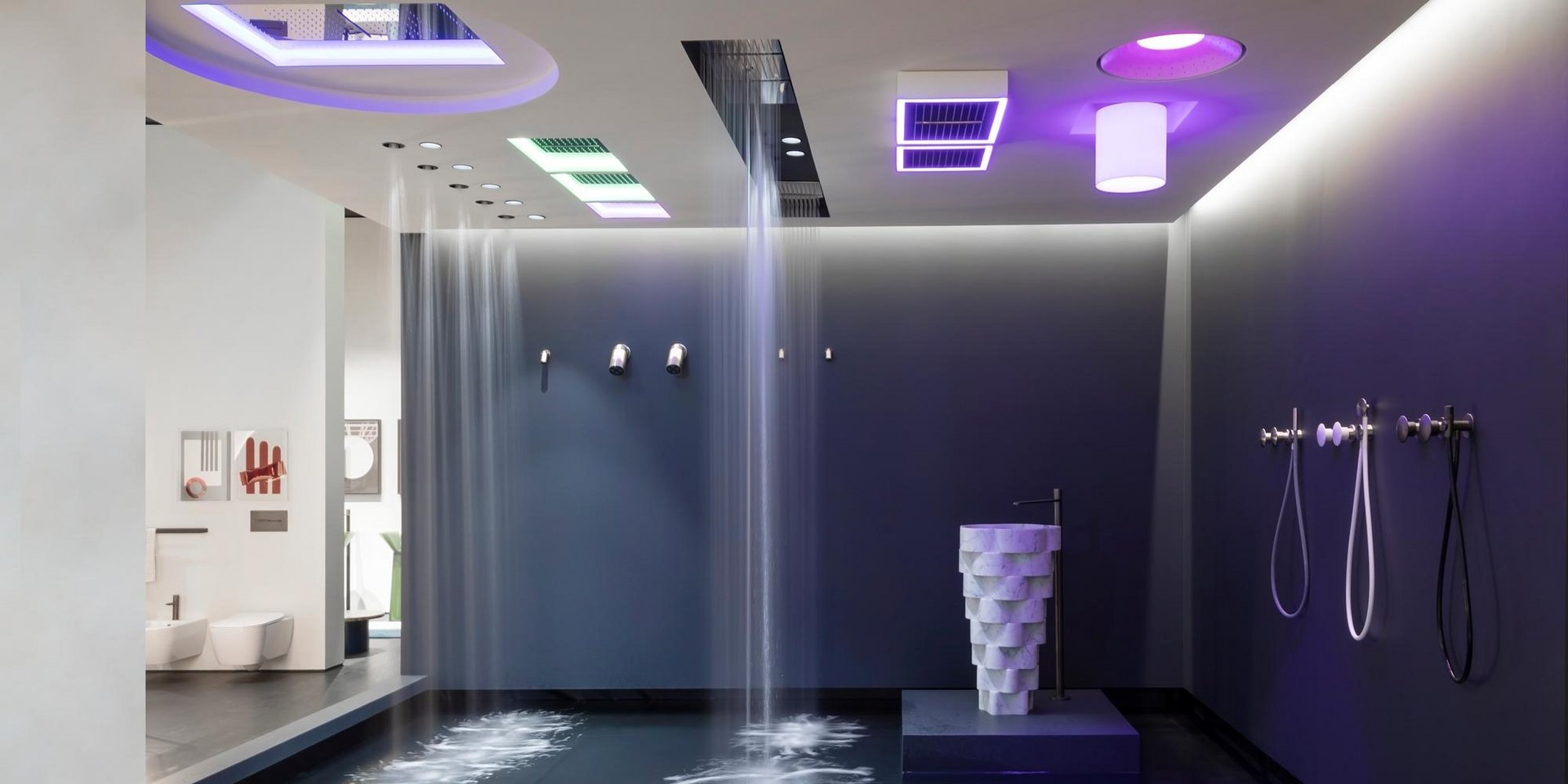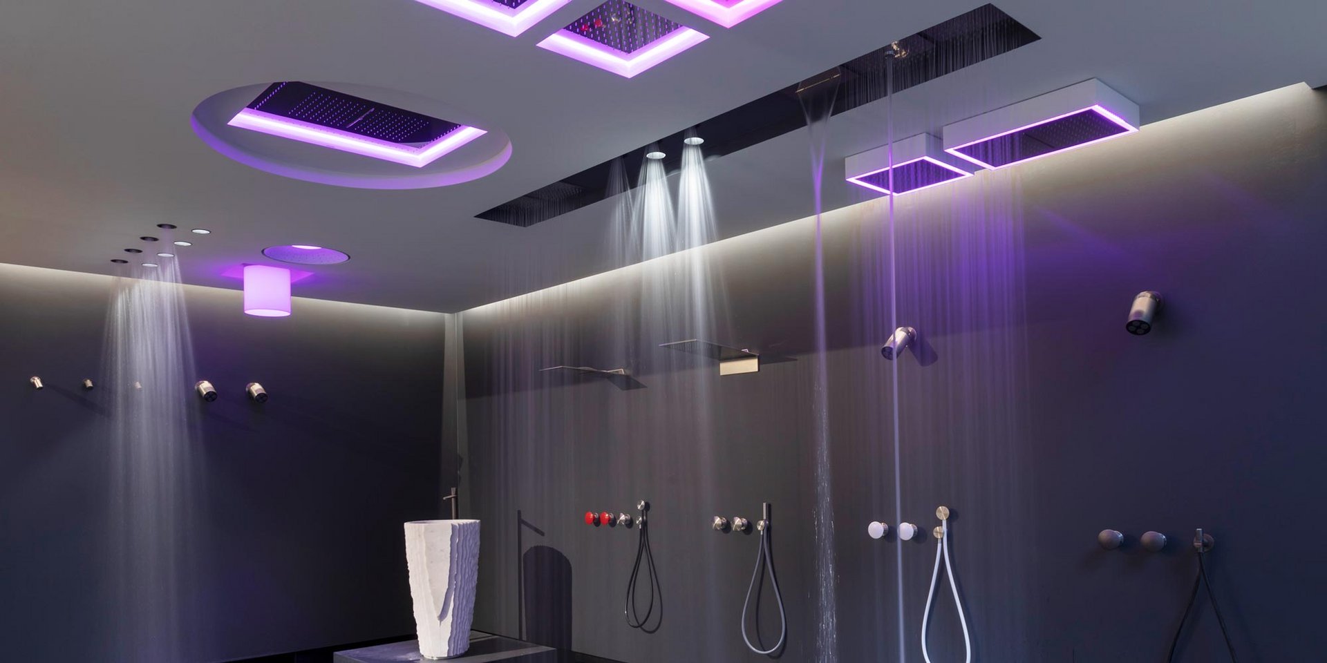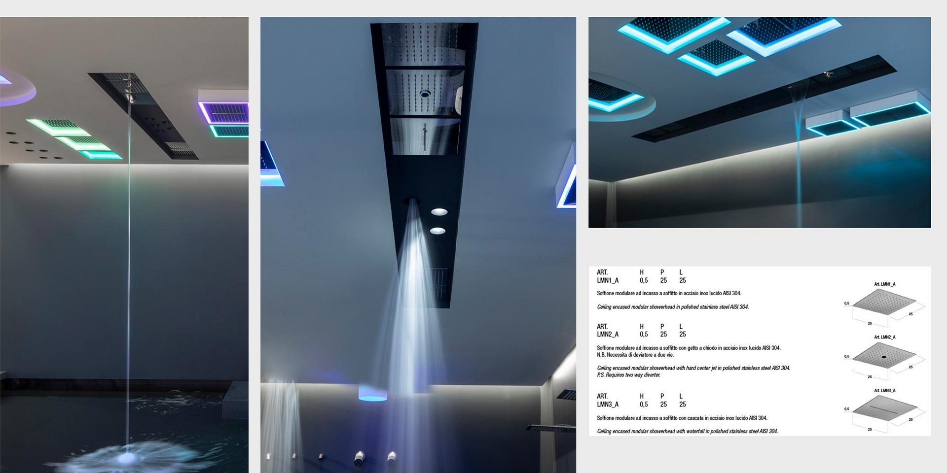 Encased modular showerhead with waterfall in polished stainless steel AISI 304.