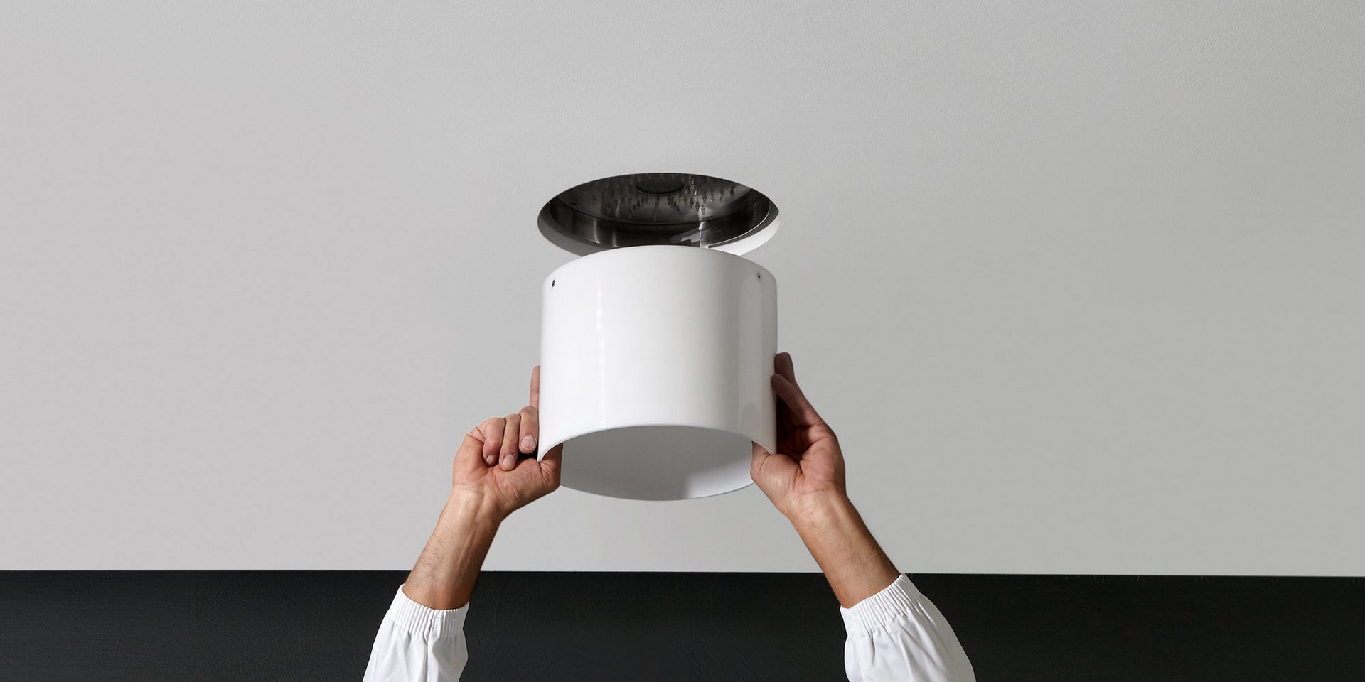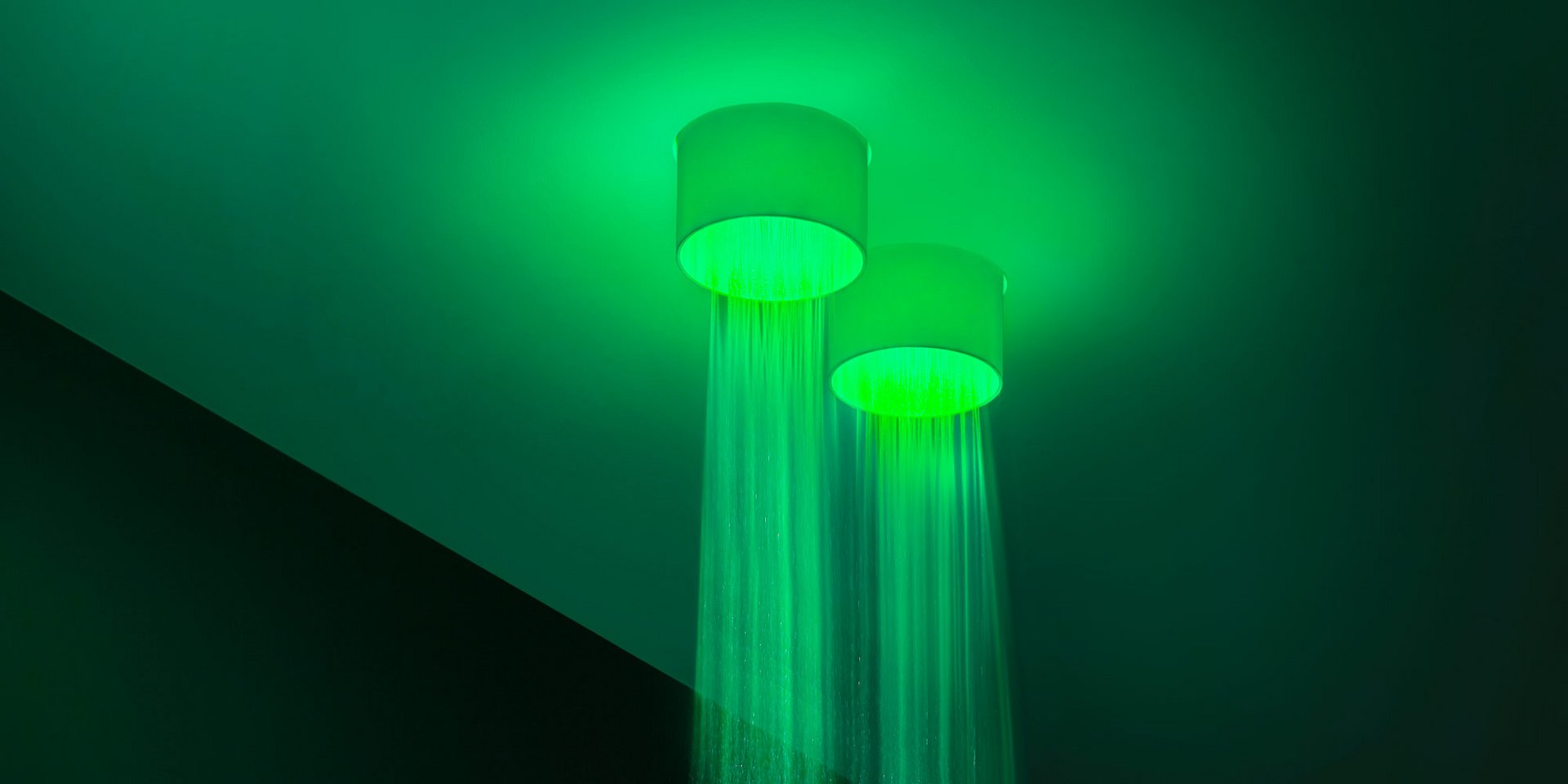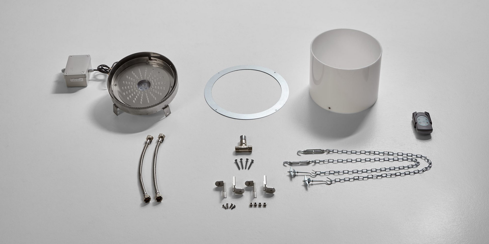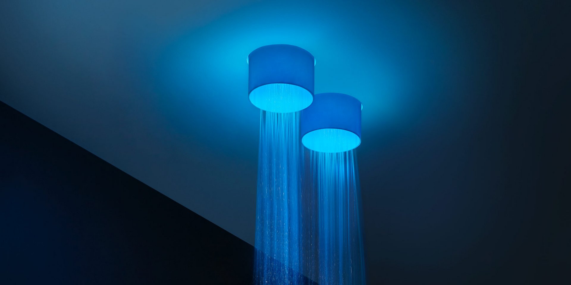 Ceiling mounted shower head in stainless steel AISI 304, complete with diffuser in opal acrylic and LED lighting RGB including waterproof remote control.