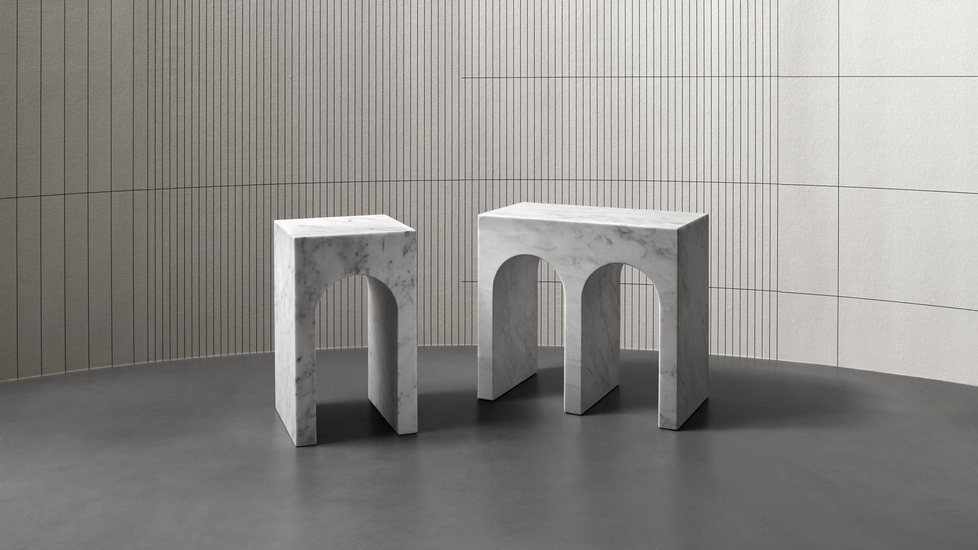 該輪廓是羅馬 EUR 區(qū)的象征“Palazzo della Civiltà Italiana”中明確無誤的輪廓,具有絕對的幾何形狀和拱形開口;材料,Bianco Carrara 大理石,指的是形狀的古典主義到宏偉的尺寸、厚度、絕對和永恒的優(yōu)雅。規(guī)模的飛躍使您可以從建筑物移動到具有風(fēng)格、連貫性和比例平衡的對象。這就是 Roma 咖啡桌系列的誕生方式,它不僅可以作為浴室中的珍貴盟友,還可以作為床頭柜或帶精致家具的起居室。提供單人或雙人版本。
