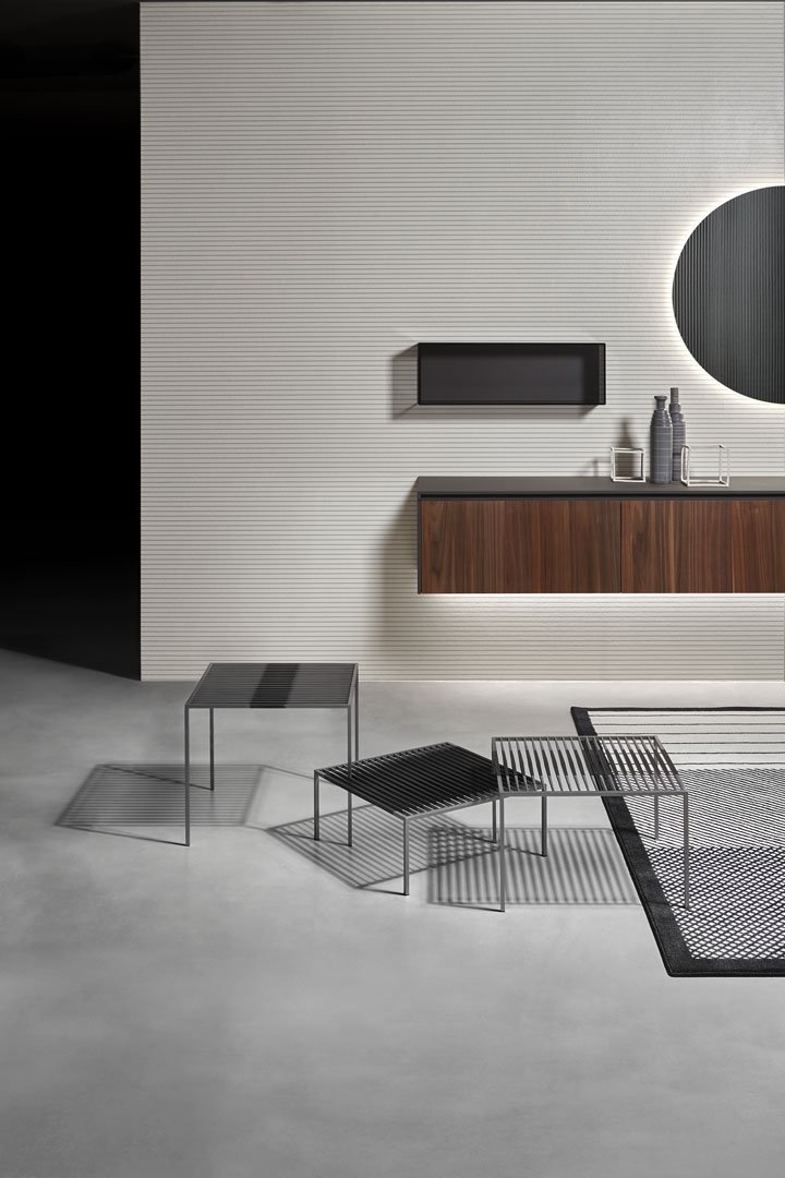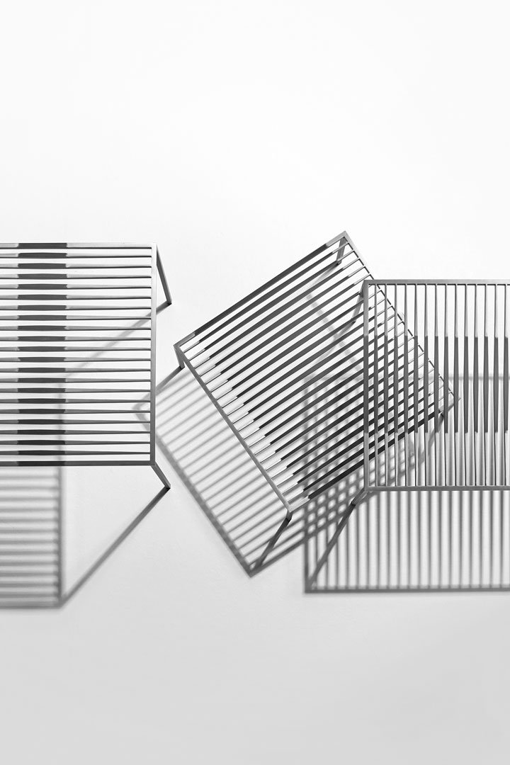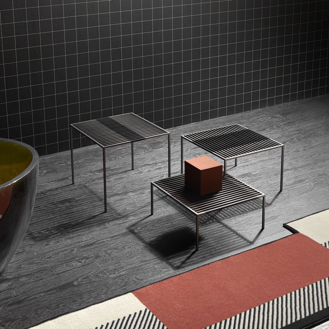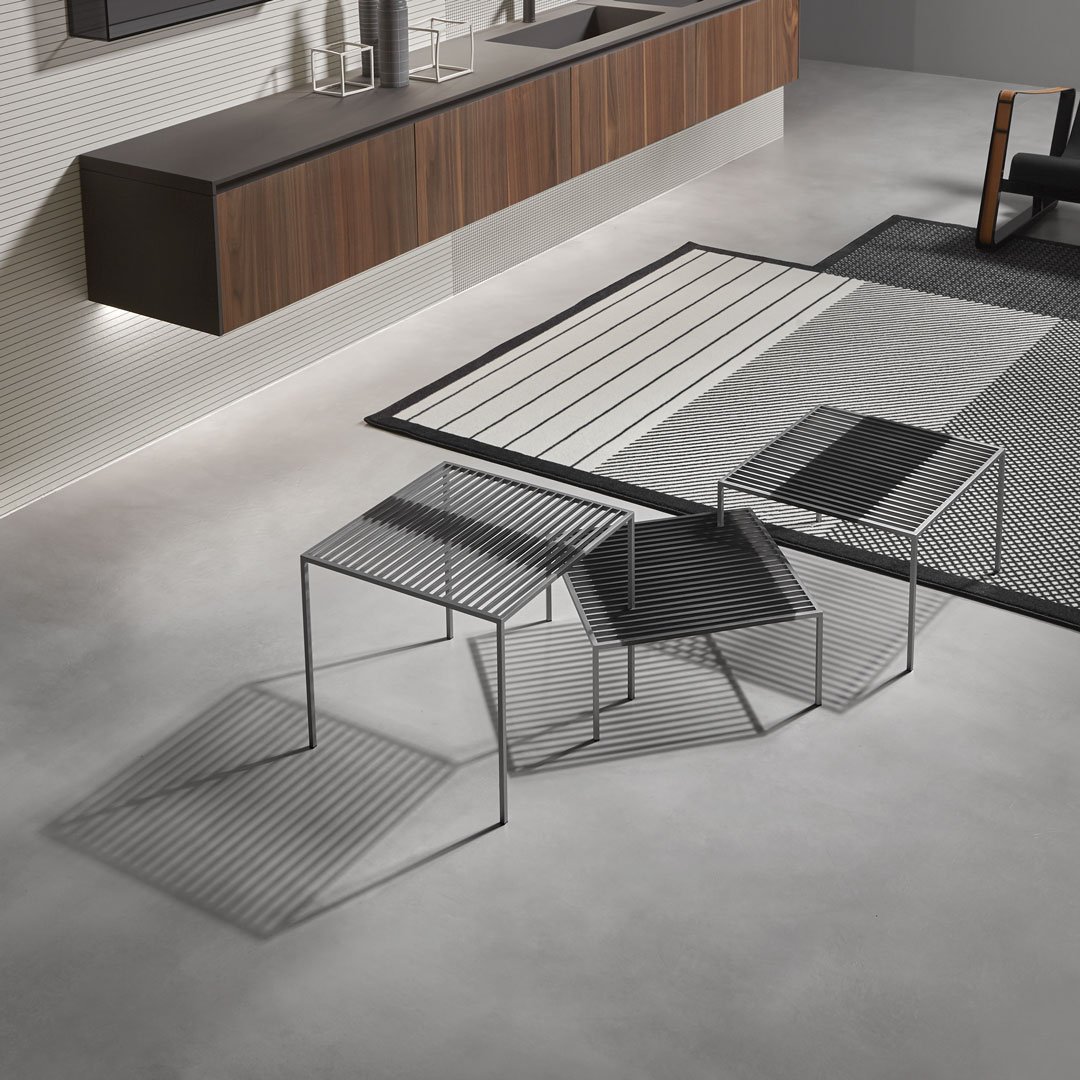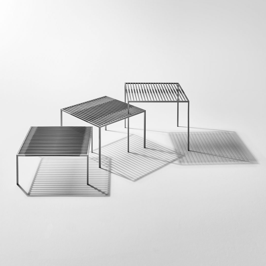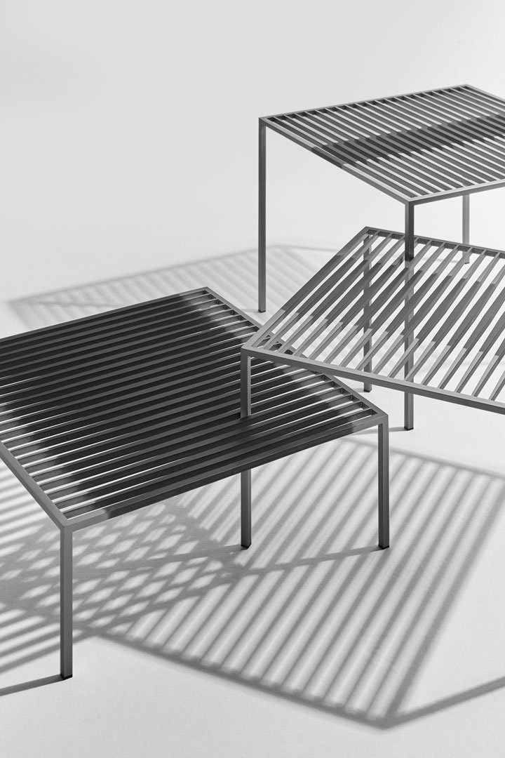 該系列的基本形狀、嚴(yán)謹(jǐn)?shù)膸缀涡螤睢O簡設(shè)計,其表現(xiàn)力歸功于復(fù)雜的比例平衡和對鋼等獨(dú)特材料的巧妙處理。Pagine Scritte 由三張不同高度的桌子組成,通過將它們以不同的方位和方向拼接在一起并相互滲透,可以創(chuàng)造出多種組合。就像頁面上的書寫線條一樣,平行的金屬條在末端逐漸變細(xì),在中心具有更寬的部分,繪制表面以賦予三維支撐表面以生命。