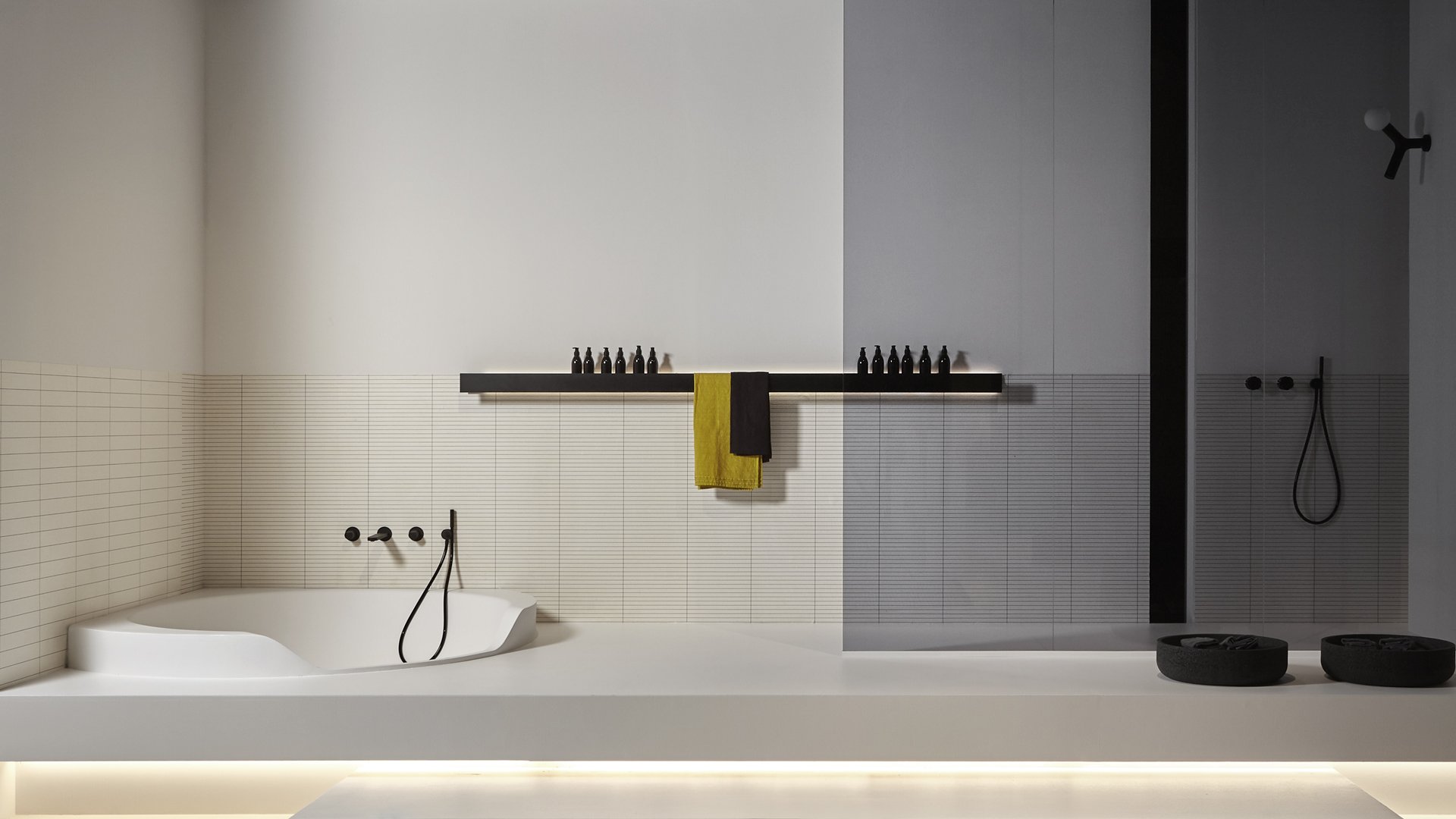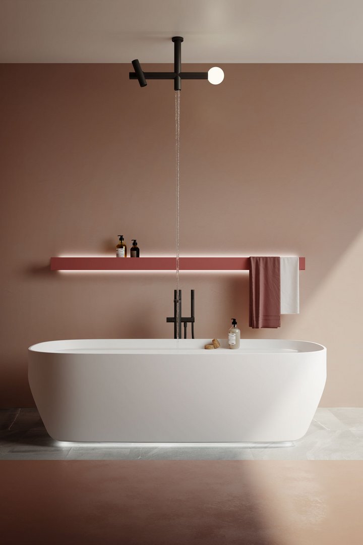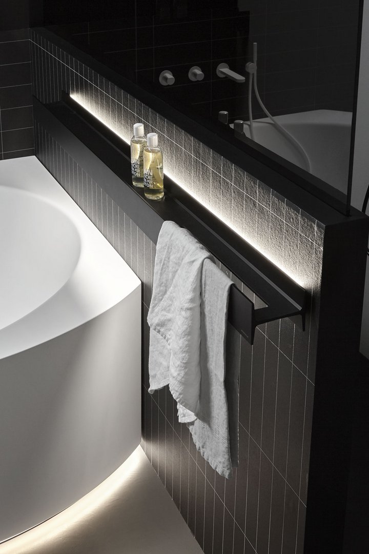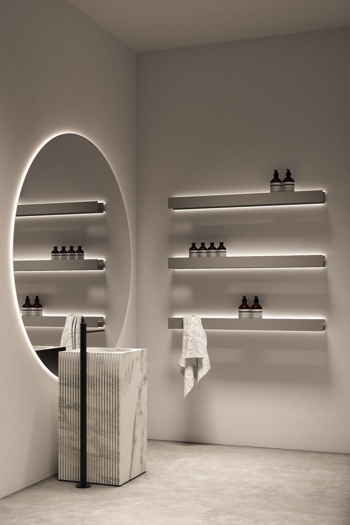 在浴室空間內(nèi),它可以最好地發(fā)揮支撐水槽區(qū)或靠近浴缸的功能,因?yàn)樗梢宰屇胖盟忻娌炕蛏眢w護(hù)理產(chǎn)品,并在必要時(shí)集成一個(gè)方便的毛巾架。如果在淋浴區(qū)內(nèi)使用,則在架子上會(huì)形成一個(gè)中央凹槽,以保證水的正常流動(dòng)。