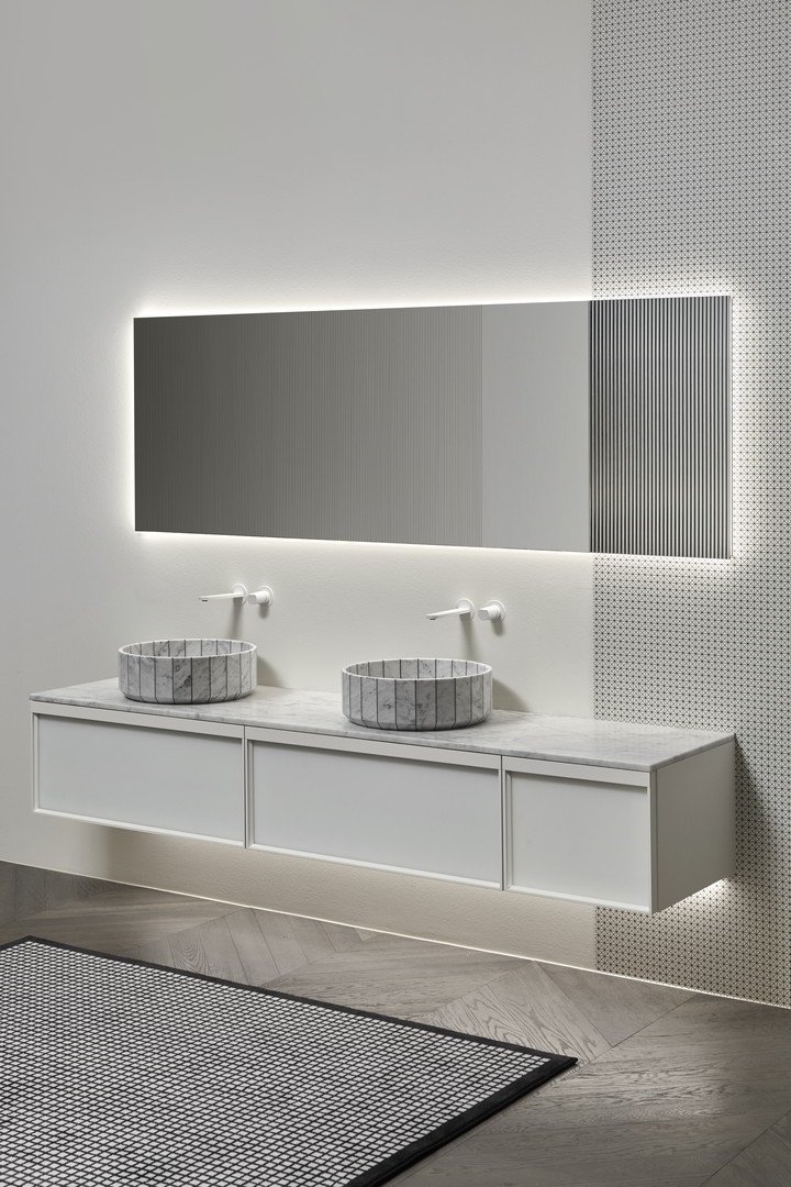 Distinto 美麗而本質(zhì),是一面由極端線條定義的鏡子,它是一個矩形物體,可以完美地融入覆蓋著 Tralerighe 壁紙的墻壁上。Distinto 浴室鏡是一款無邊單品,在兩個短邊之一上有羅紋裝飾圖案。Distinto、墻紙和光影在墻上形成有趣的對比。鏡子配有 LED 照明系統(tǒng),與光滑和棱紋鏡子之間的對比相得益彰。
