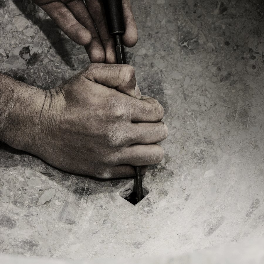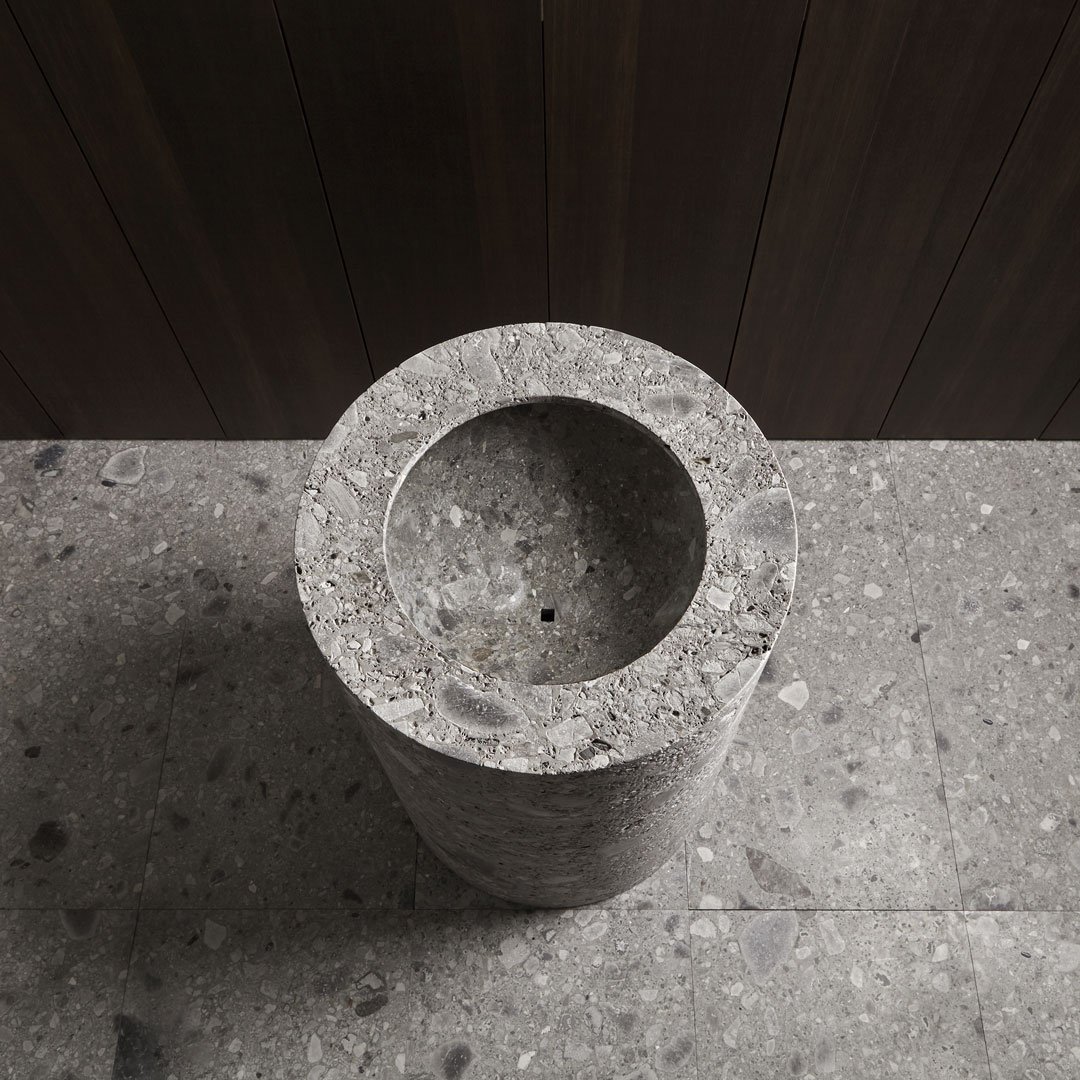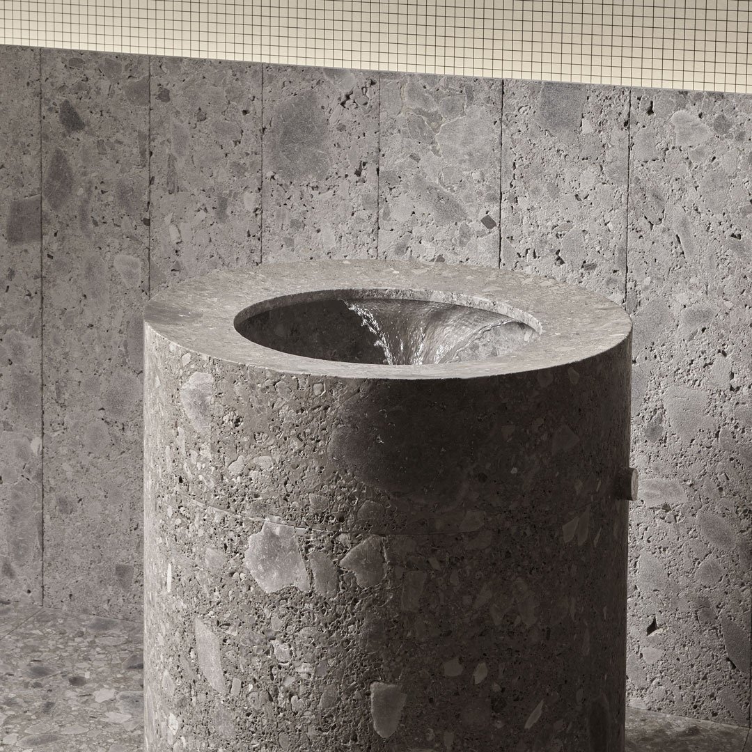 一個完全由天然石材制成的雕塑水槽,甚至傳統(tǒng)的水龍頭也消失了,變成了一個圓柱形的石頭命令。一種漸進和無聲的功能,可將其所有原始力量恢復(fù)為水。結(jié)果是一個讓人想起洗禮池原型的石柱。