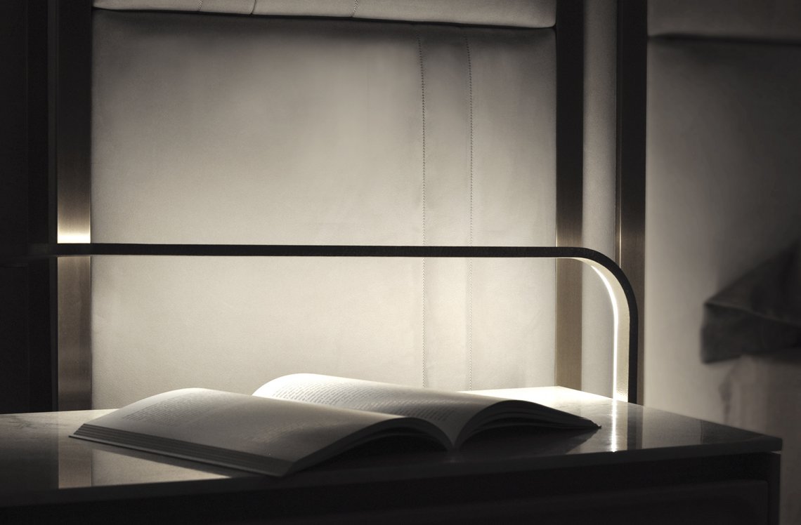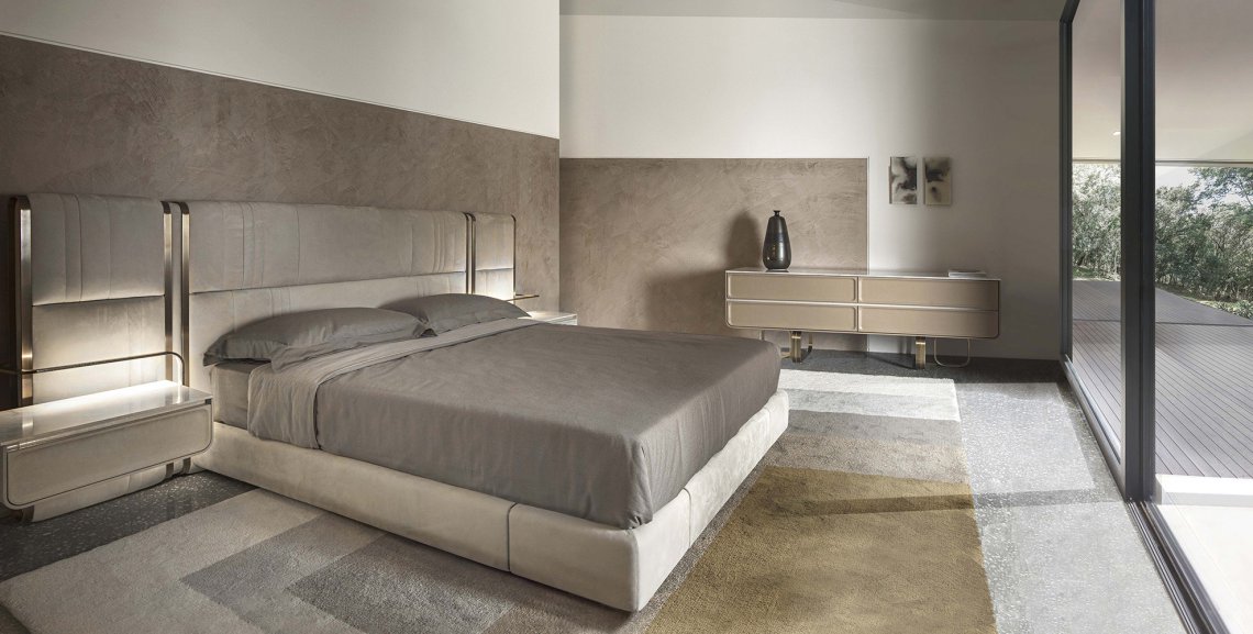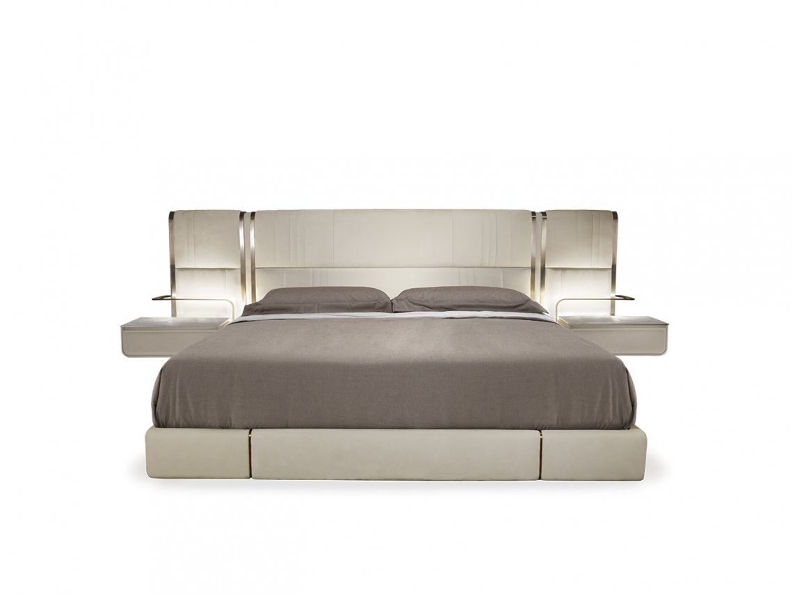 Novabed presents headboard and siderails upholstered in leather or fabric where vertical stitchings alternate with parallel seams while on lateral sides of the headboard metal details recall those that characterize the other items of this collection. This bed besides being available with standard headboard, it is available with a wider headboard that envelops the night table.
