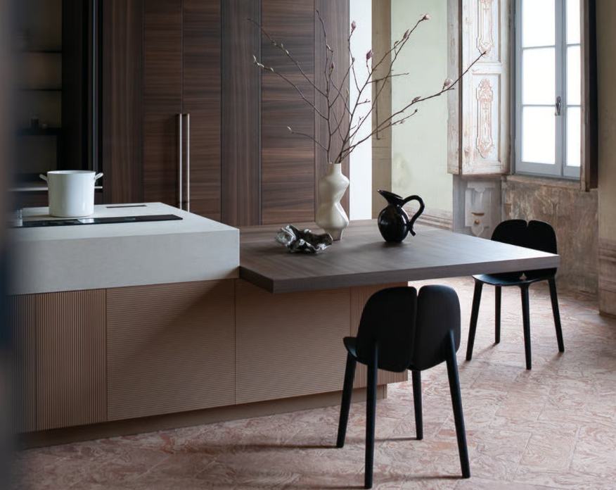 ON THE WALL AROUND the island: columns in Eucalipto Intarsio veneer with retractable door system and a passage door with 180-degree opening.? In the niche, an equipped channel with integrated lighting in a black finish and worktop in MDi Ananda.?