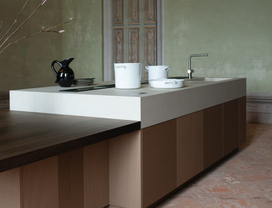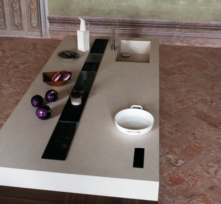 INTARSIO ISLAND with Snack Table.? Doors in structured Champagne lacquered Intarsio, worktop in MDi Ananda with integrated five-zone induction hob and touch controls on the surface.? Integrated matte black equipped channel and Snack table in bonded Eucalipto veneer.?