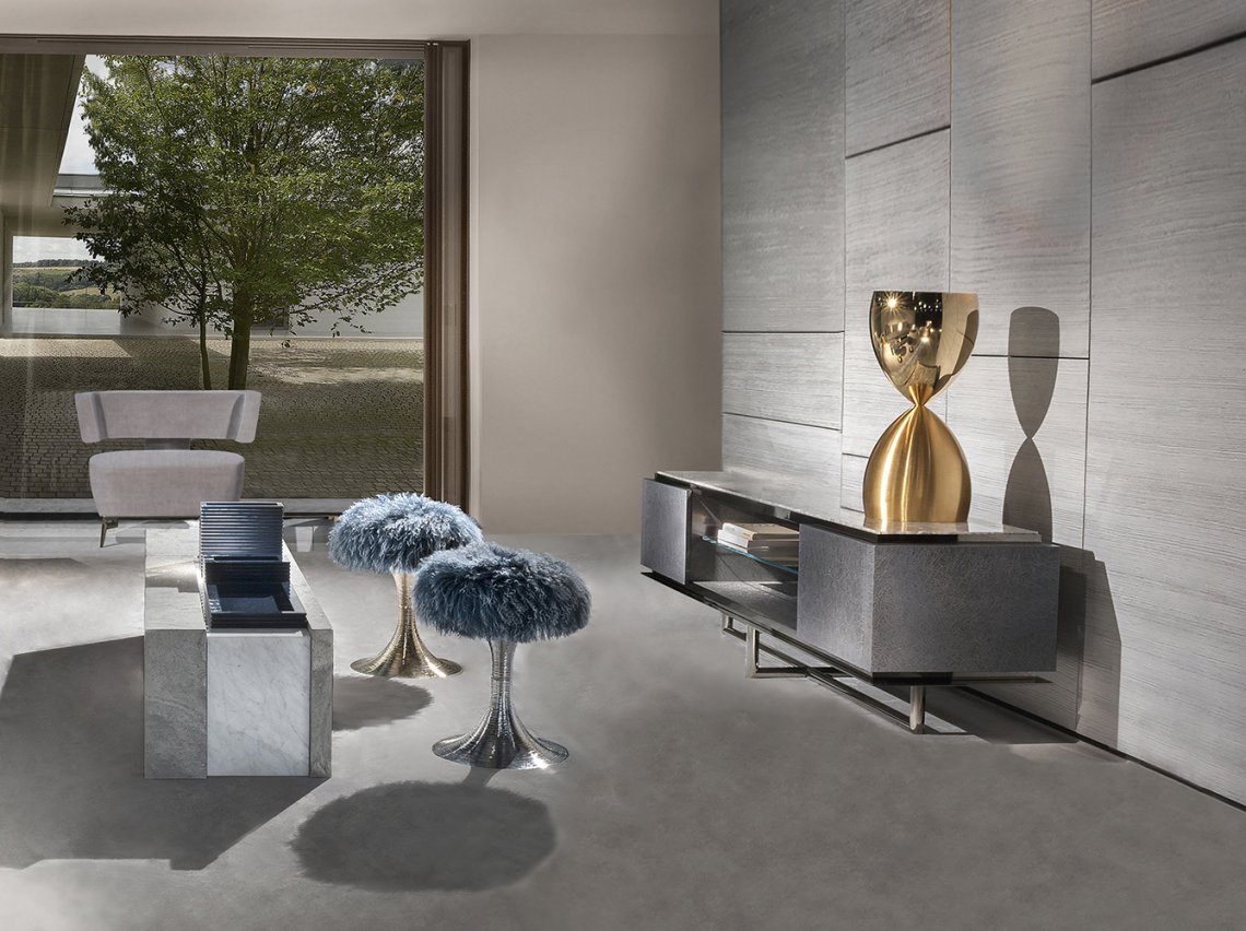 Clessidra table lamp recalls an hourglass where the light comes out from the upper part creating a refined atmosphere thanks to its light beam. It is available in gold metal, one side with shiny surface and one side with matt surface and it can be considered more than a table lamp representing an important accessory in a living room or bedroom.