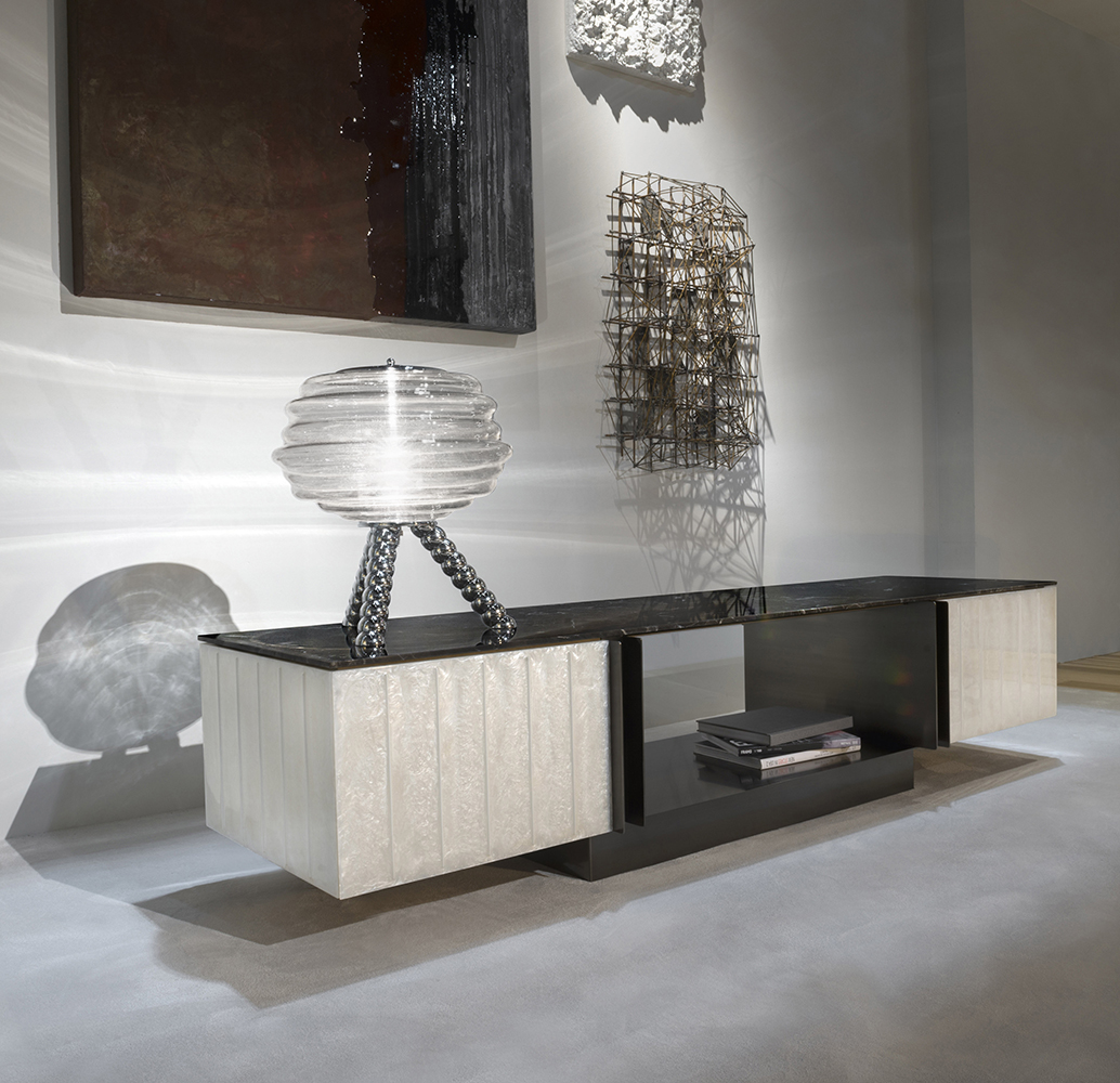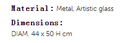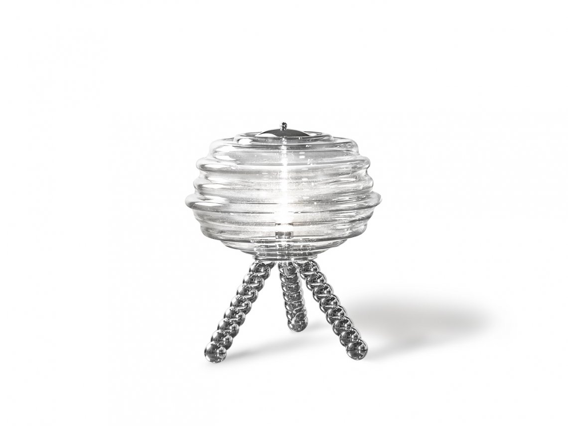 Table lamp Cooper is composed by three metal legs that merge at the base of a glass blown element realized by master glassmakers in Venice area. The light comes out through the glass exalting its preciousness in terms of colour and shape while the metal part is realized as if they were a chain made up of little spheres.