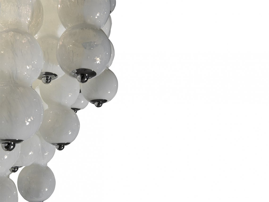 In chandelier Opalino a cascade of glass spheres are assembled at different heights on a metal plate: all these elements, realized by master glassmakers following the glassblowing technique, once enlightened create a play of lights in the surrounding room.