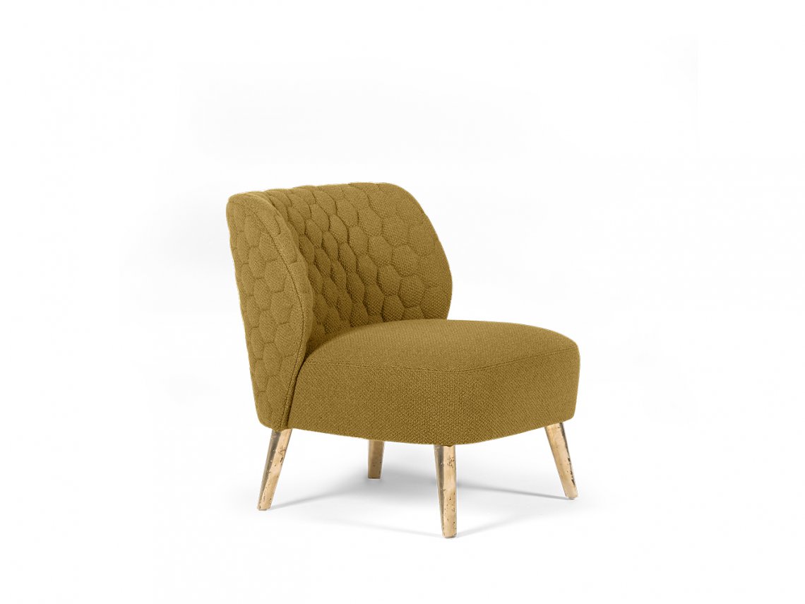 The enveloping and comfortable armchair Marilou can be upholstered only with selected textured fabrics. The backside is characterized by a quilting embroidered with hexagonal design. The bronze metal legs are realized with the ancient sand casting technique that conveys an artistic touch to the armchair.