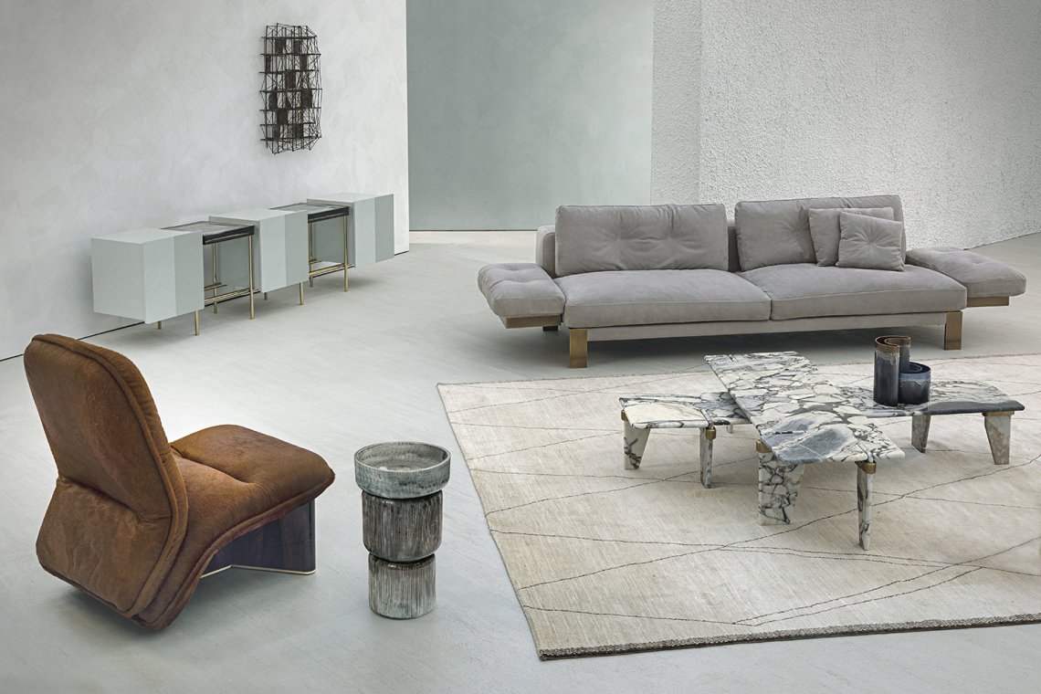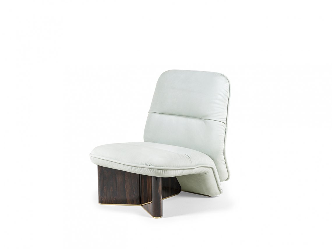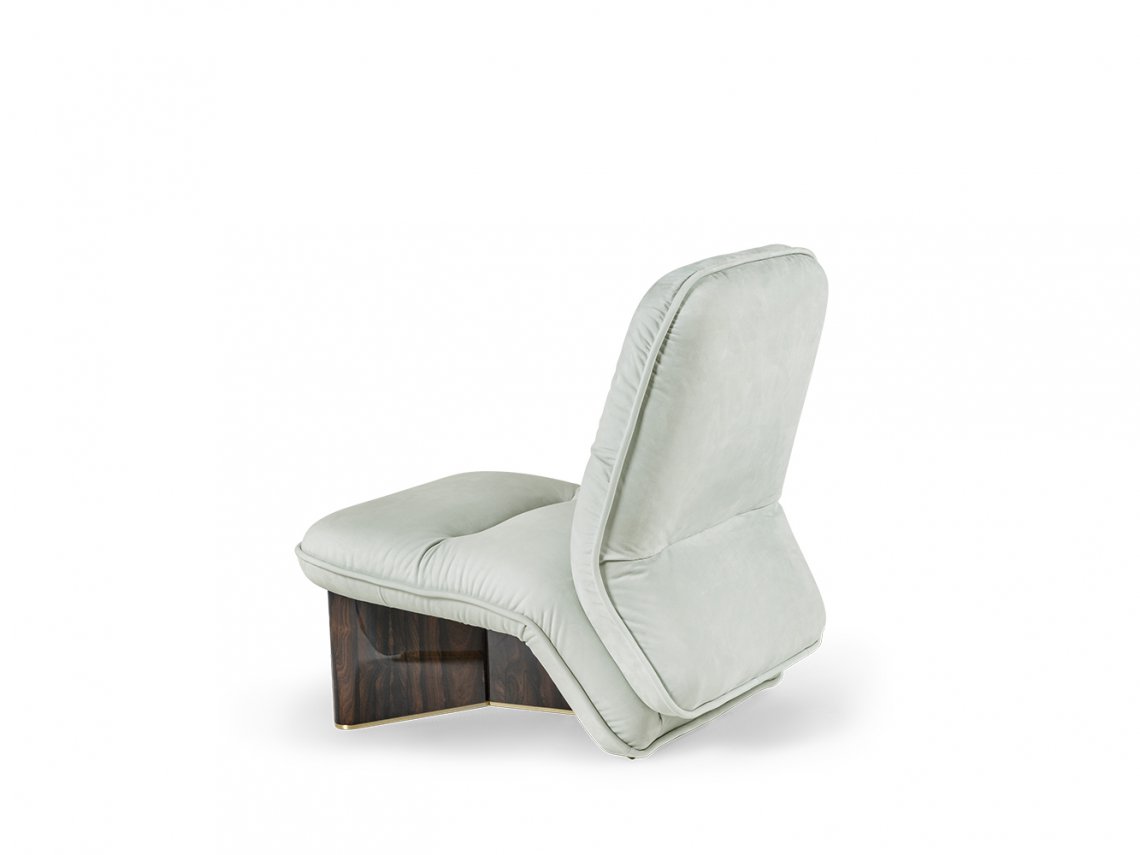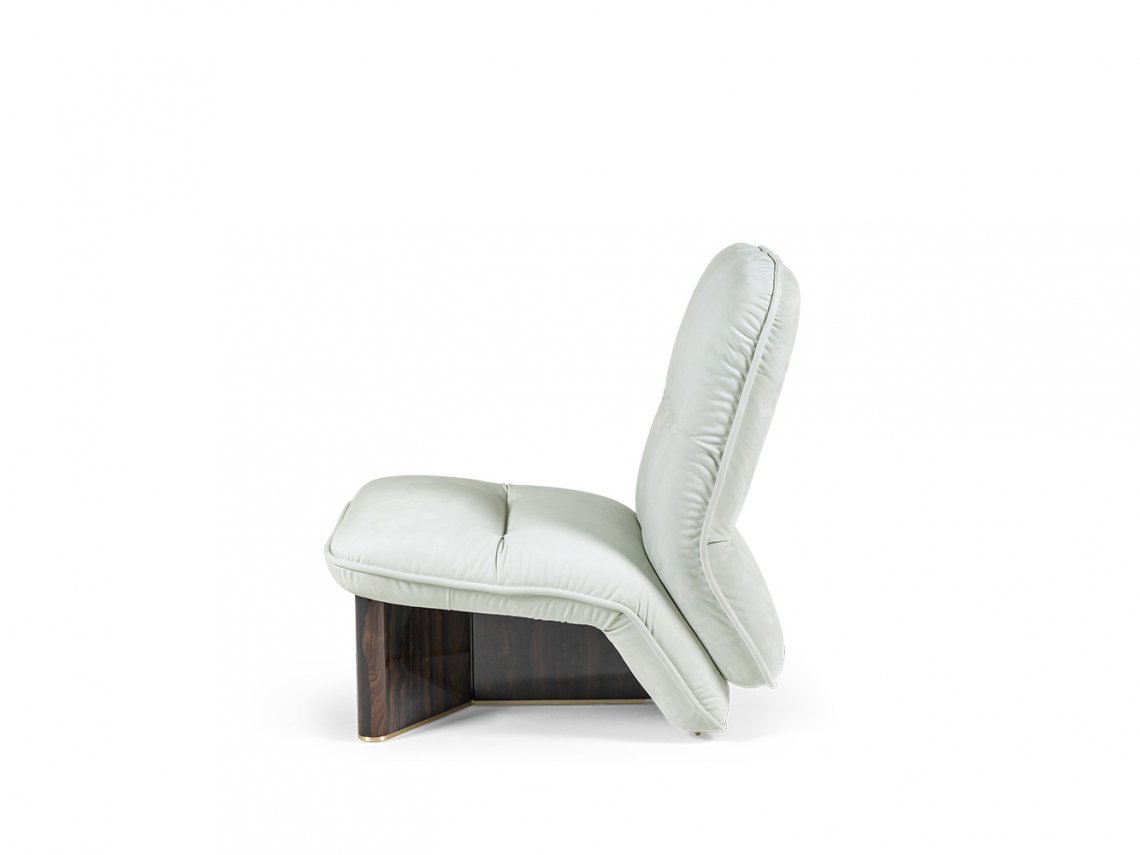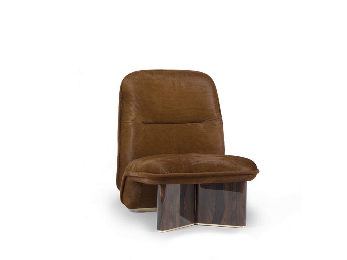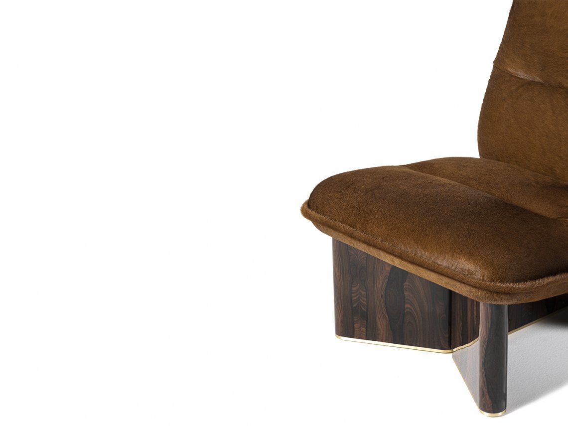 The armchair Ypsilon is the result of the union of two upholstered elements, seat and backside that are perfectly symmetrical. The bovine leather with pony look covers the whole structure. The same ypsilon shape is also recognizable in the base covered with precious ziricote wood and metal details in matt gold finish
