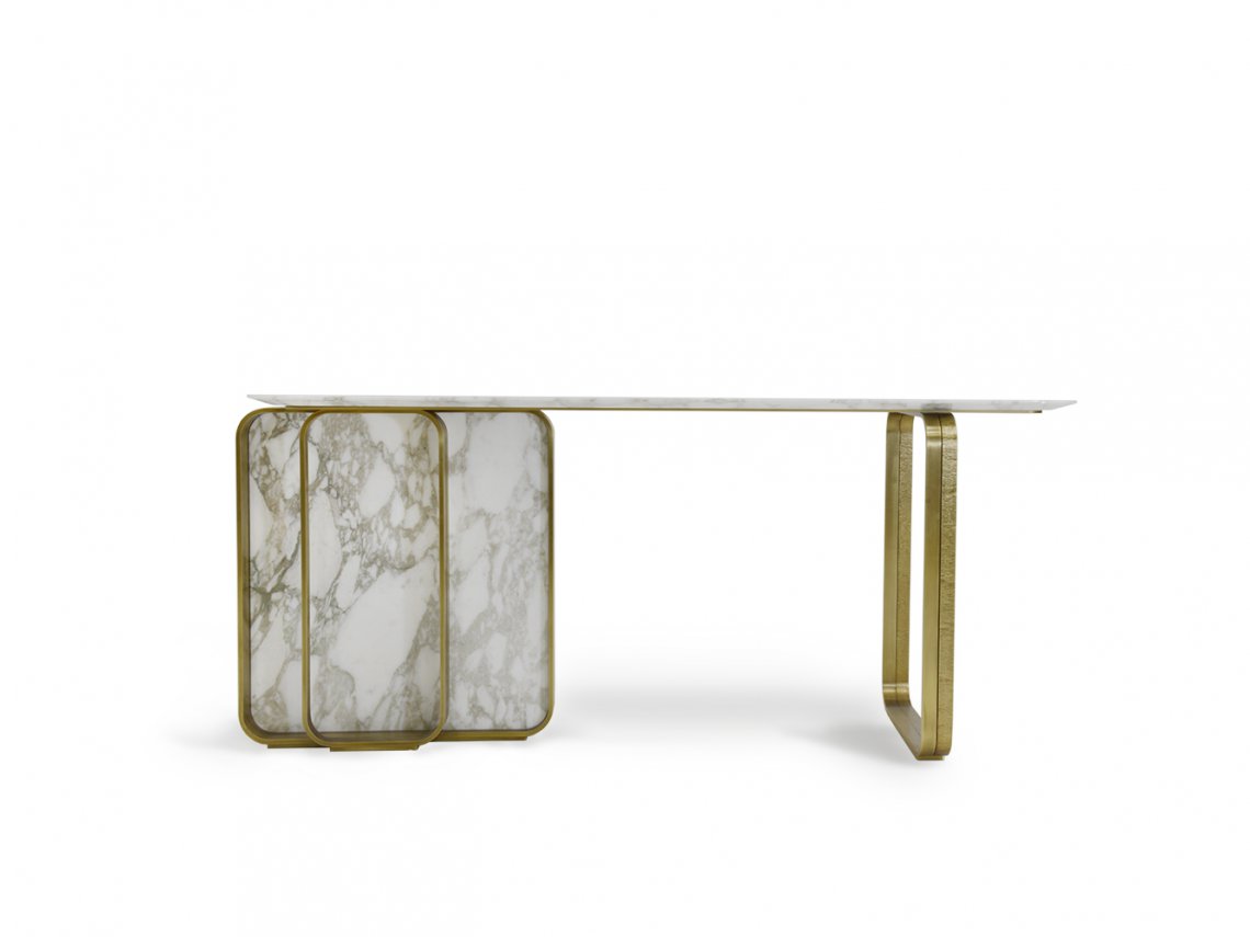 Nova console, as well as other coffee tables of this collection, is characterized by a marble top that becomes thinner along the border with rounded corners. The strong point of this piece is represented by precious metal base that envelopes a vertical marble slab.