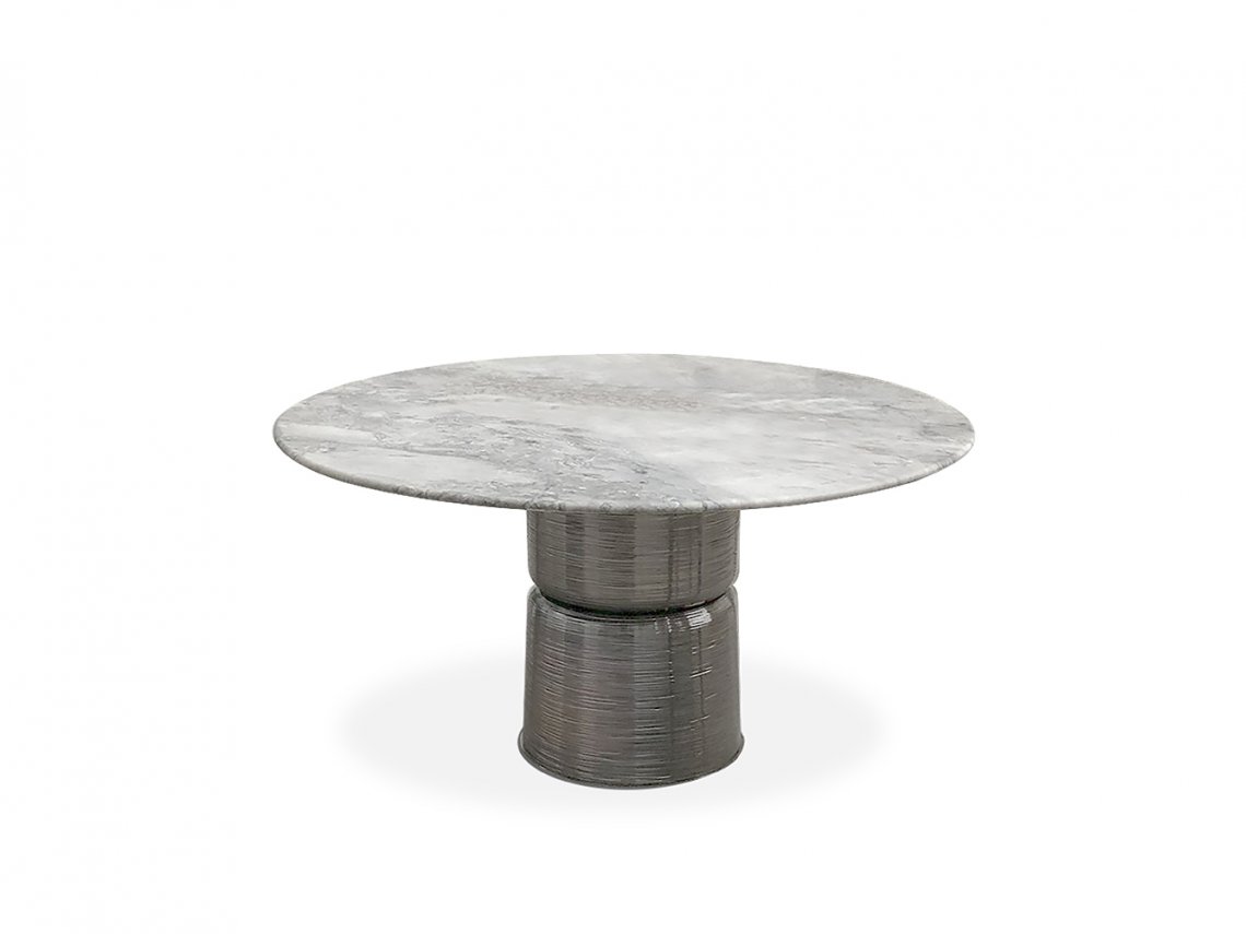 Refinement and elegance find their balance in Lilia table which is an elegant option to furnish dining areas in city flats. The round marble top is supported by a double metal cylindrical base that shrinks in the middle and its horizontal engravings give a precious touch to the entire structure. Marbles and metal details can be chosen among many different options and the perfect harmony in the environment is achieved through the matching of this table with chairs completely upholstered with leather or fabric like Miki model.