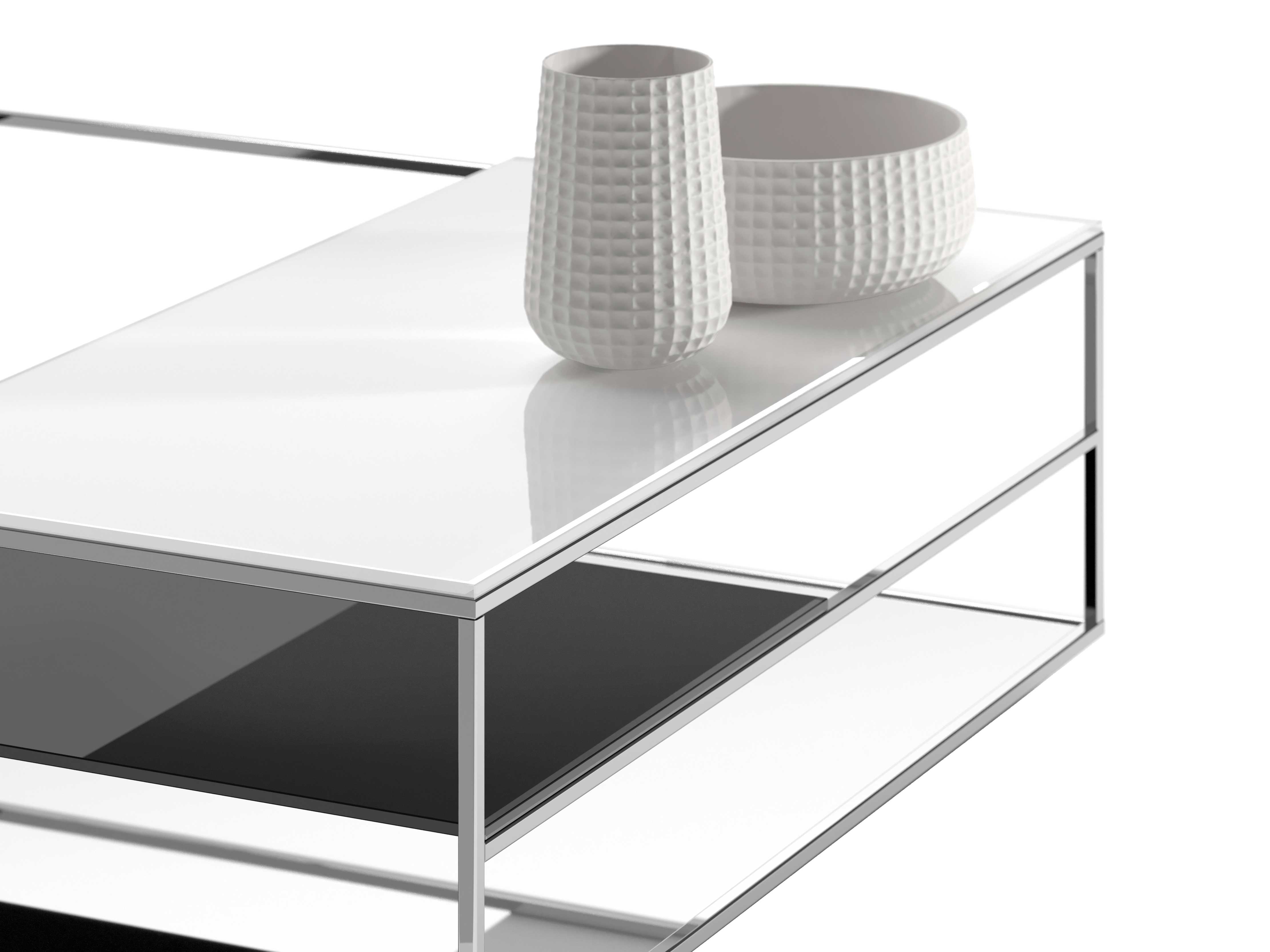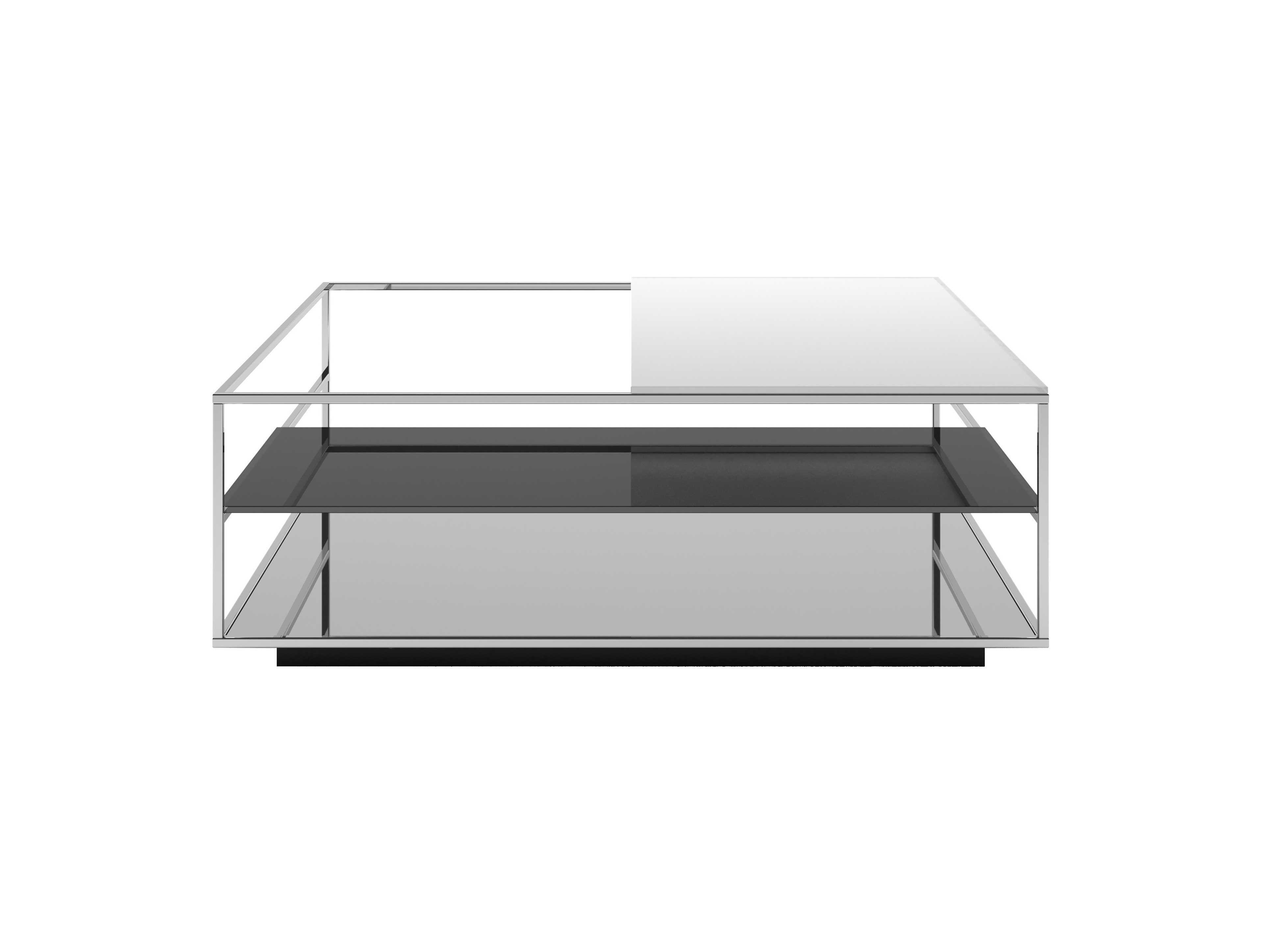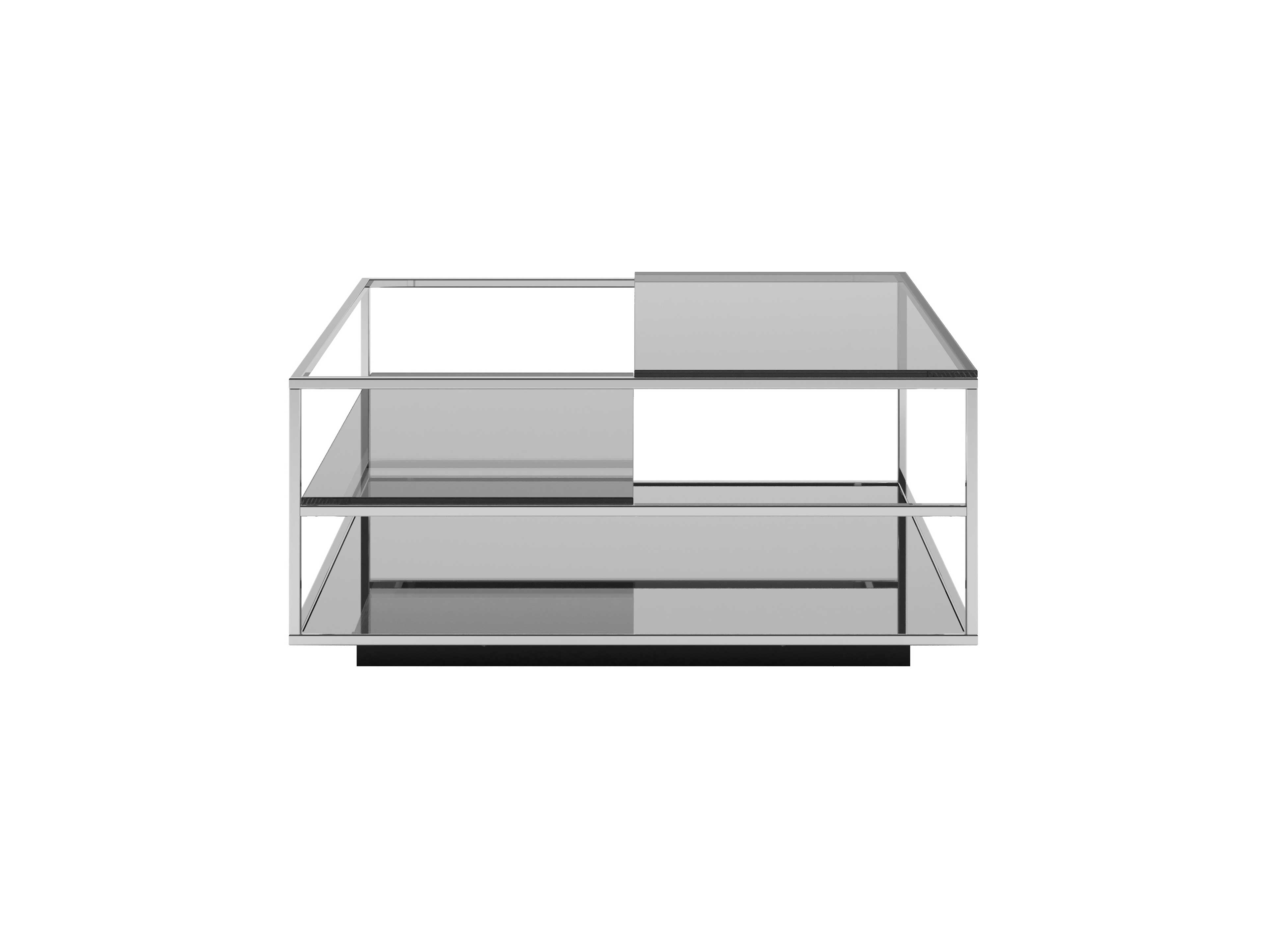 Available in two dimensions, the Floe service tables feature a structure made of squared metal tube with chromed finish and a fixed base with a mirror finish, which conveys an effect of extreme visual lightness. The name of the product, literally ?mass of floating ice?, is a refence to the effect of the glass tops and the game of reflections they crate with the mirror base, as if they were floating like the ice of the iceberg in the ocean.