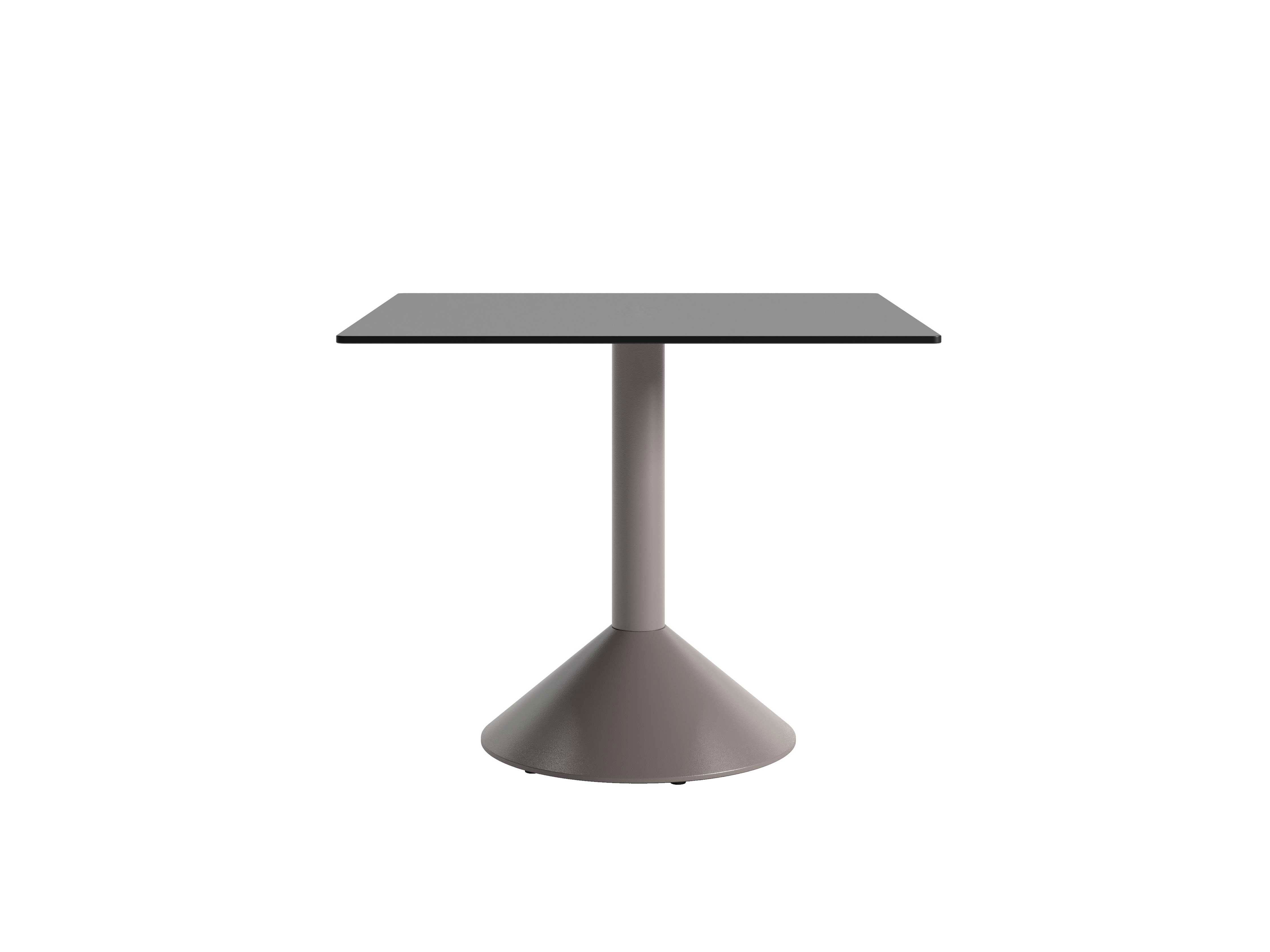 Available in different dimensions, this collection of tables features a conical metal base, evoking the original design of the armchair, with embossed powdered coating in a selection of colours. The round and square tops are made of oak veneered wood, in a natural or black-stained finish, or high-pressure laminate in white or black colour.