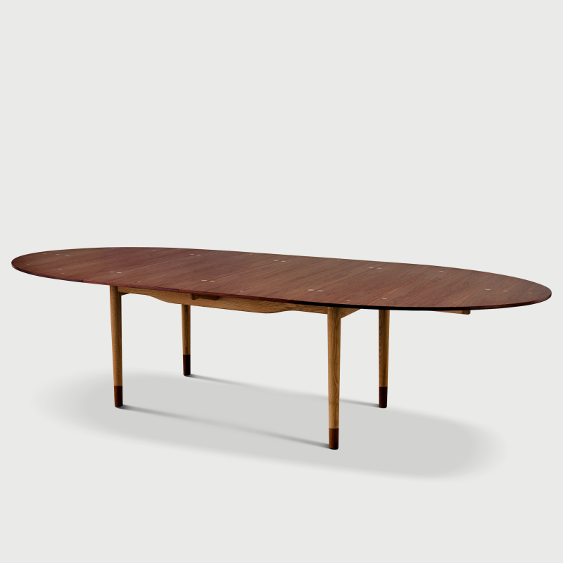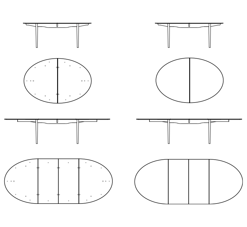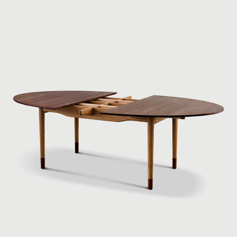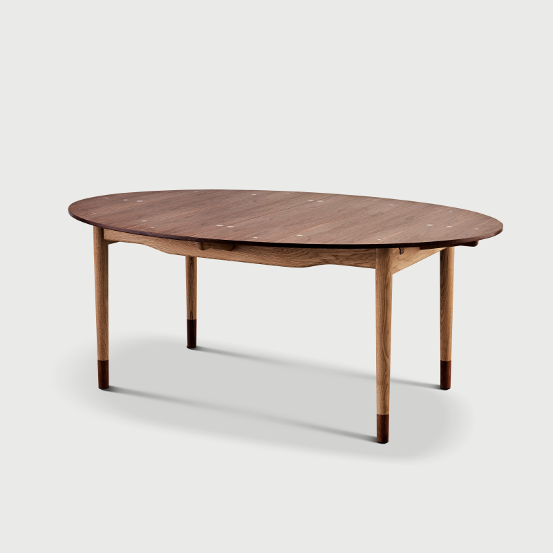 Materials: Tabletop in veneer or linoleum with solid edges. Incl. two extension leaves. Top: Oak - Frame: Oak Top: Walnut - Frame: Walnut Top: Walnut - Frame: Oak Top: Linoleum - Frame: Oak Top: Linoleum - Frame: Walnut