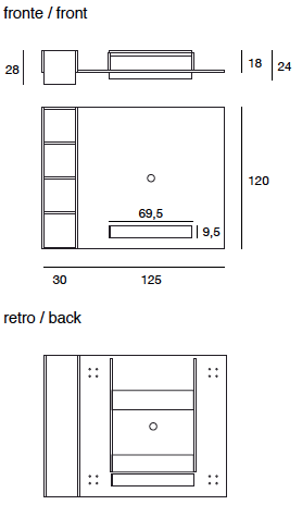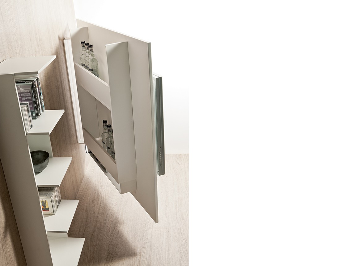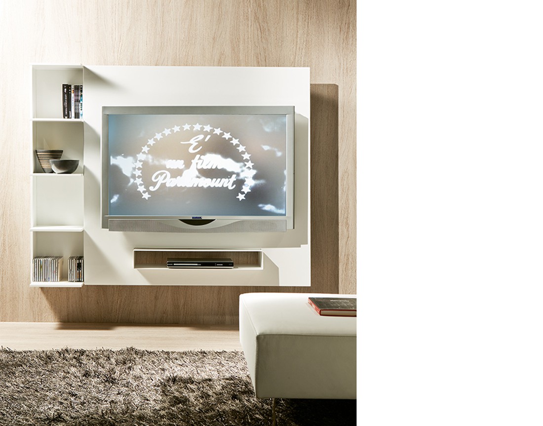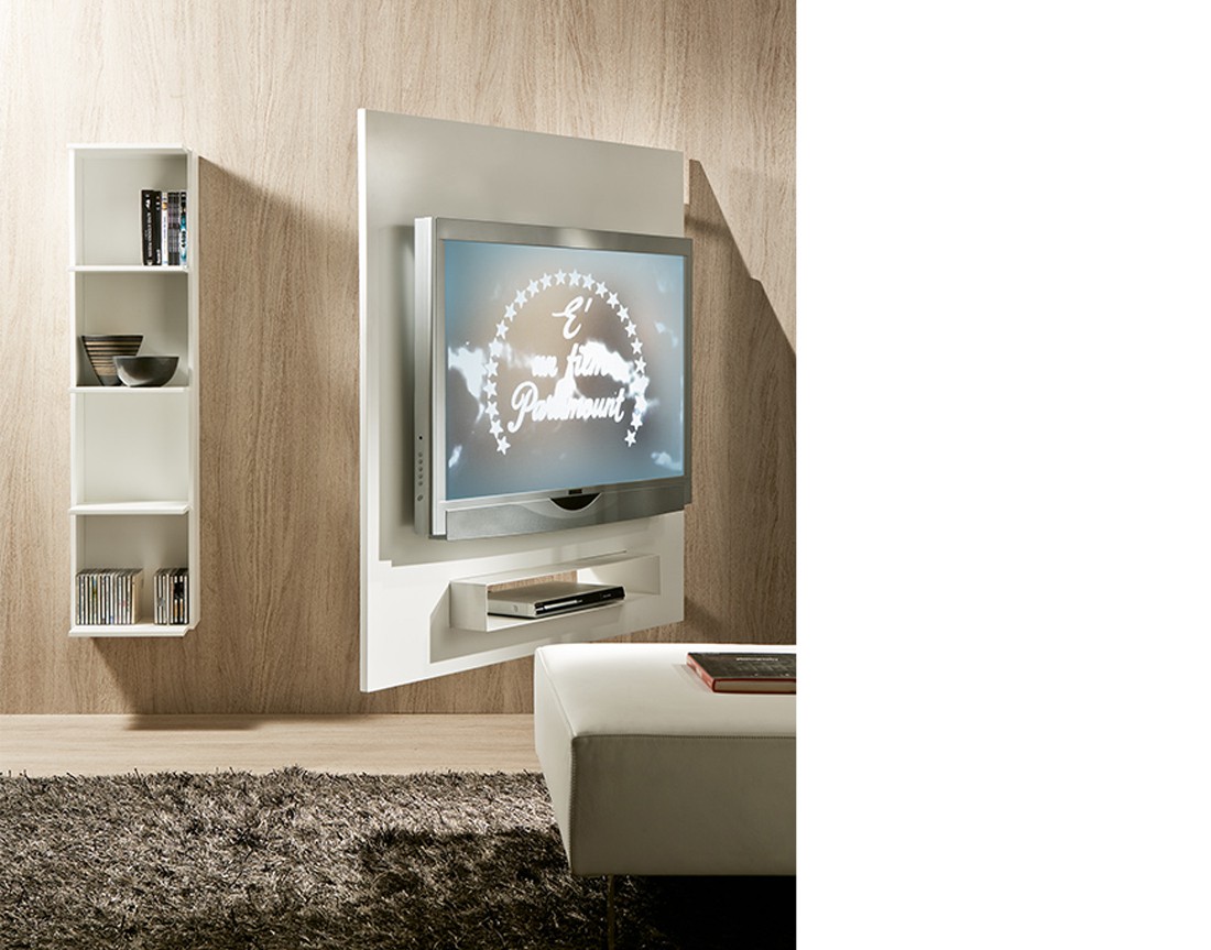 Porta tv orientabile con elemento libreria placcato o in fibra di legno, posizionabile a destra o a sinistra del pannello porta tv, dotato di barra porta tv universale. Pannello apribile ed attrezzato sul retro con vani porta cd/dvd o uso bar. Particolari in metallo verniciato. Finiture disponibili: libreria WG wengé, NC noce, TB tabacco, laccato opaco poro chiuso( L1 bianco, L19 madreperla, L3 cappuccino, L5 grigio fumo, L2 nero, L4 rosso, L40 beige microgoffrato, L41 ecrù microgoffrato, L42 fango microgoffrato ); pannello laccato opaco poro chiuso( L1 bianco, L19 madreperla, L3 cappuccino, L5 grigio fumo, L2 nero, L4 rosso, L40 beige microgoffrato, L41 ecrù microgoffrato, L42 fango microgoffrato ), laccato brillante( L6 bianco, L9 madreperla, L10 cappuccino, L11 grigio fumo, L8 nero, L7 rosso).