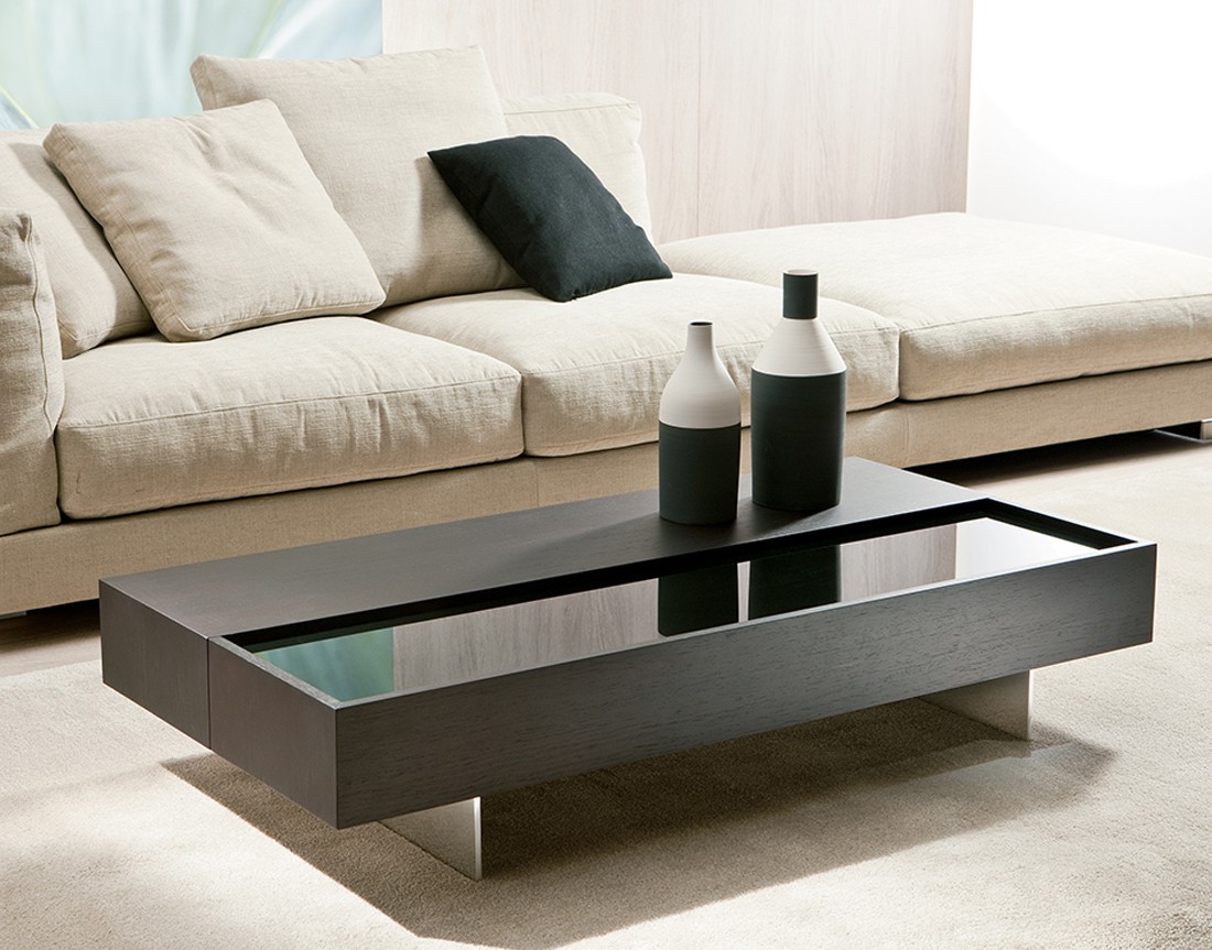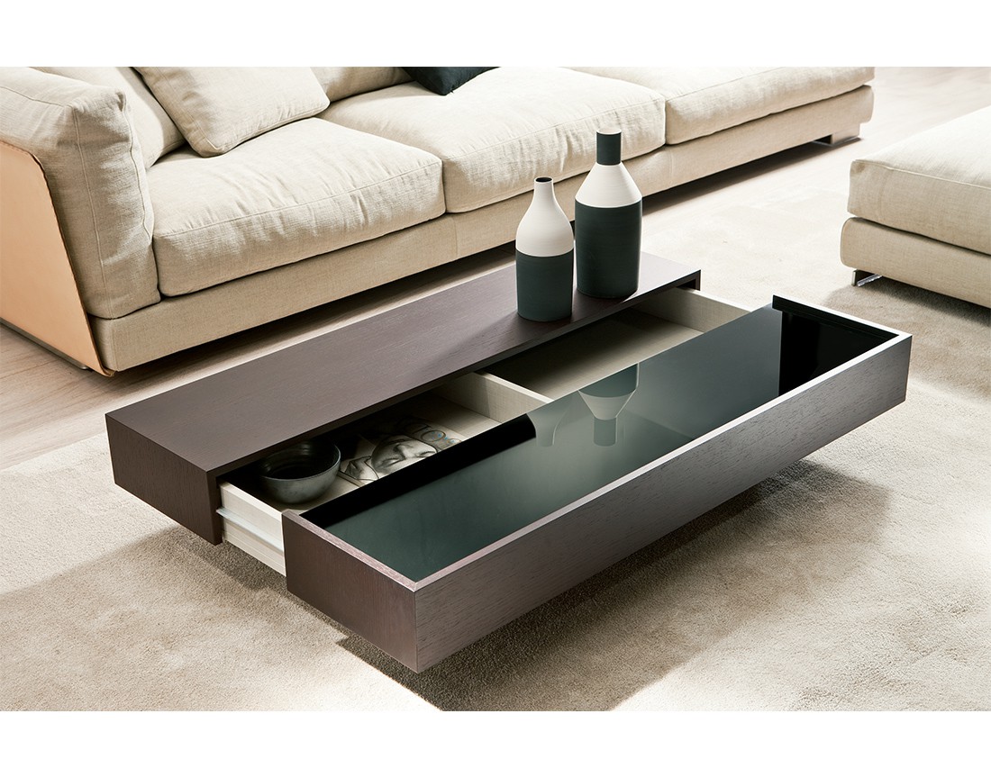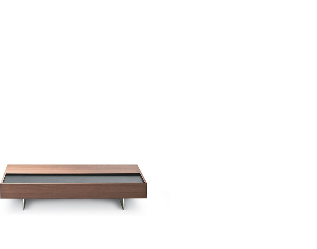 Tavolino placcato frassino con contenitore in materiale decorativo effetto tessuto. Possibilità di inserimento nel piano di vetro verniciato (extra chiaro bianco, nero o moka). Piedini in alluminio. Finiture disponibili: WG wengé, NC noce, TB tabacco, laccato opaco poro aperto ( L21 bianco, L29 madreperla, L23 cappuccino, L25 grigio fumo, L22 nero, L24 rosso ).