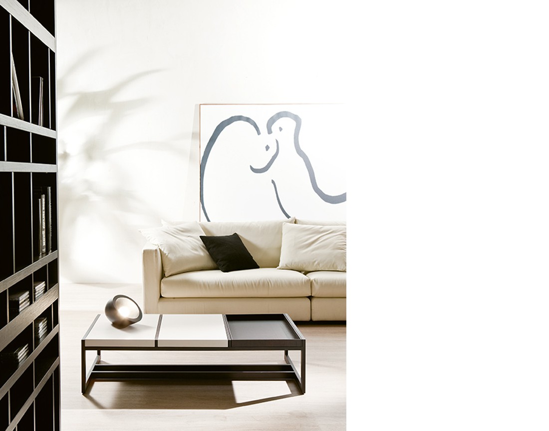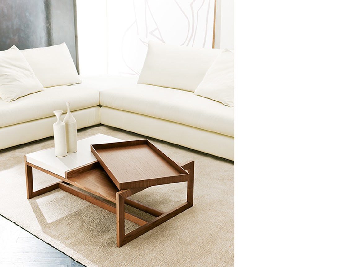 Tavolino con struttura in massello di frassino. Vassoi placcati frassino. Finiture disponibili: WG wengé, NC noce, TB tabacco, laccato opaco poro aperto ( L21 bianco, L29 madreperla, L23 cappuccino, L25 grigio fumo, L22 nero, L24 rosso ).