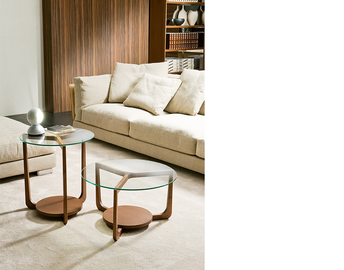 Tavolino con struttura in massello di frassino. Piano superiore in vetro naturale e piano inferiore placcato. Finiture disponibili: FN frassino naturale, WG wengé, NC noce, TB tabacco, laccato opaco poro aperto (L21 bianco, L29 madreperla, L23 cappuccino, L25 grigio fumo, L22 nero, L24 rosso).