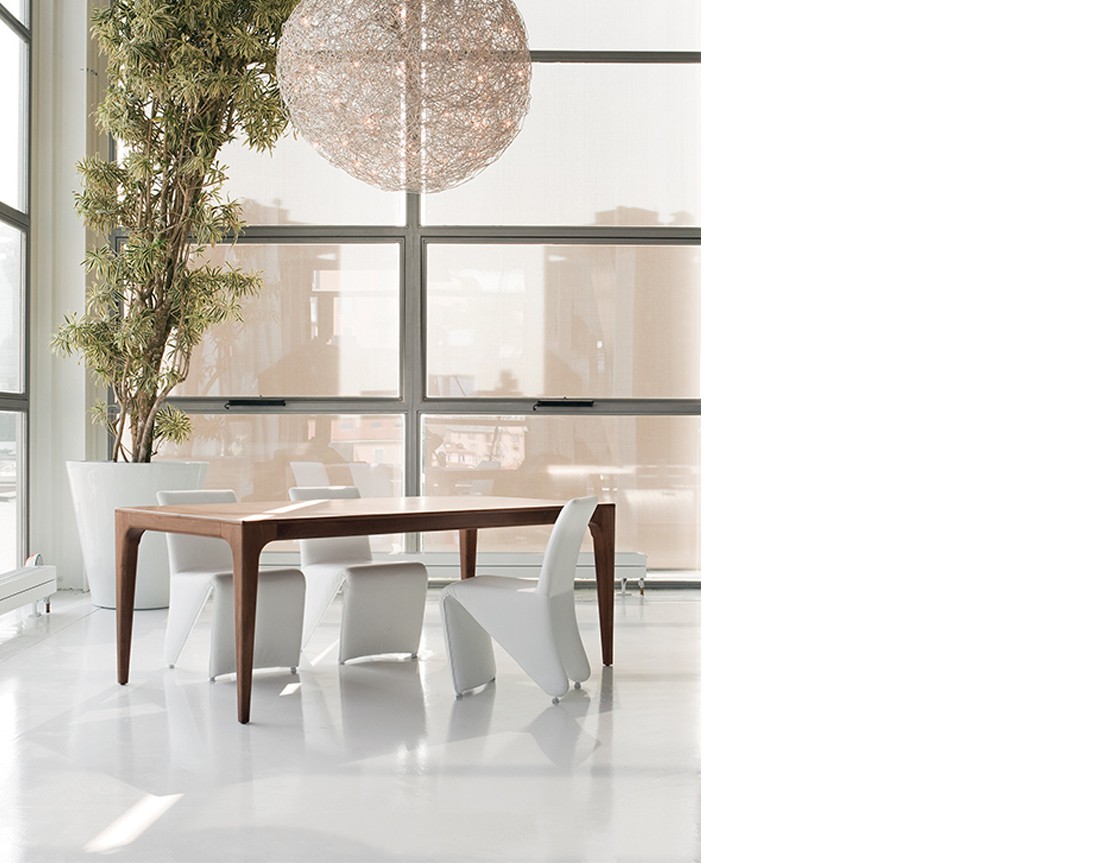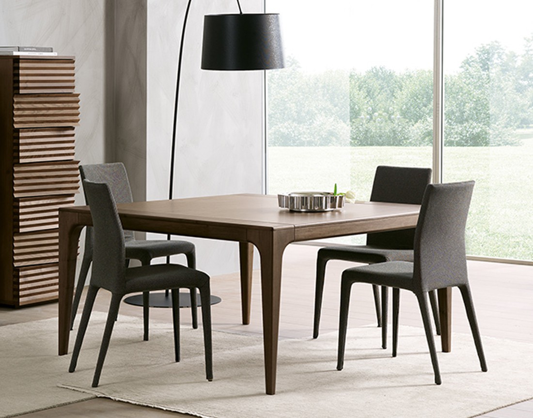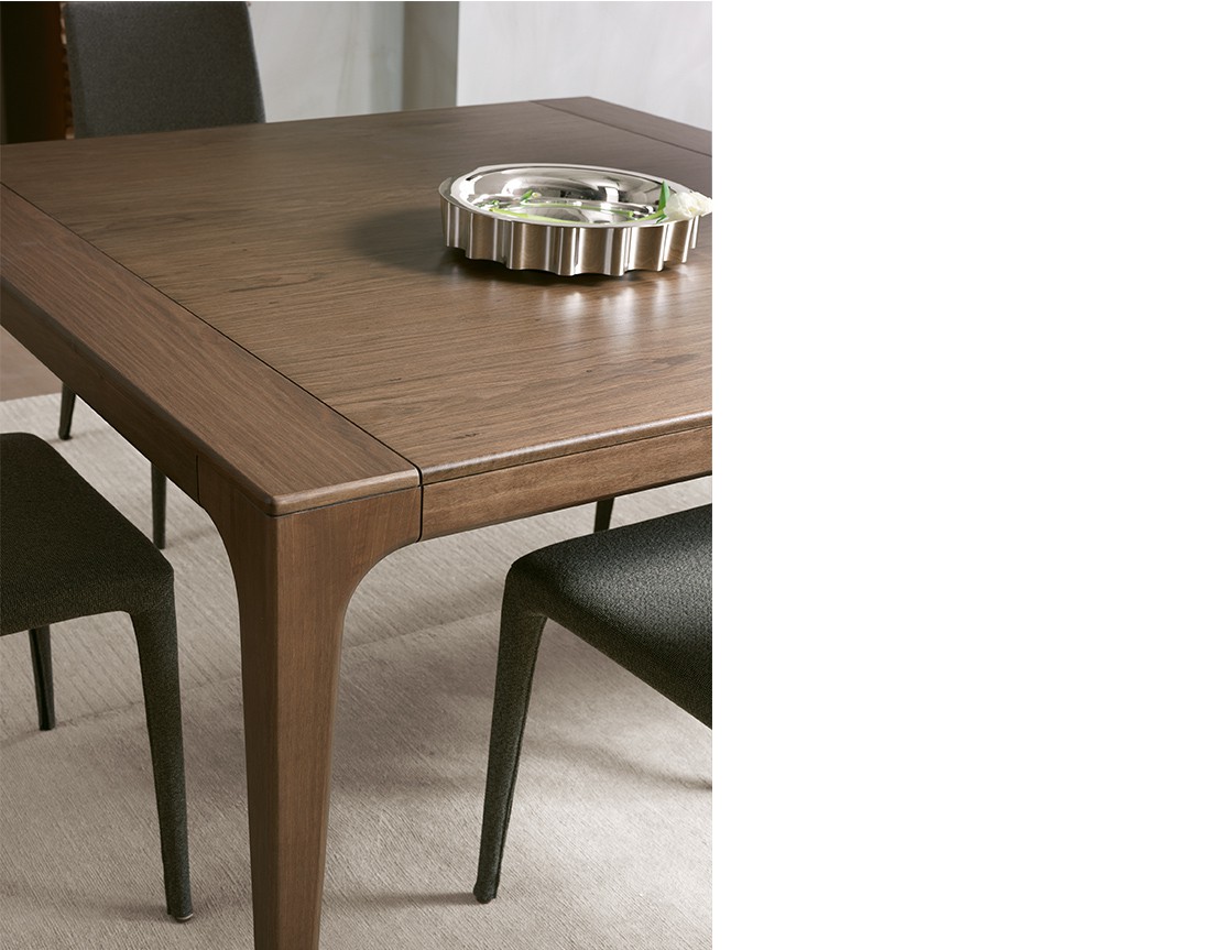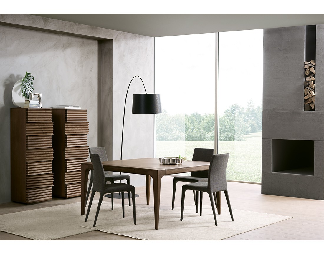 Fashion è un tavolo da pranzo con struttura in massello di frassino e piano placcato frassino. Nella versione allungabile meccanismo telescopico in alluminio con prolunghe interne placcate frassino. Finiture disponibili: WG wengé, TN tinto nero, NC noce, TB tabacco, laccato opaco poro aperto ( L21 bianco, L29 madreperla, L23 cappuccino, L25 grigio fumo, L22 nero, L24 rosso ).
