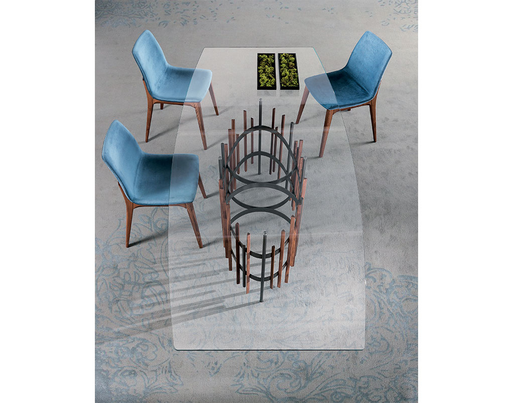 Il tavolo ha una base in metallo verniciato color titanio con inserti in massello di noce canaletto o frassino. Piano in vetro temperato naturale o bronzato trasparente con piastre elettrosaldate (10 o 12 mm).