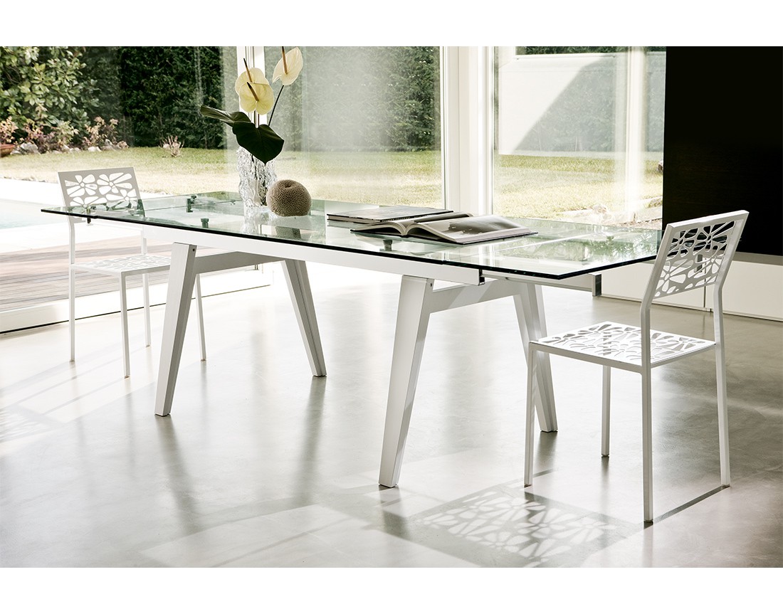 Tavolo da pranzo con struttura in massello di frassino. Piano allungabile in vetro naturale temperato (sp. 10 o 12 mm). Meccanismo di apertura in alluminio brillantato o verniciato bianco. Finiture disponibili: FN frassino naturale, CL ciliegio americano, WG wengé, NC noce, TB tabacco, laccato opaco poro aperto( L21 bianco, L29 madreperla, L23 cappuccino, L25 grigio fumo, L22 nero, L24 rosso ).