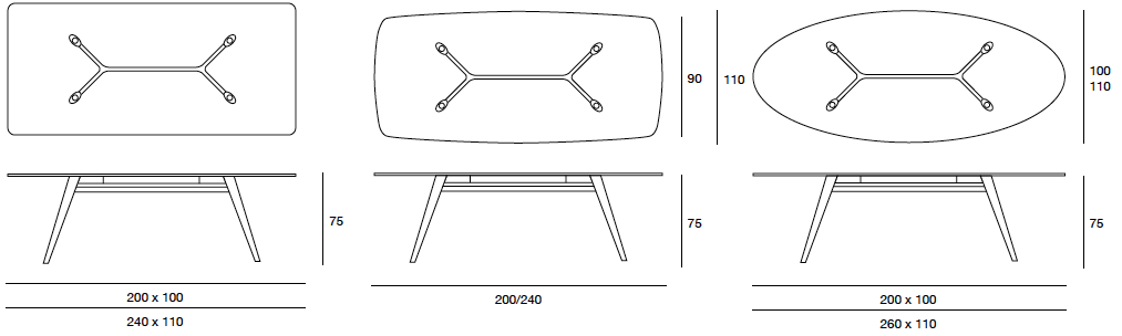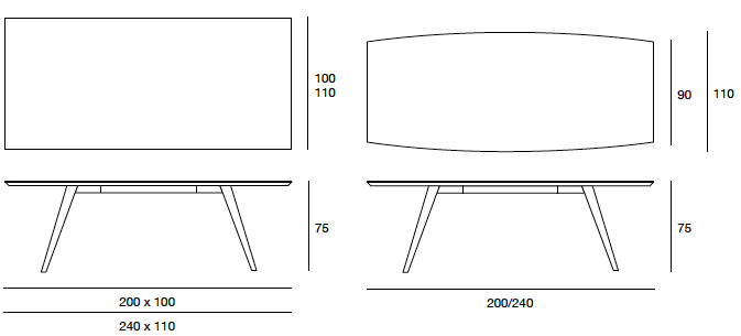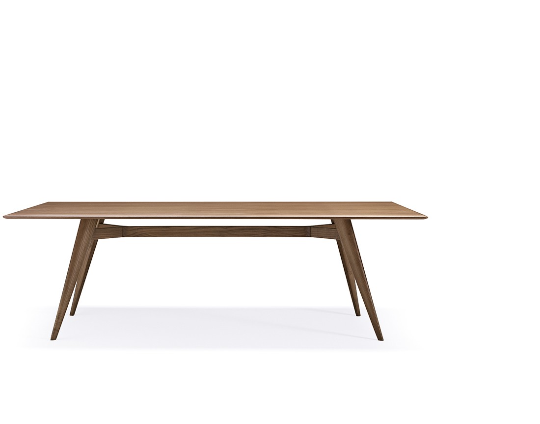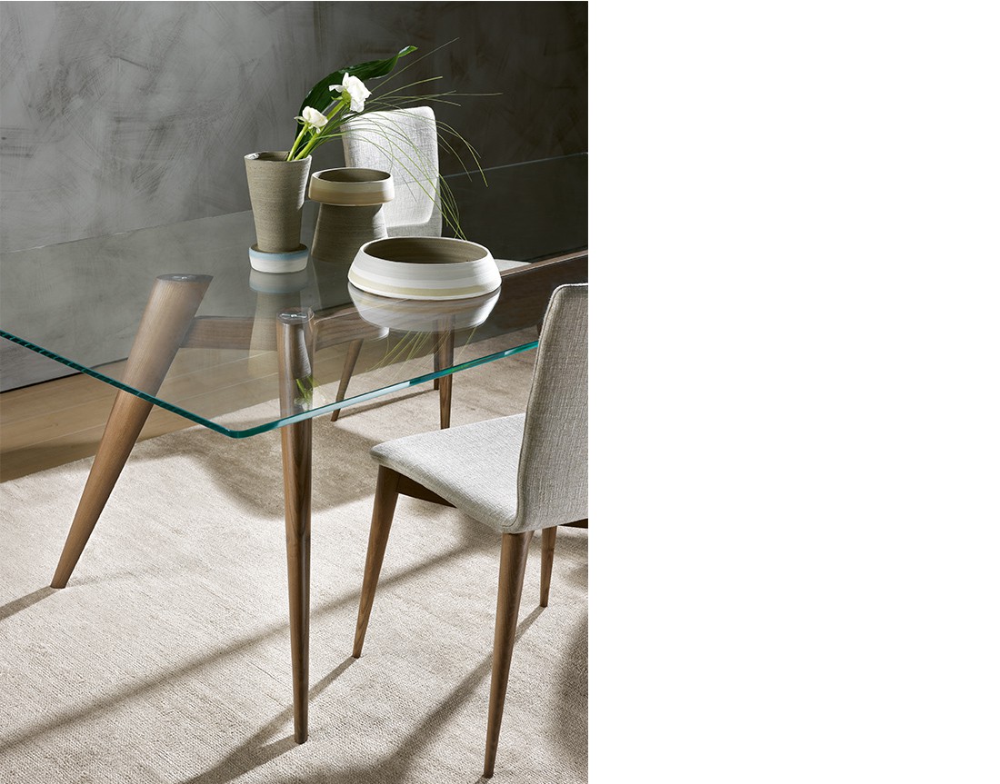 Tavolo da pranzo Novecernto con gambe in massello di frassino. Piano in legno placcato frassino o in vetro naturale temperato (sp. 10 o 12 mm) con piastre elettrosaldate.